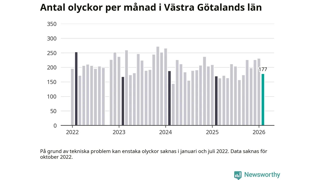 Under februari 2026 rapporterades 177 trafikolyckor längs eller i anslutning till de stora, statliga vägarna i Västra Götaland. Nerbrutet per kommun rapporterades flest olyckor, 28 stycken, längs E6 genom Göteborgs kommun. Det är samma mönster som under tidigare månader de senaste åren.