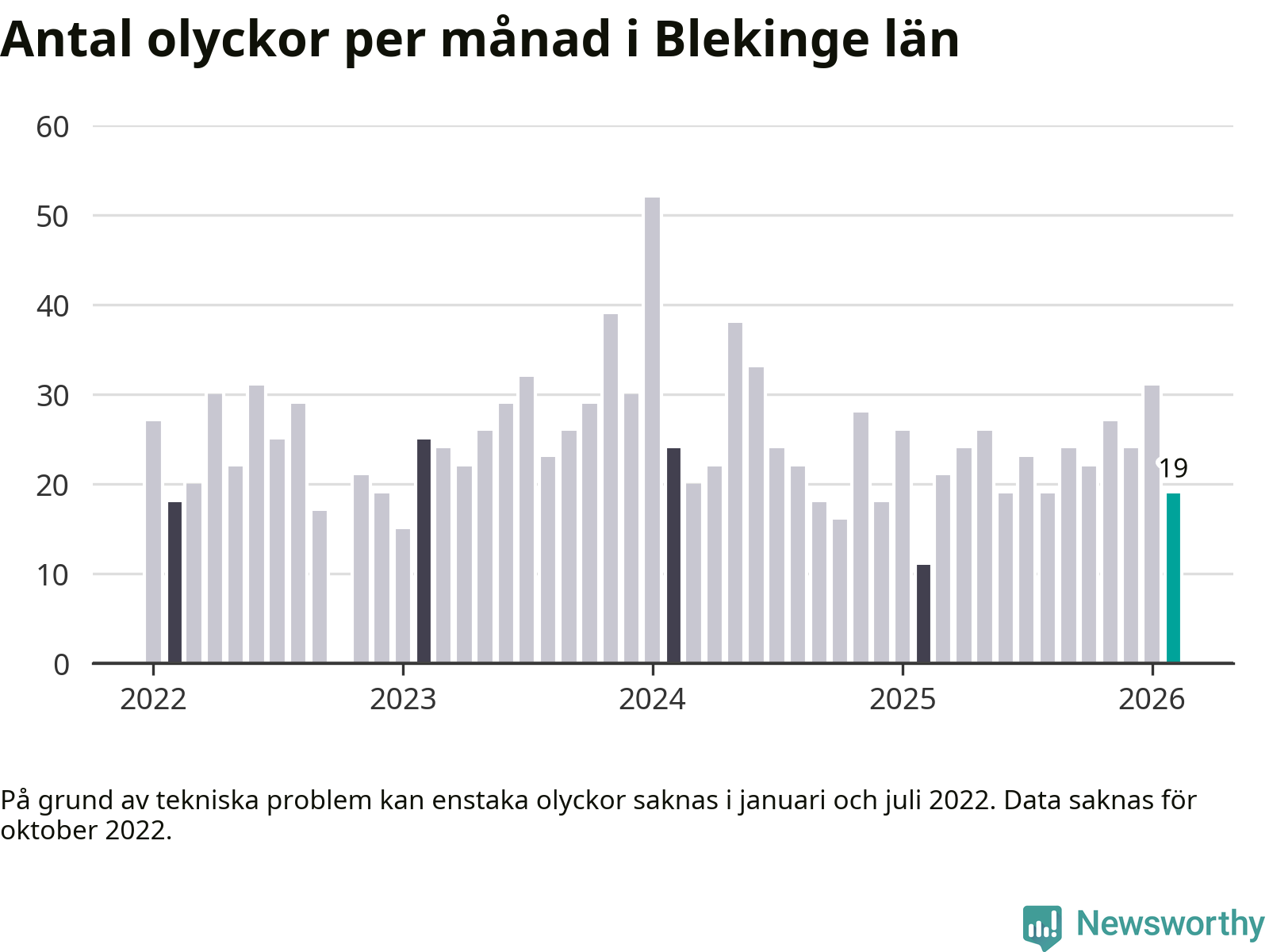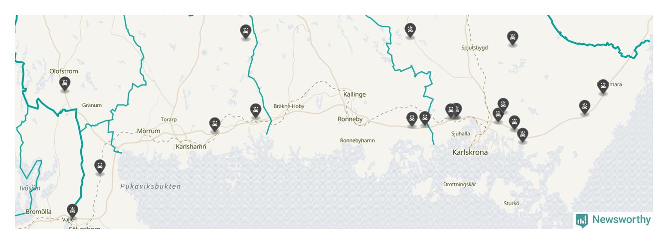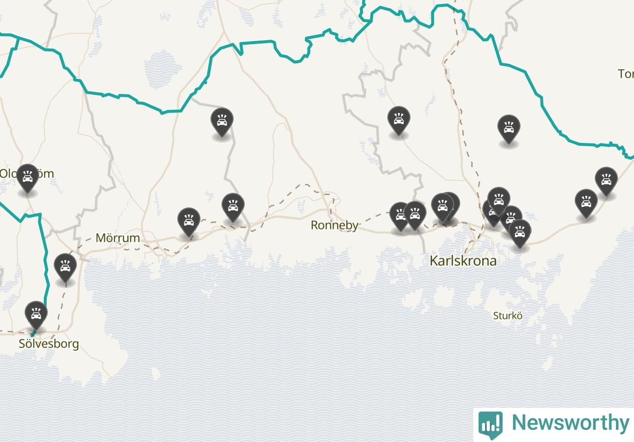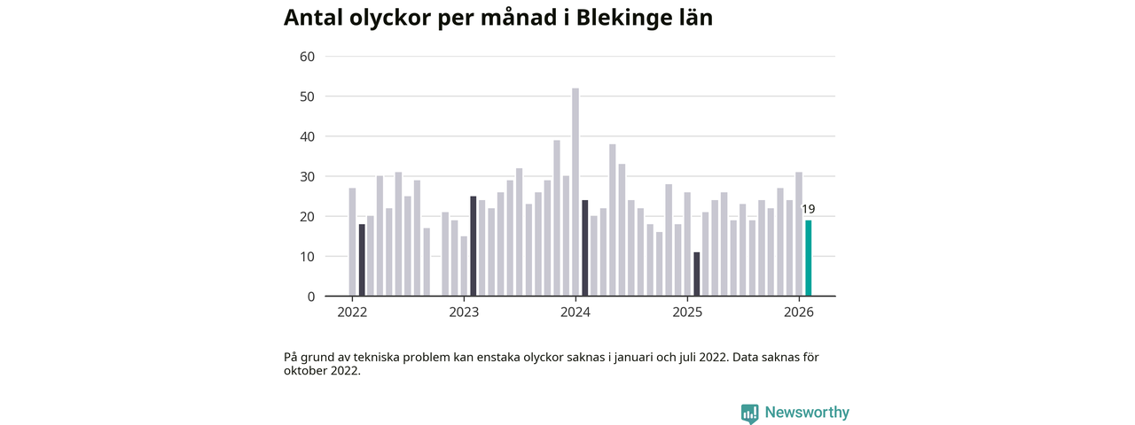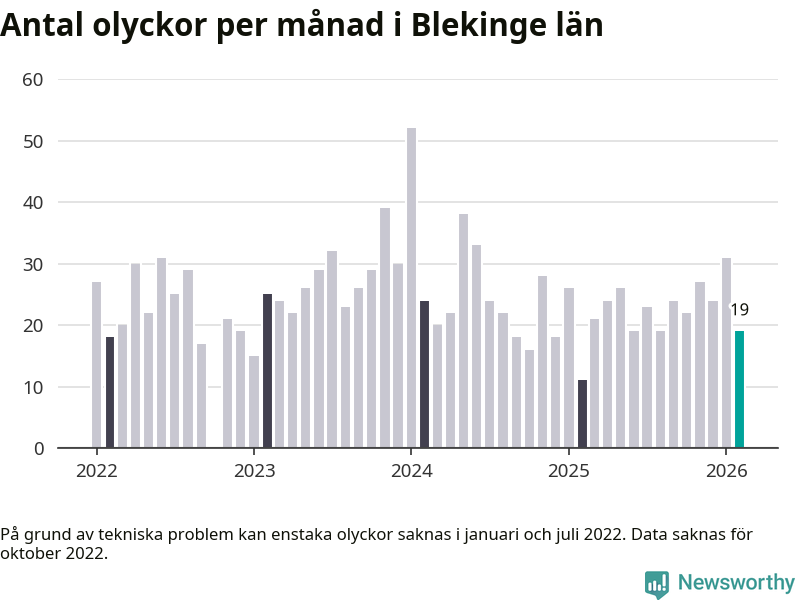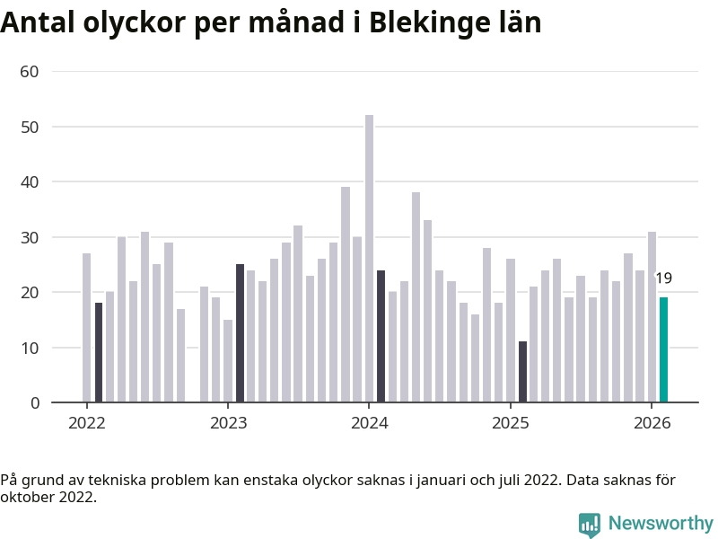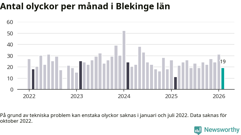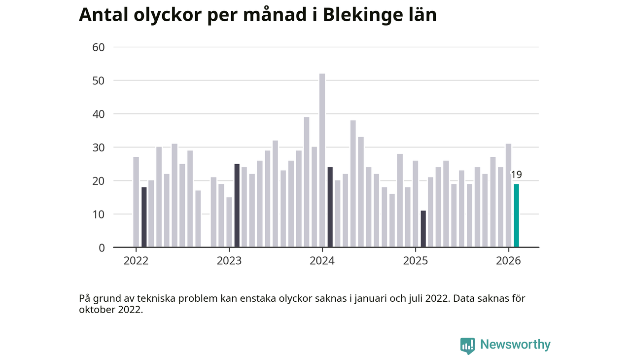 I Blekinge län var trafikolyckorna färre än genomsnittligt i februari: 19 olyckor längs de stora vägarna i länet. Det visar data från Trafikverket som Newsworthy sammanställt.