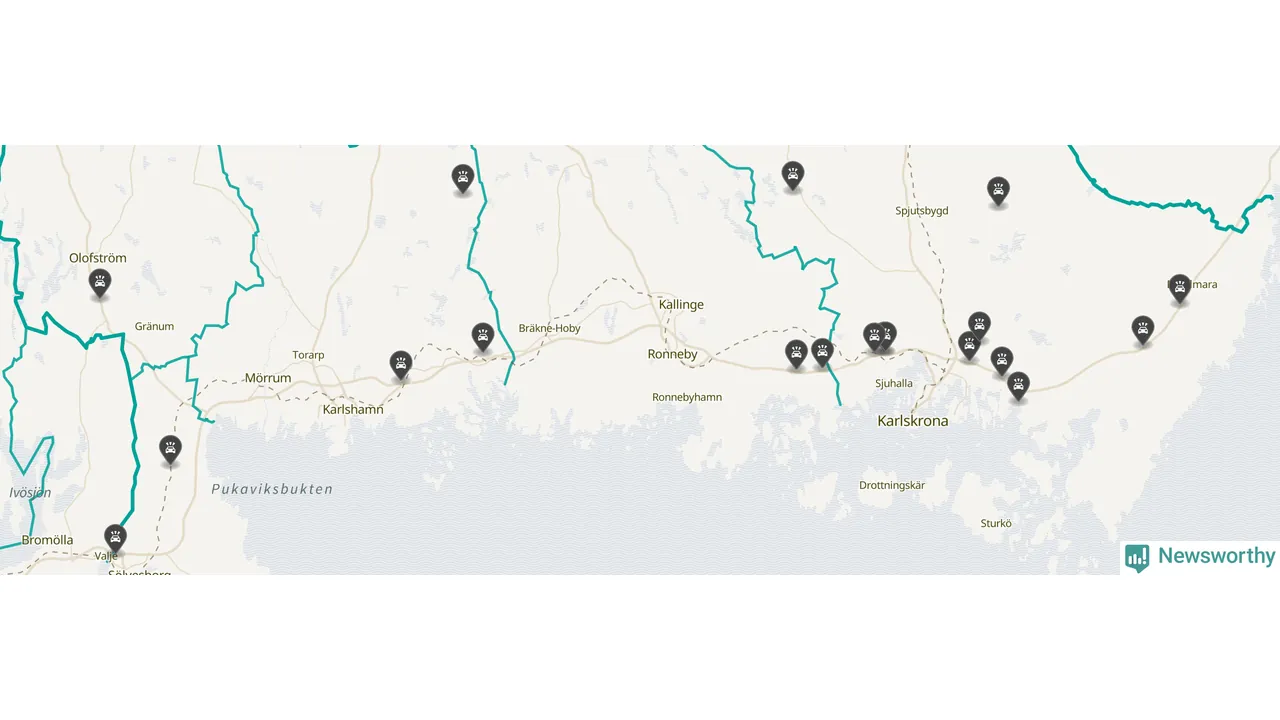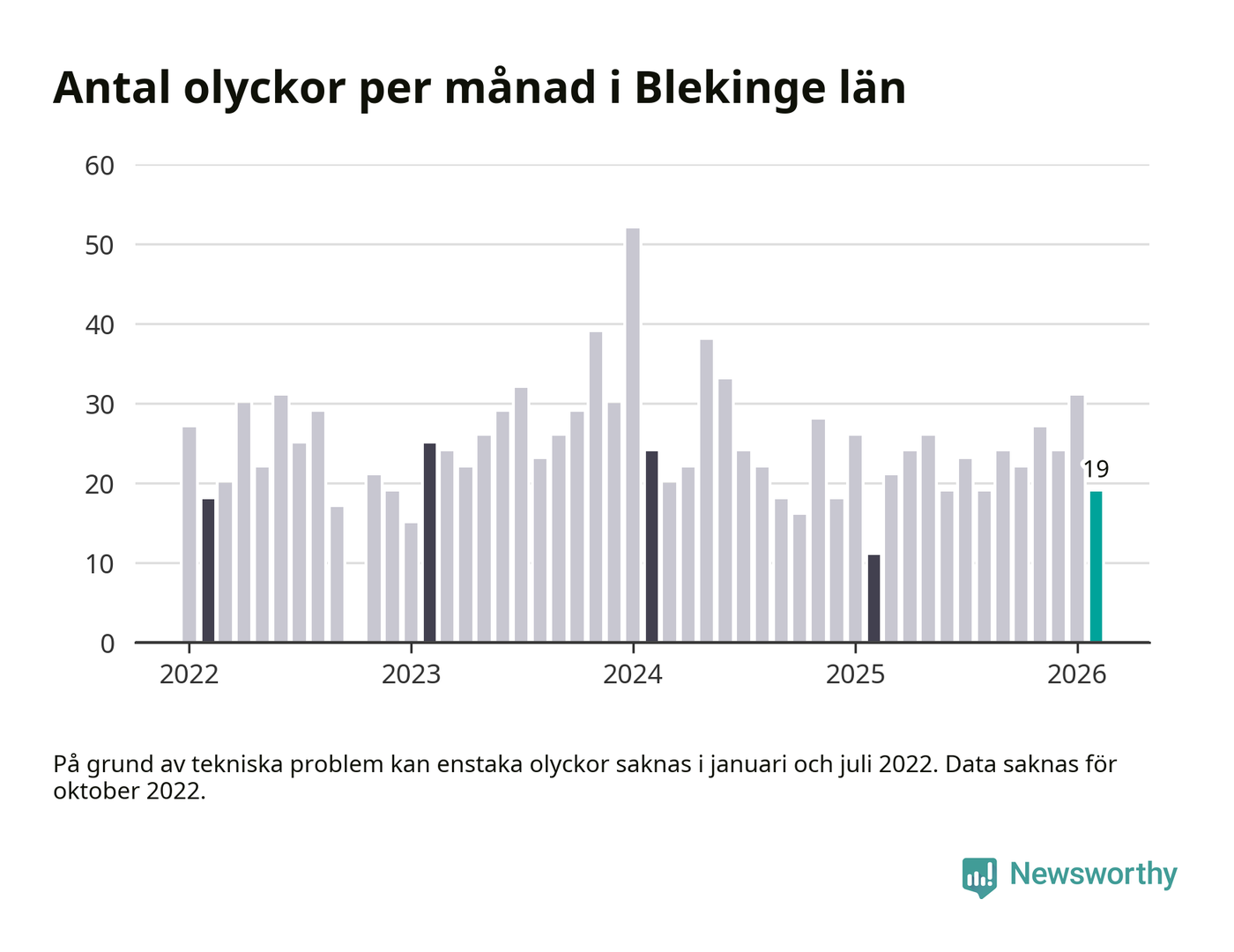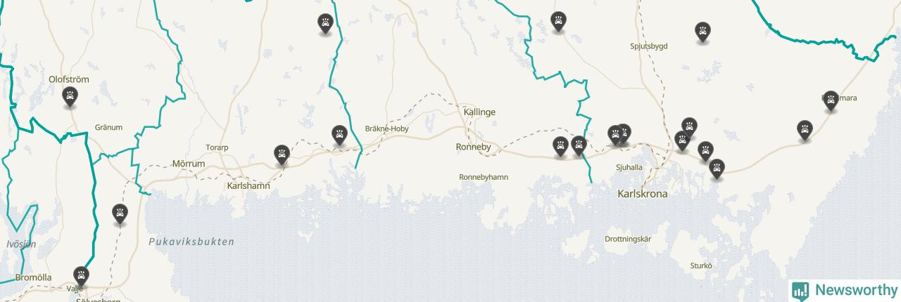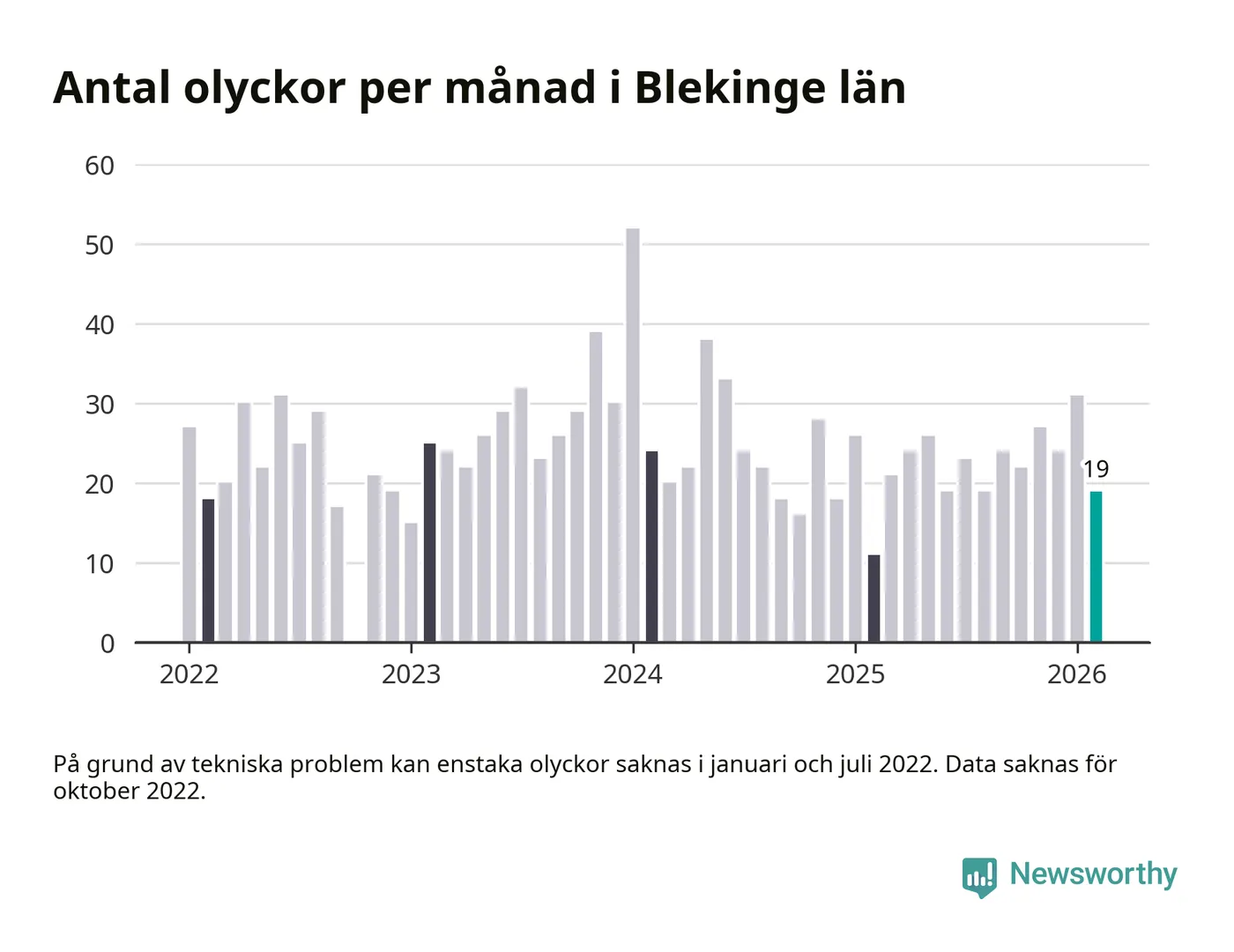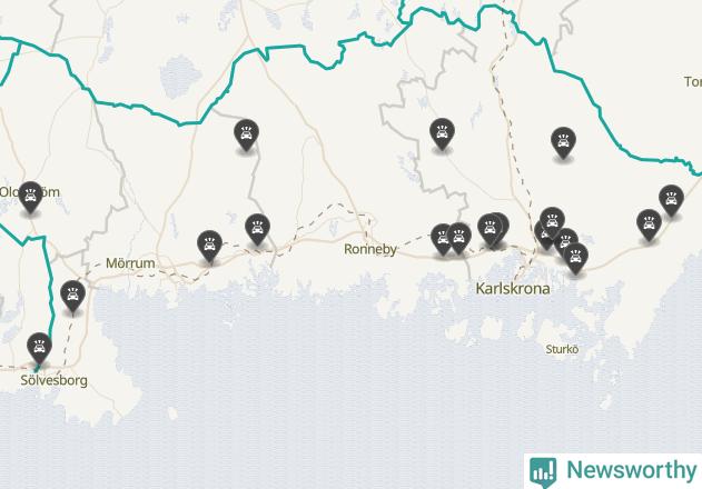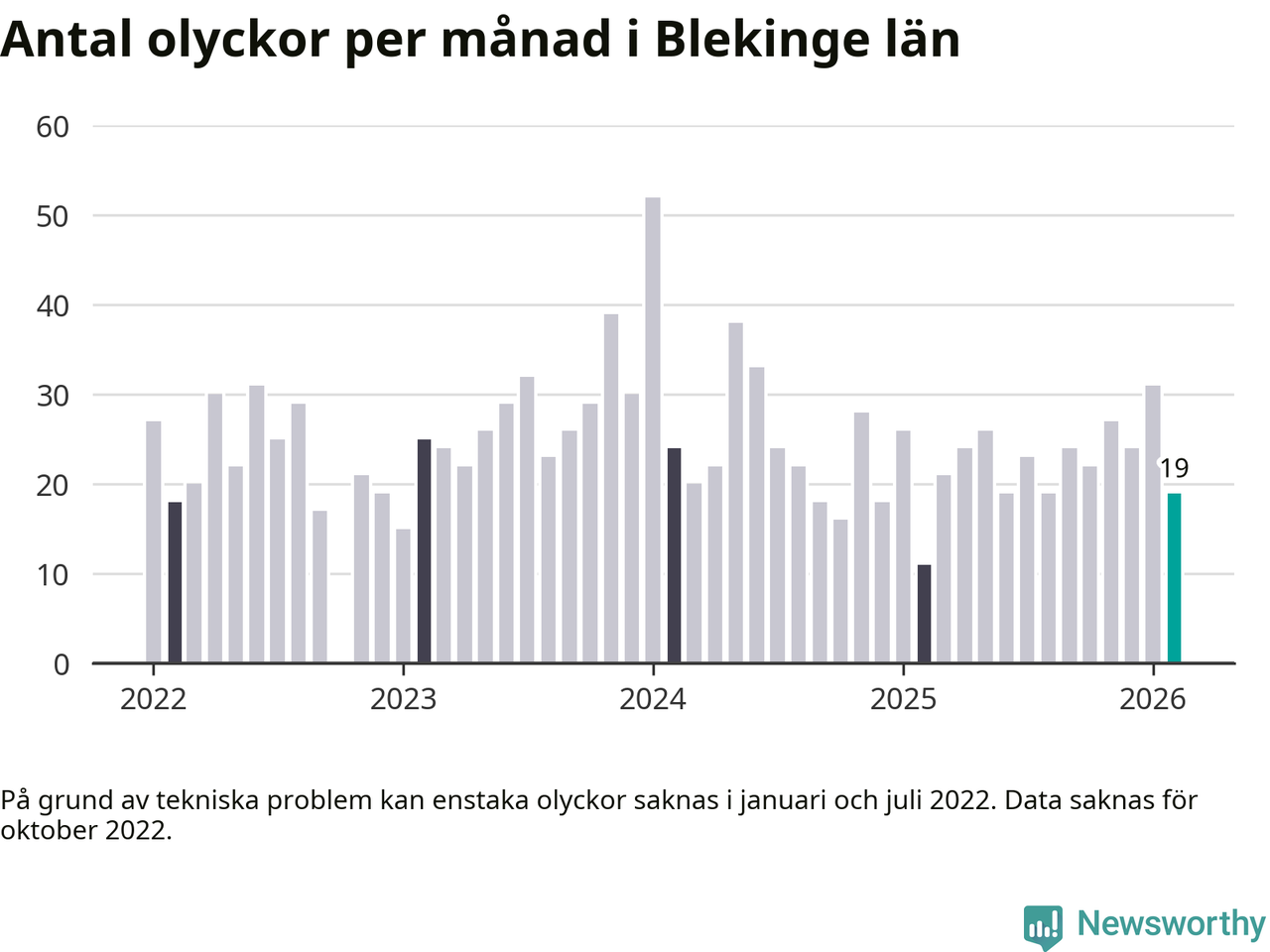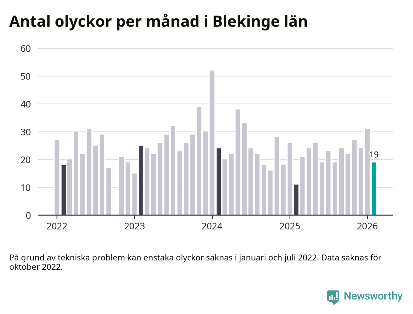 I Blekinge län var trafikolyckorna färre än genomsnittligt i februari: 19 olyckor längs de stora vägarna i länet. Det visar data från Trafikverket som Newsworthy sammanställt.