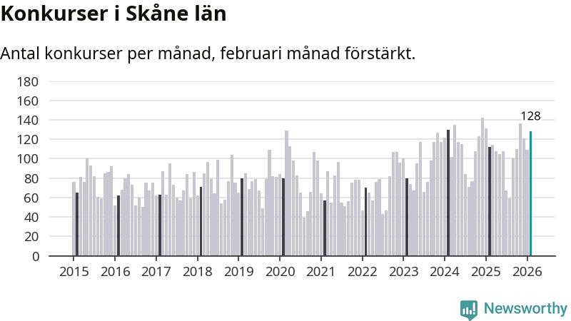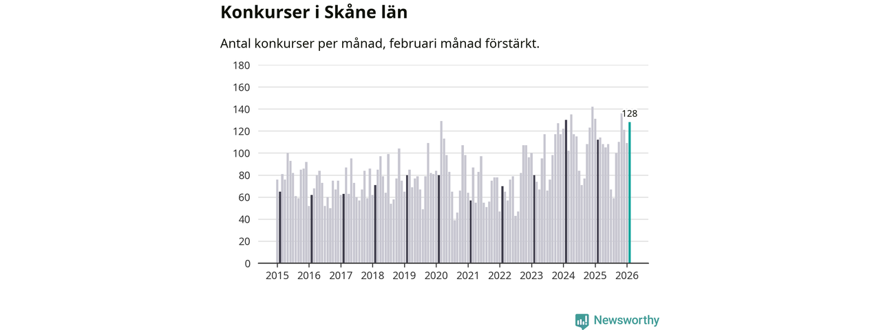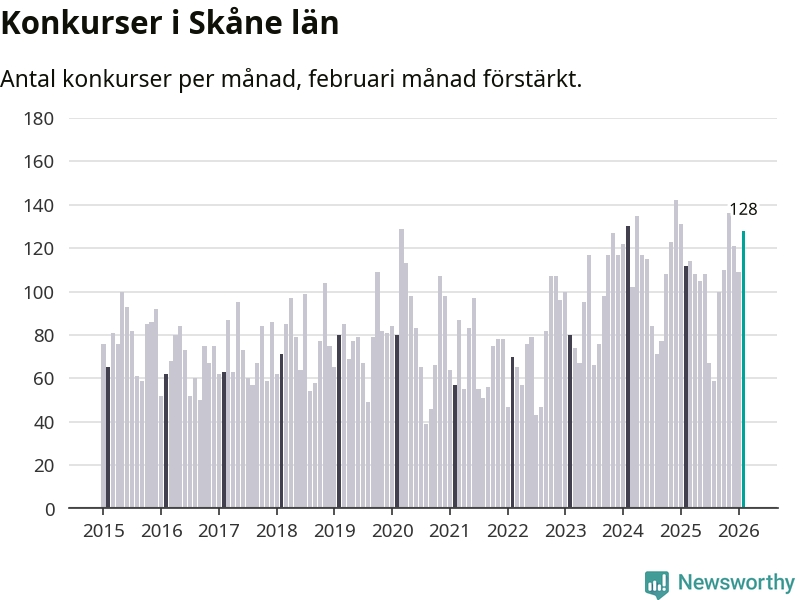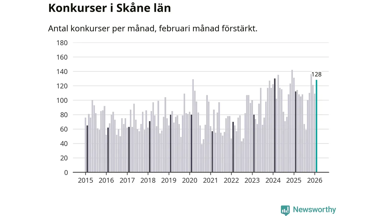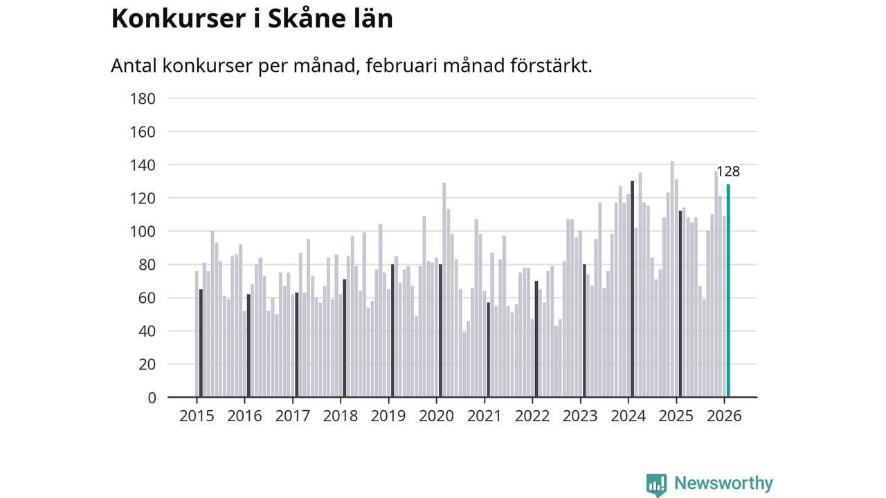 Under februari månad gick 128 bolag med säte i Skåne i konkurs. Det är fler än normalt för den här tiden på året sett till de senaste elva åren. I fjol noterades 112 konkurser under februari.
