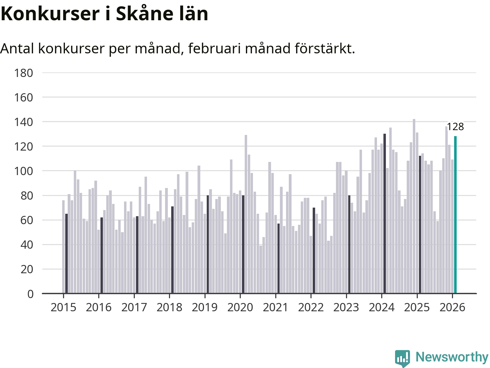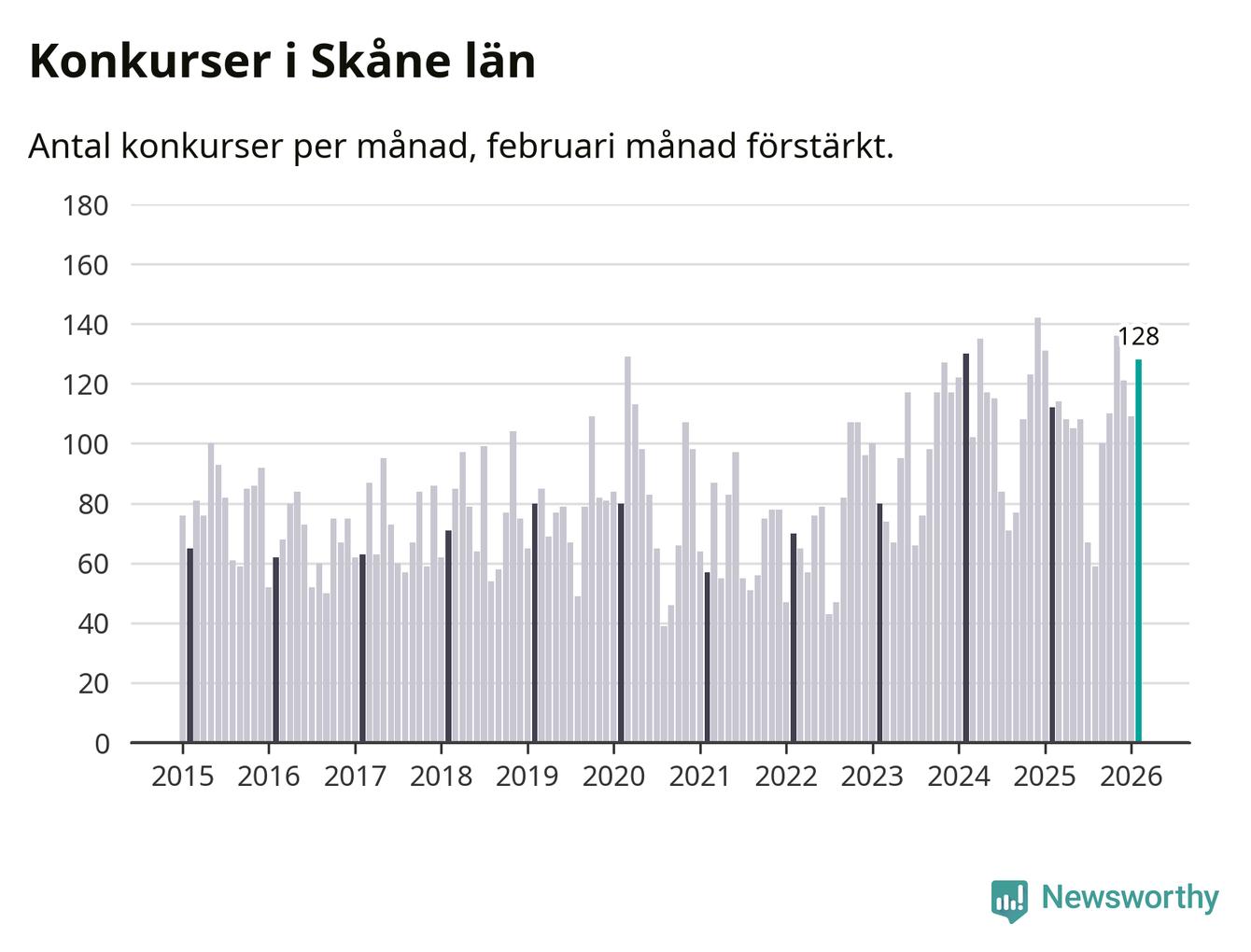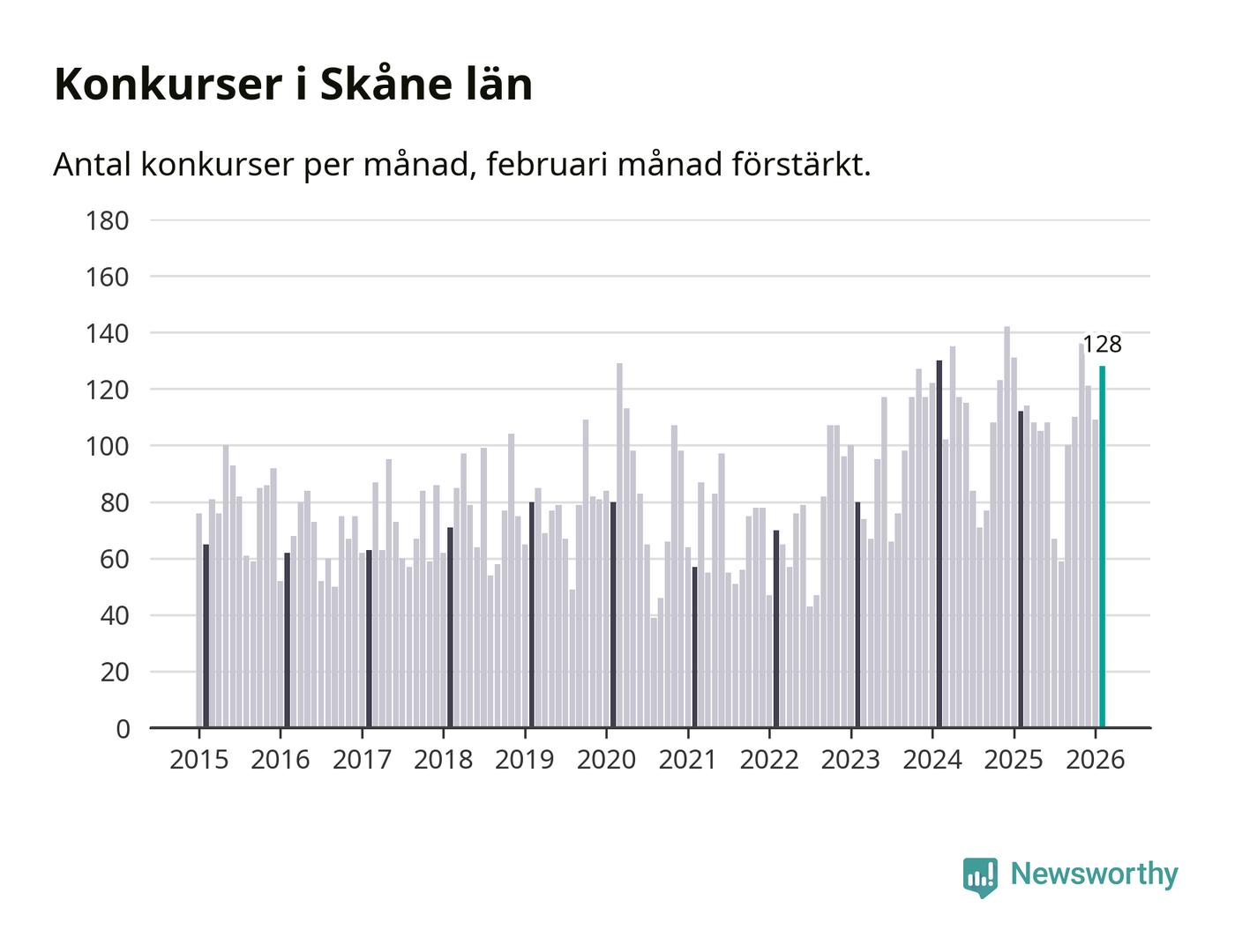 Under februari månad gick 128 bolag med säte i Skåne i konkurs. Det är fler än normalt för den här tiden på året sett till de senaste elva åren. I fjol noterades 112 konkurser under februari.