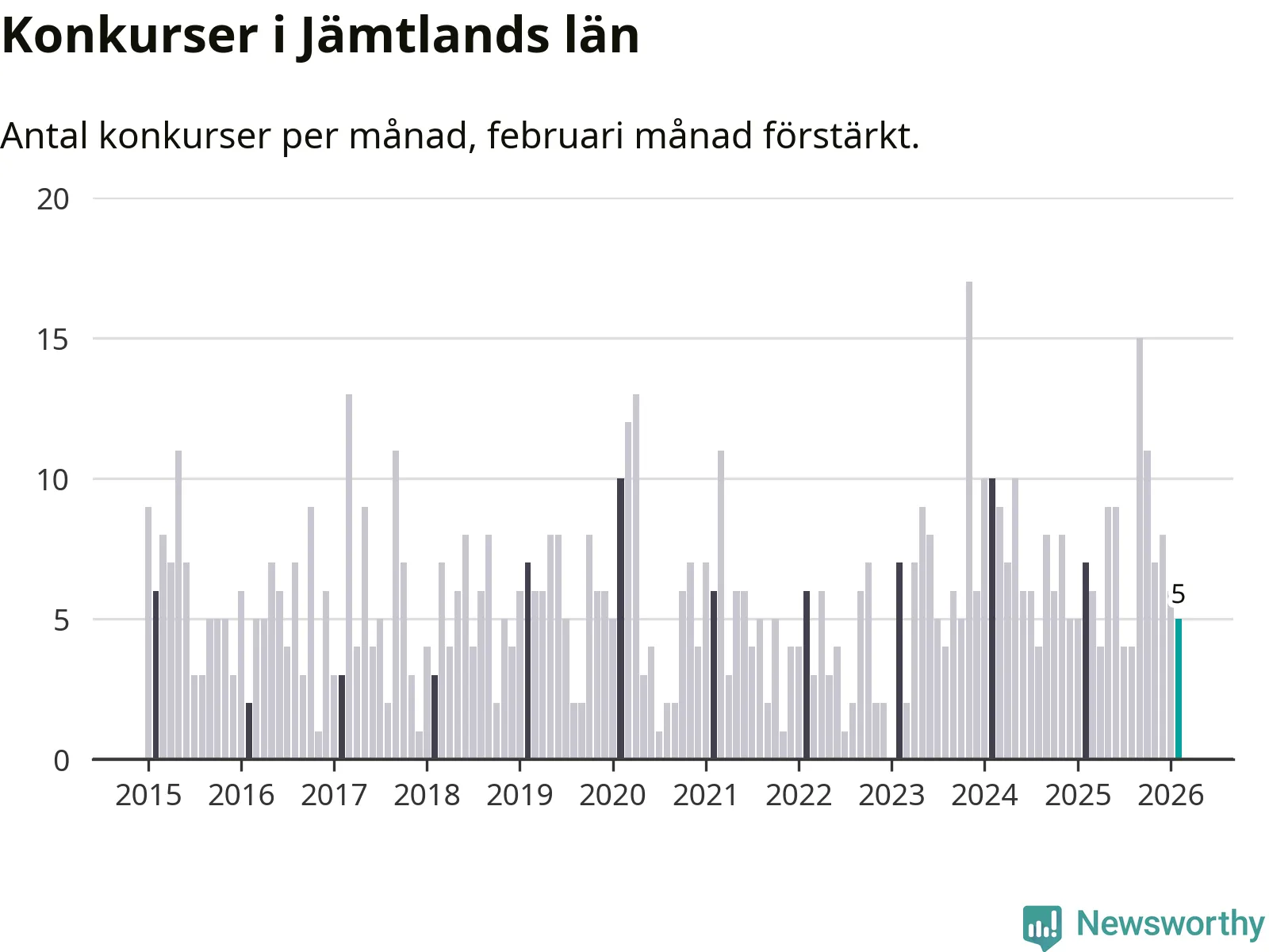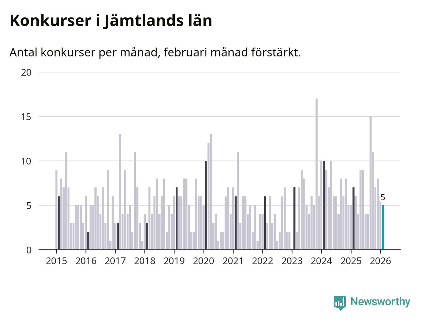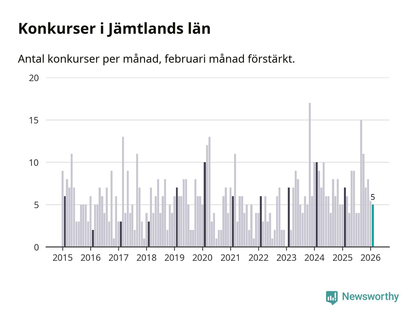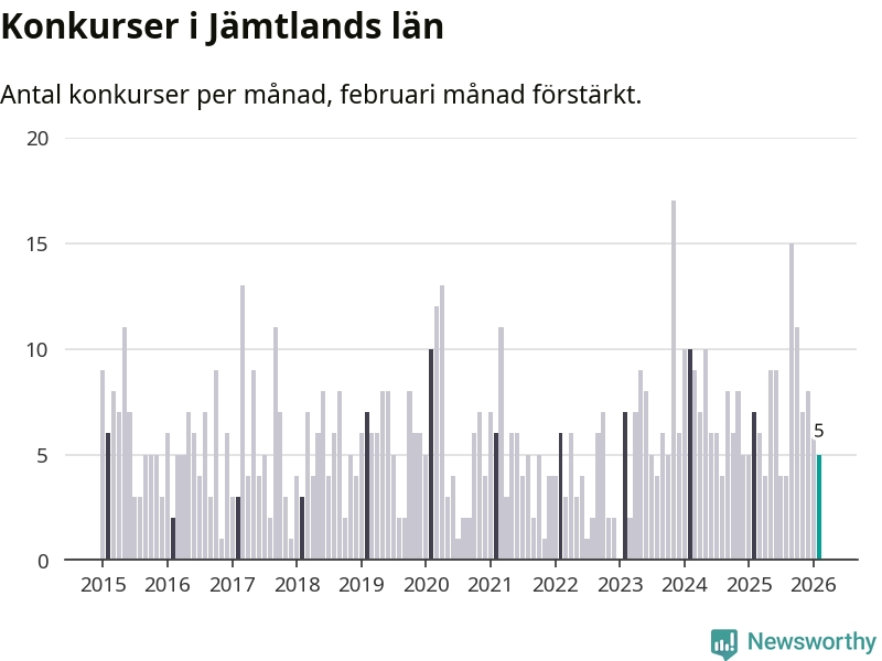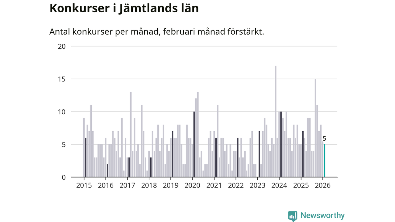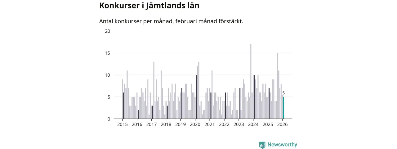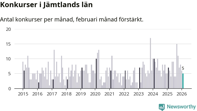 Under februari månad gick fem bolag med säte i Jämtland i konkurs. I fjol noterades sju konkurser under februari.