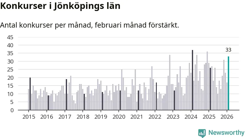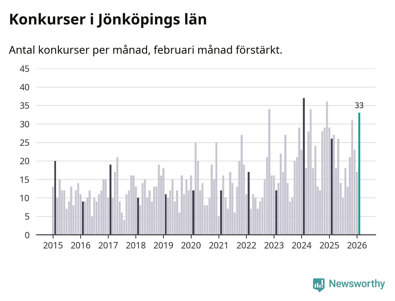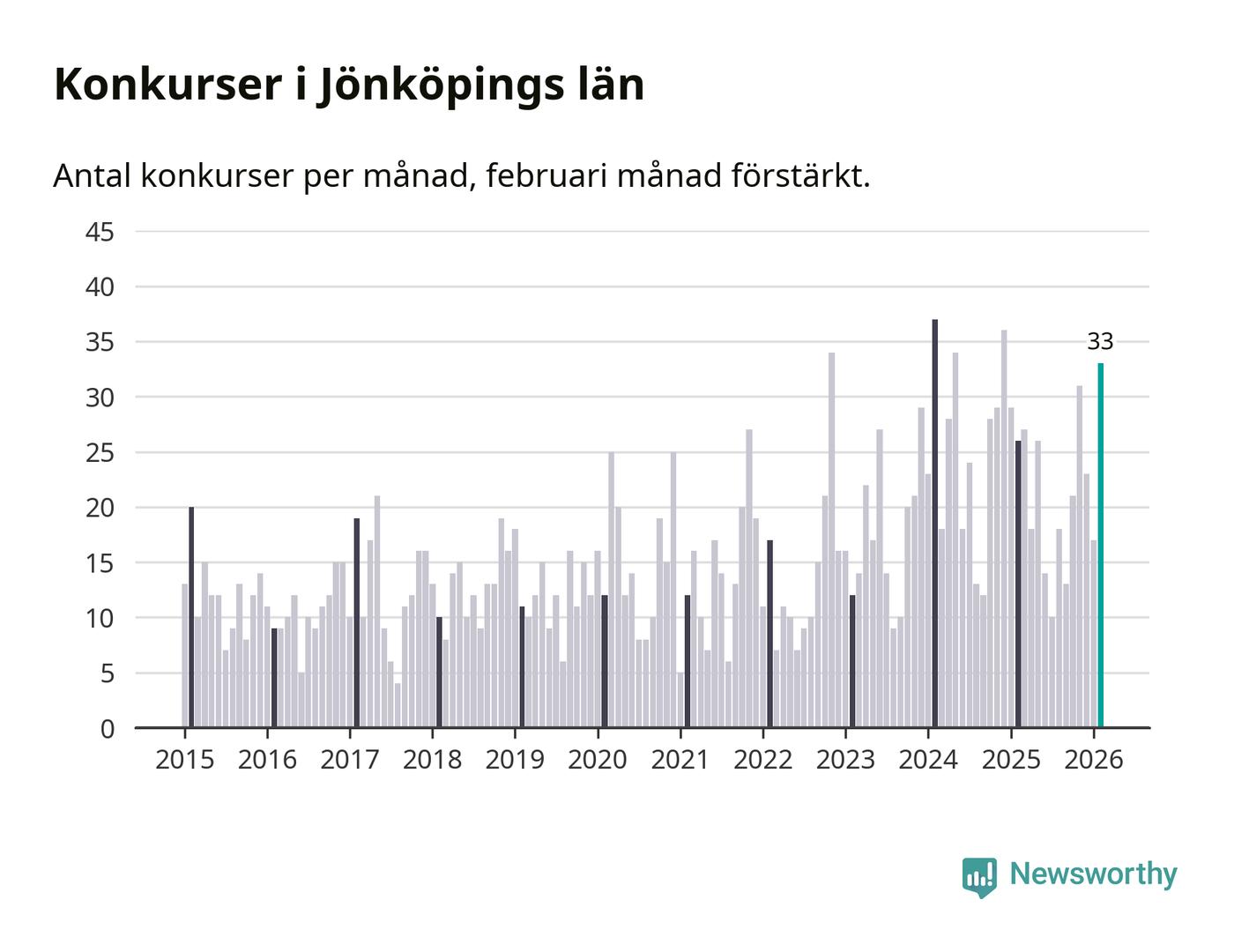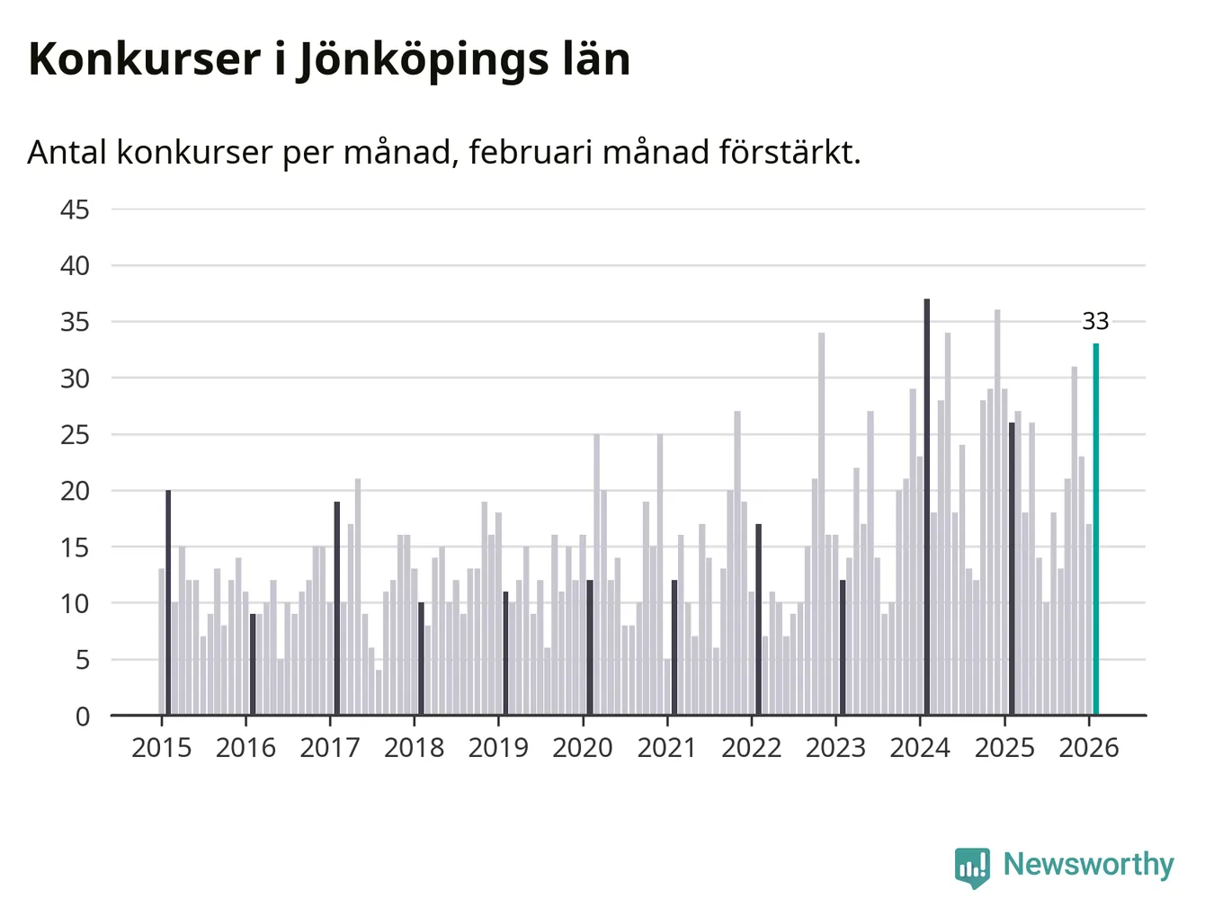 Under februari månad gick 33 bolag med säte i Jönköpings län i konkurs. Det är fler än normalt för den här tiden på året sett till de senaste elva åren. I fjol noterades 26 konkurser under februari.