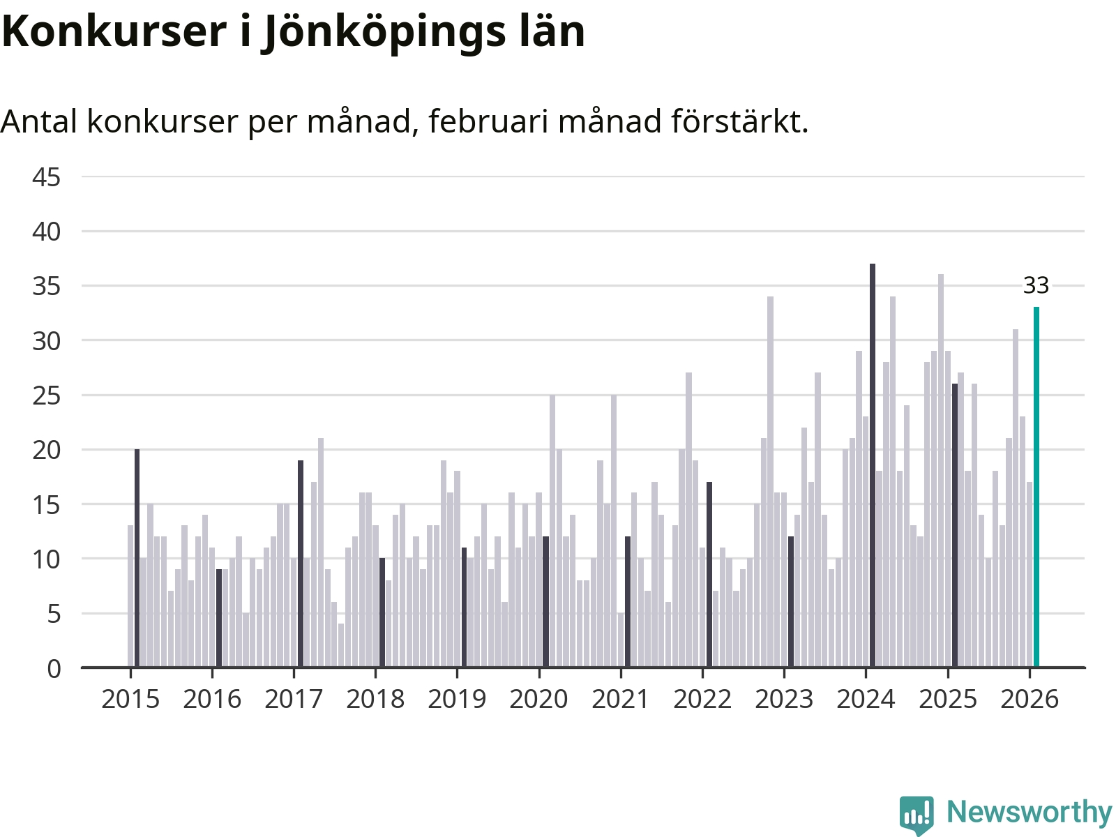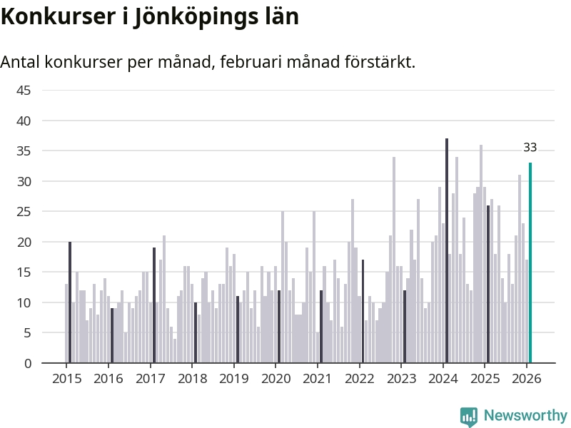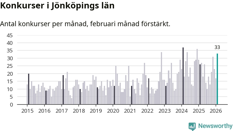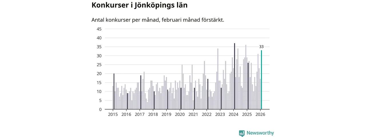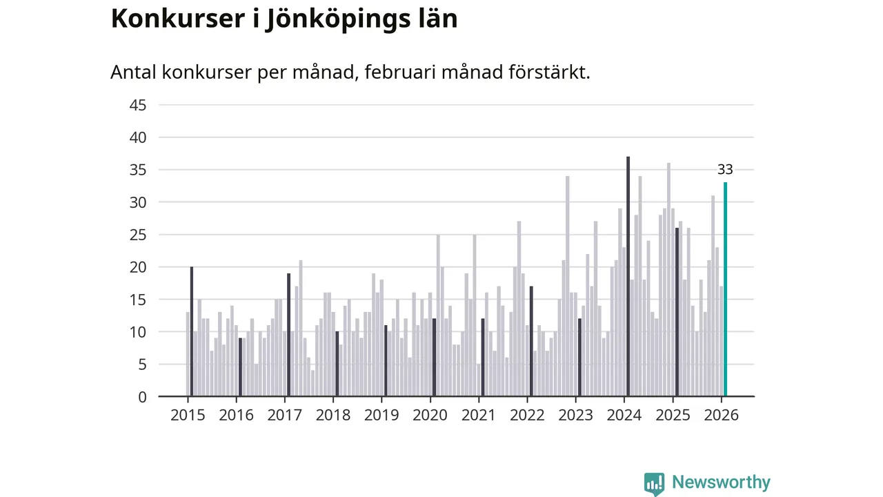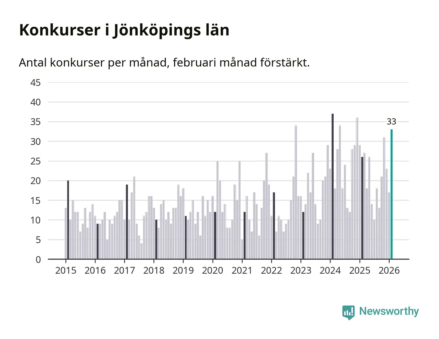 Under februari månad gick 33 bolag med säte i Jönköpings län i konkurs. Det är fler än normalt för den här tiden på året sett till de senaste elva åren. I fjol noterades 26 konkurser under februari.