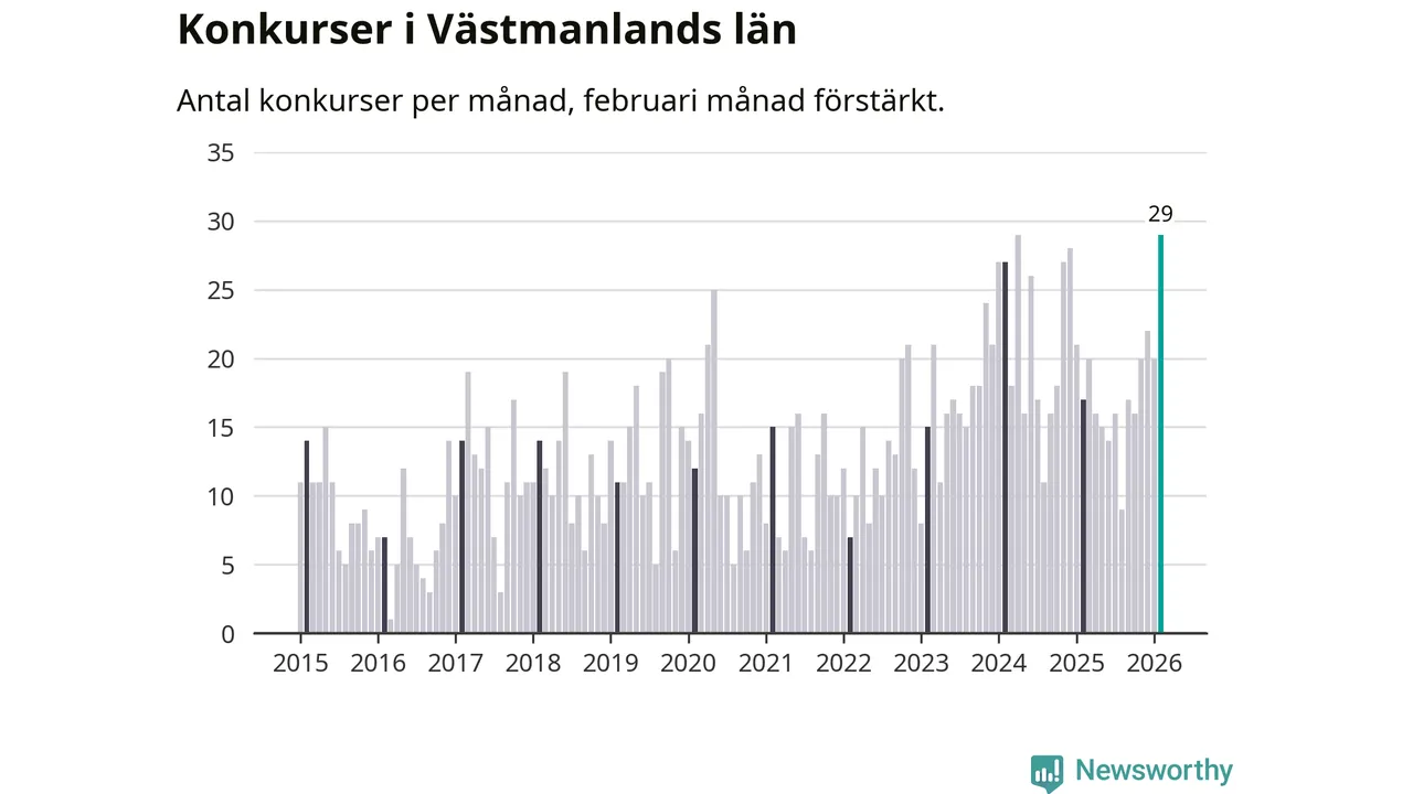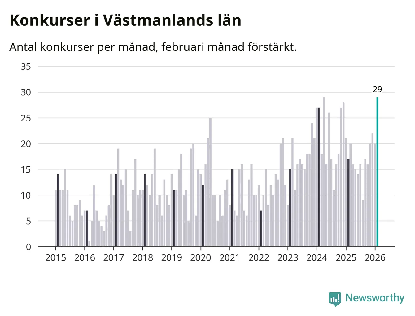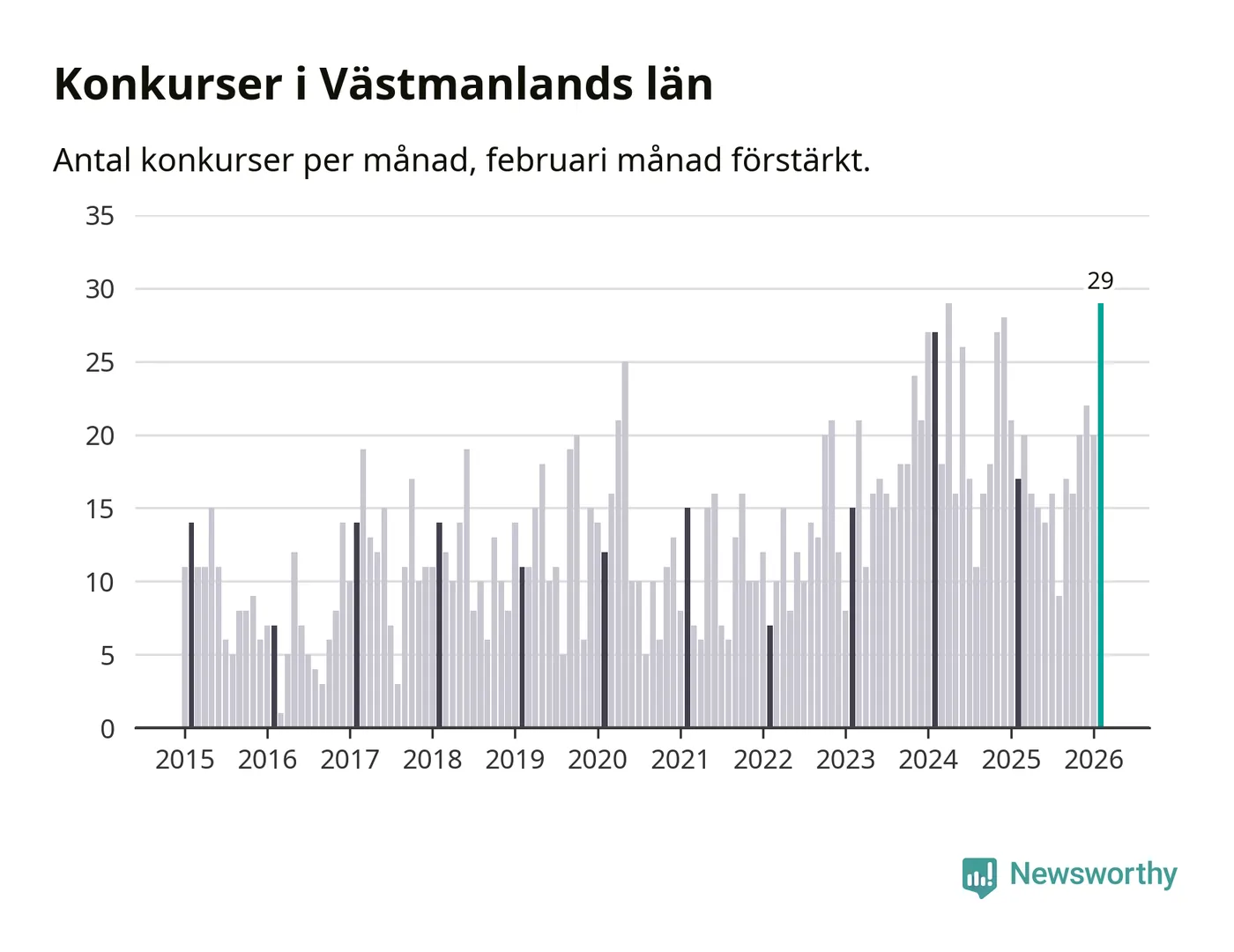 Under februari månad gick 29 bolag med säte i Västmanland i konkurs. Det är fler än normalt för den här tiden på året sett till de senaste elva åren. I fjol noterades 17 konkurser under februari.