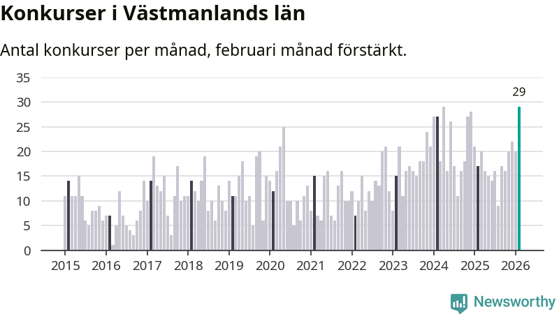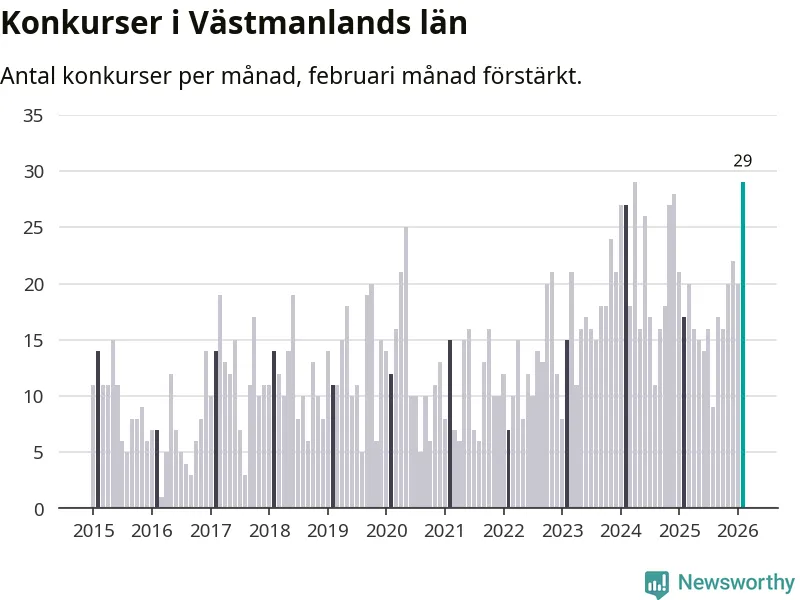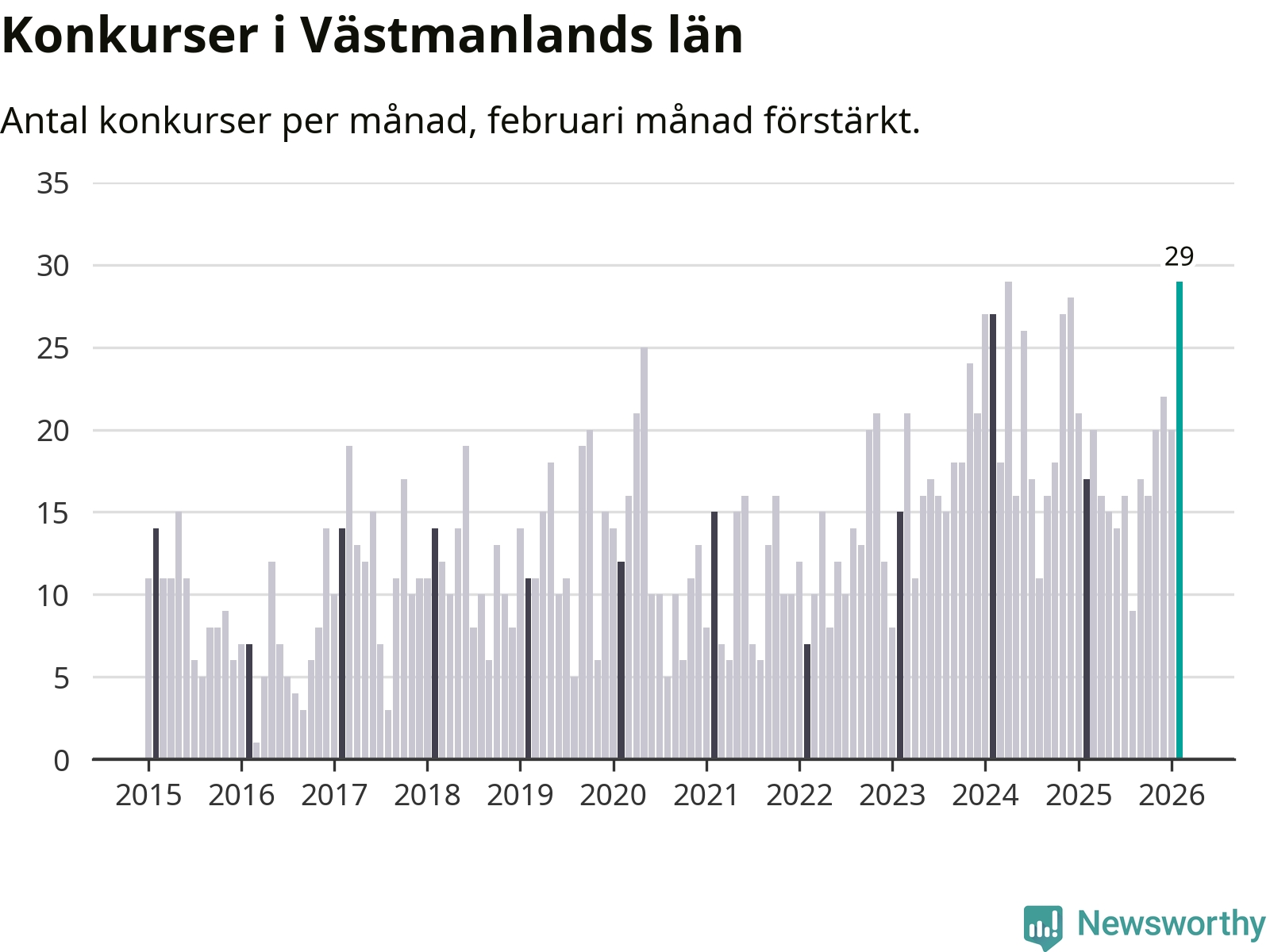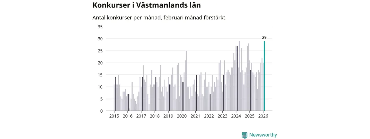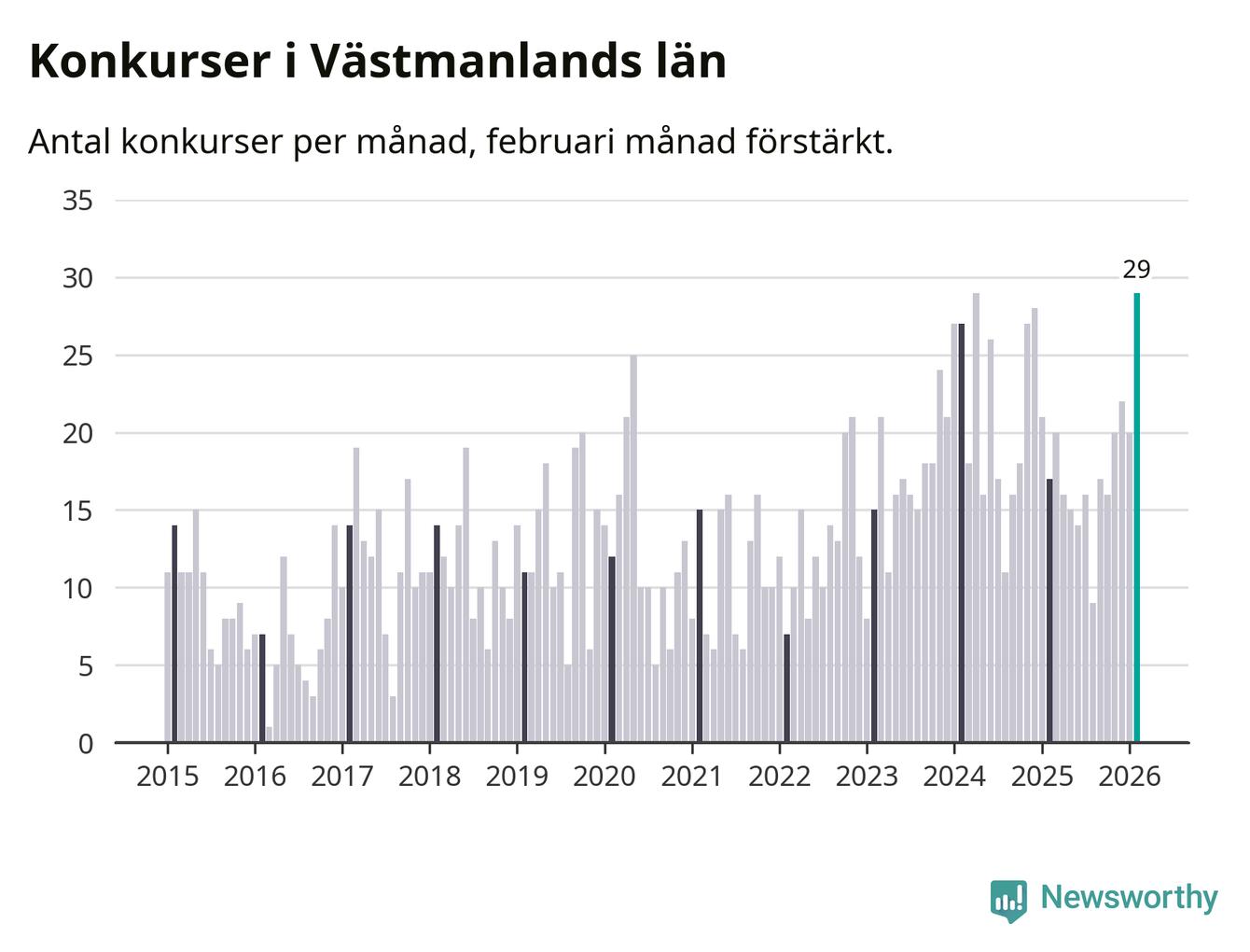 Under februari månad gick 29 bolag med säte i Västmanland i konkurs. Det är fler än normalt för den här tiden på året sett till de senaste elva åren. I fjol noterades 17 konkurser under februari.