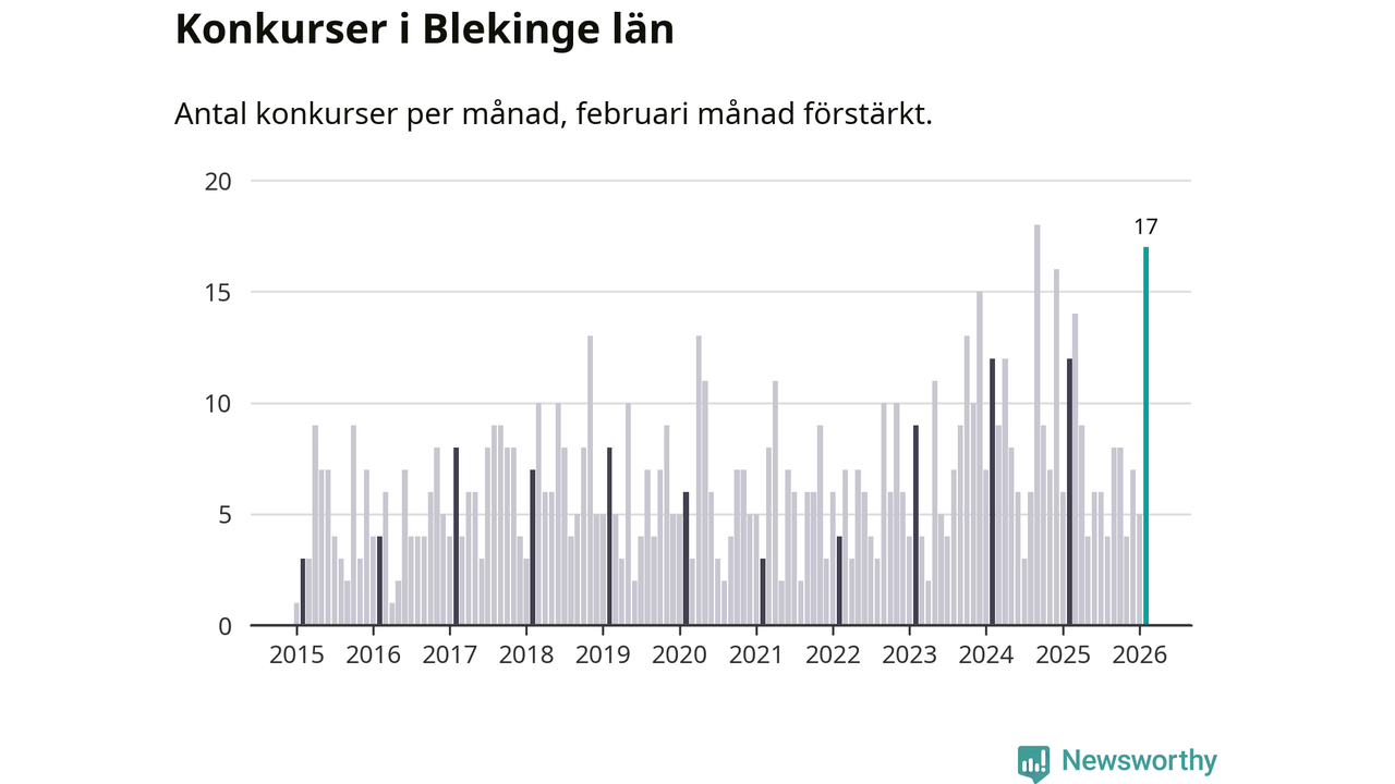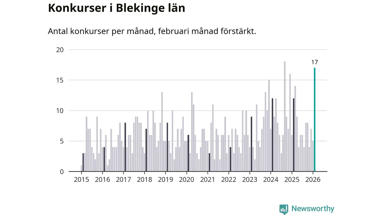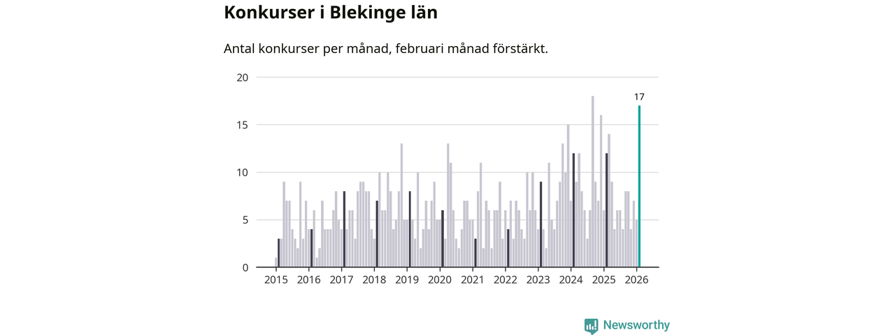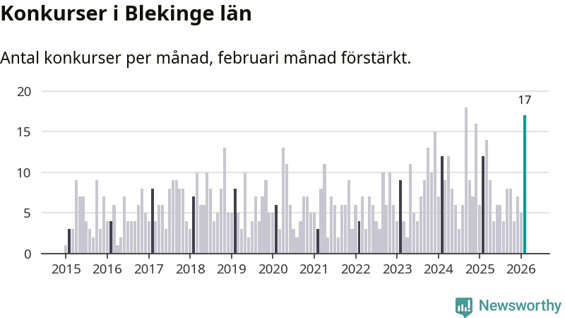 Under februari månad gick 17 bolag med säte i Blekinge i konkurs. Det är fler än normalt för den här tiden på året sett till de senaste elva åren. I fjol noterades tolv konkurser under februari.