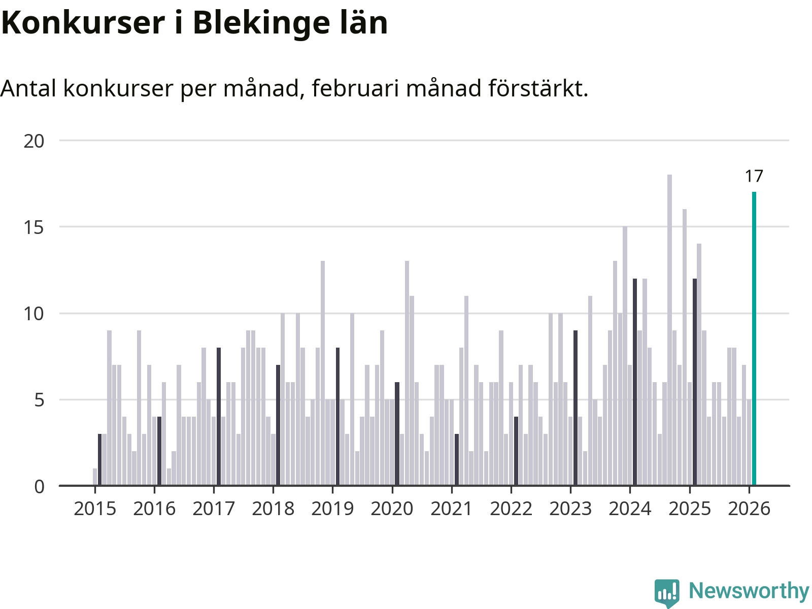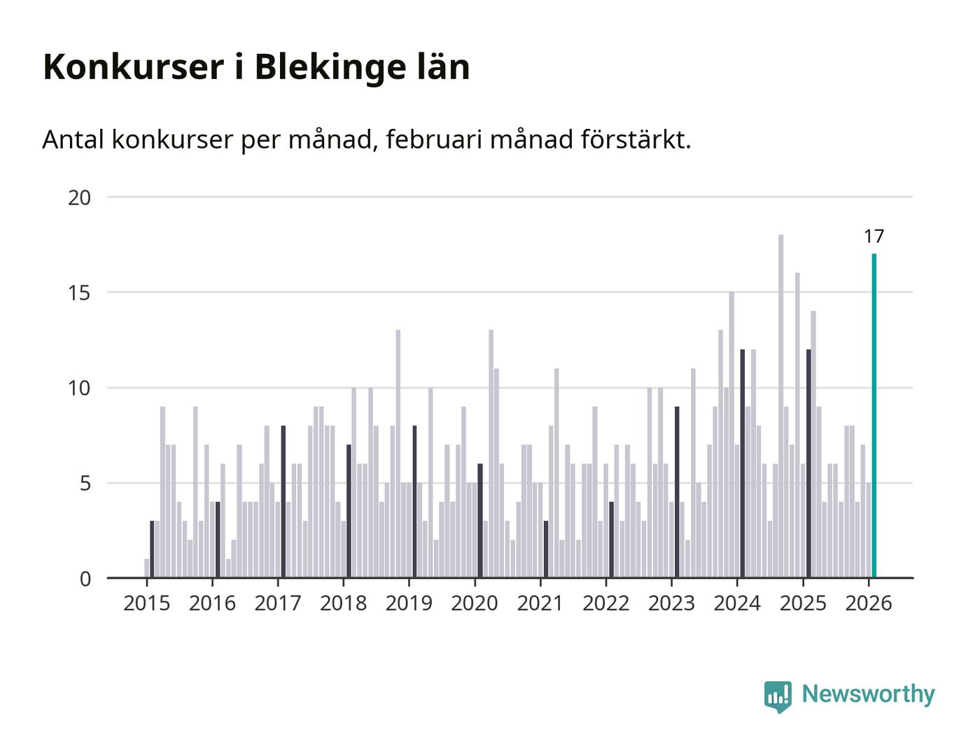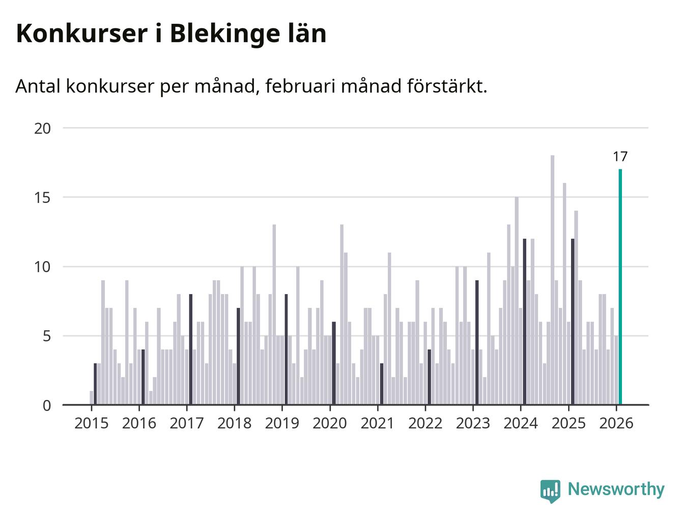 Under februari månad gick 17 bolag med säte i Blekinge i konkurs. Det är fler än normalt för den här tiden på året sett till de senaste elva åren. I fjol noterades tolv konkurser under februari.