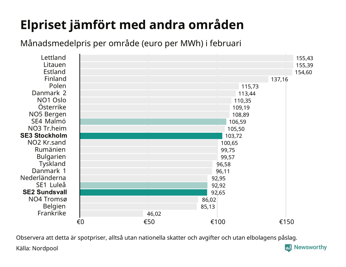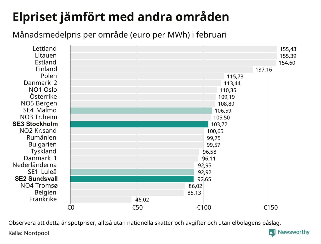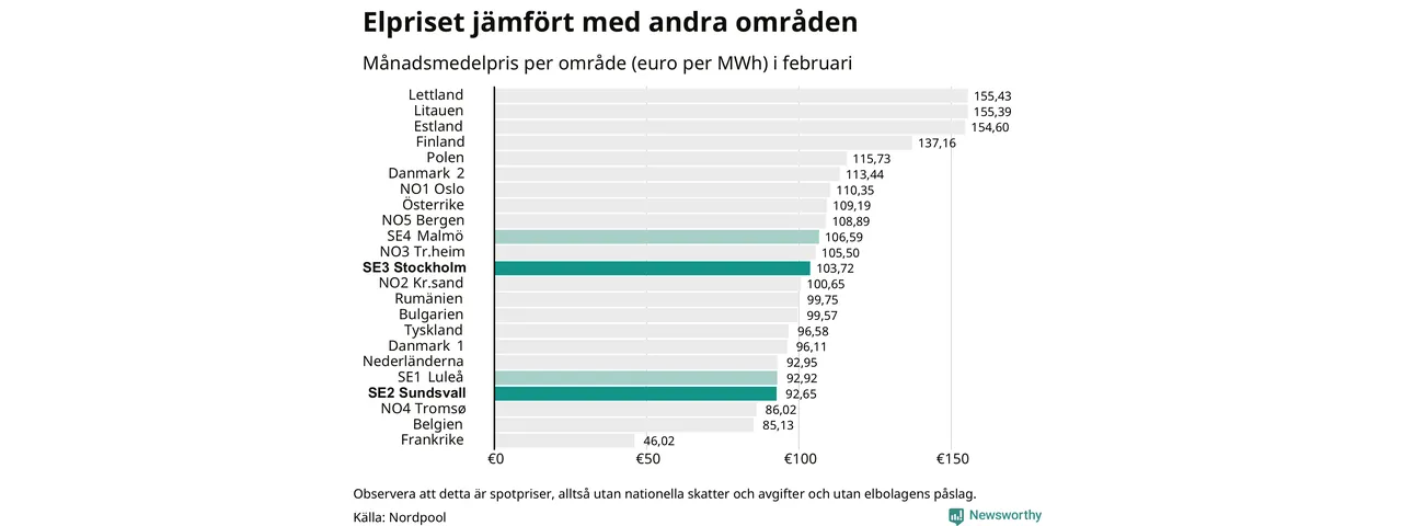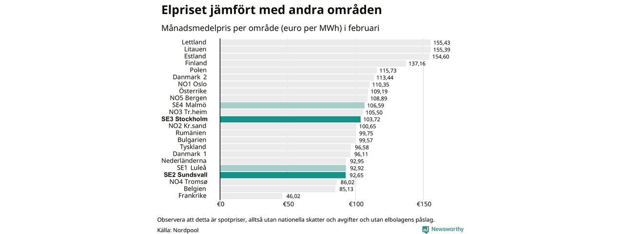 Om man tittar på månadsmedelpriset brukar de svenska elområdena oftast tillhöra de med lägst spotpriser i en europeisk jämförelse. Värt att notera är att detta handlar om spotpriser, de priser konsumenten sedan betalar beror på nationella avgifter och skatter samt elbolagens påslag. I praktiken ligger de svenska konsumentpriserna närmare det europeiska snittet efter skatter och påslag.