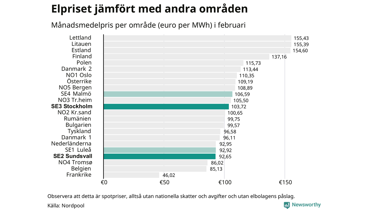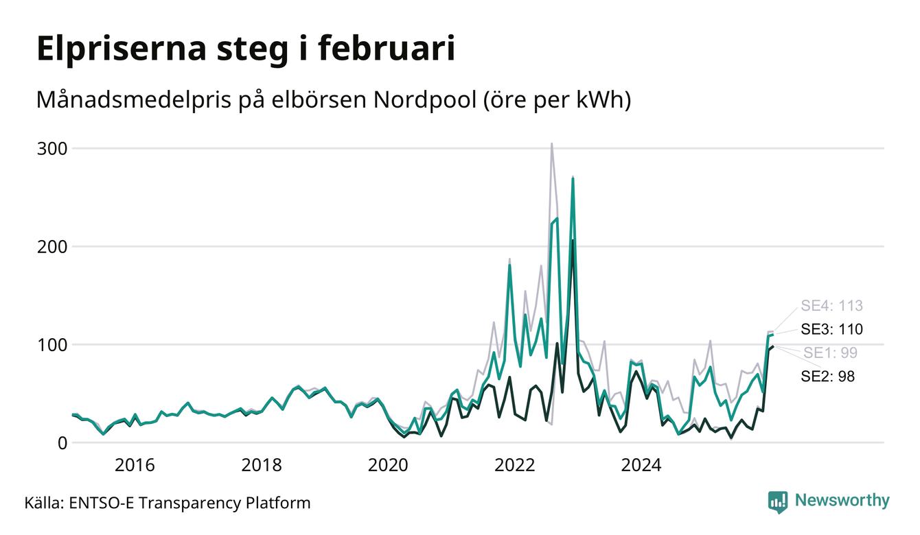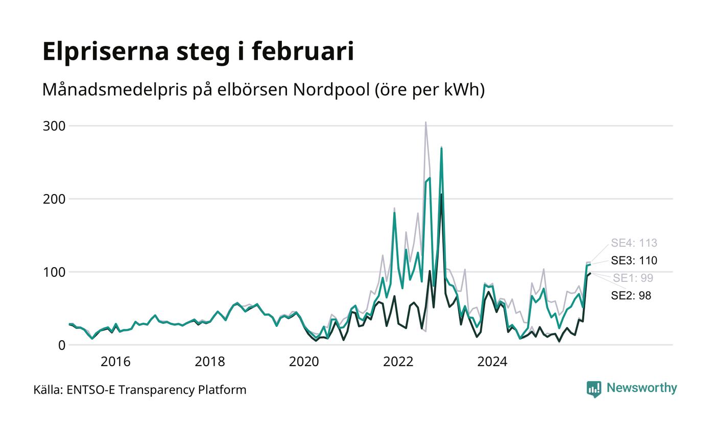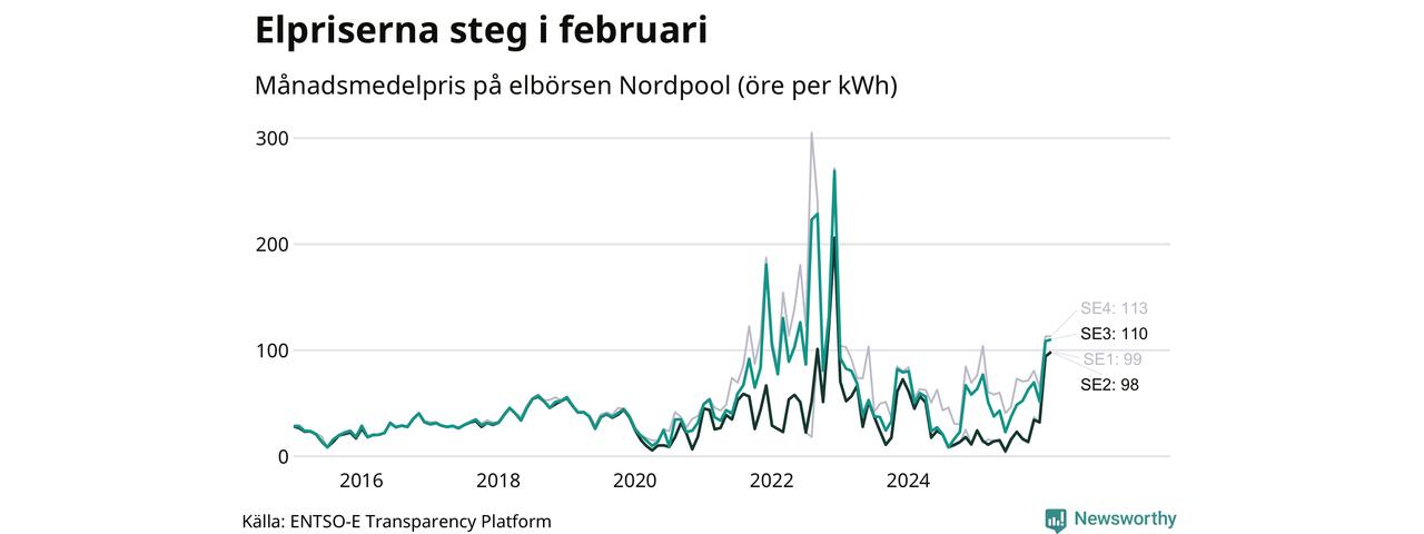 Gävle kommun tillhör två elområden, tätorten Gävle ligger i elområde 3, medan till exempel Bergby och Norrsundet tillhör elområde 2. Spotpriset – alltså priset som elbolagen köper in elen för – steg i båda områdena i februari: I elområde 3 landade månadspriset per kilowattimme på 110 öre och i elområde 2 98 öre. Motsvarande priser i januari var 108 öre (elområde 3) och 94 öre per kilowattimme (elområde 2). Rekordnoteringarna är 269 öre per kilowattimme i elområde 3 och 206 öre per kilowattimme i elområde 2. För ett år sedan, i februari 2025, var snittpriset 77 öre per kilowattimme i elområde 3 och 14 öre per kilowattimme i elområde 2.