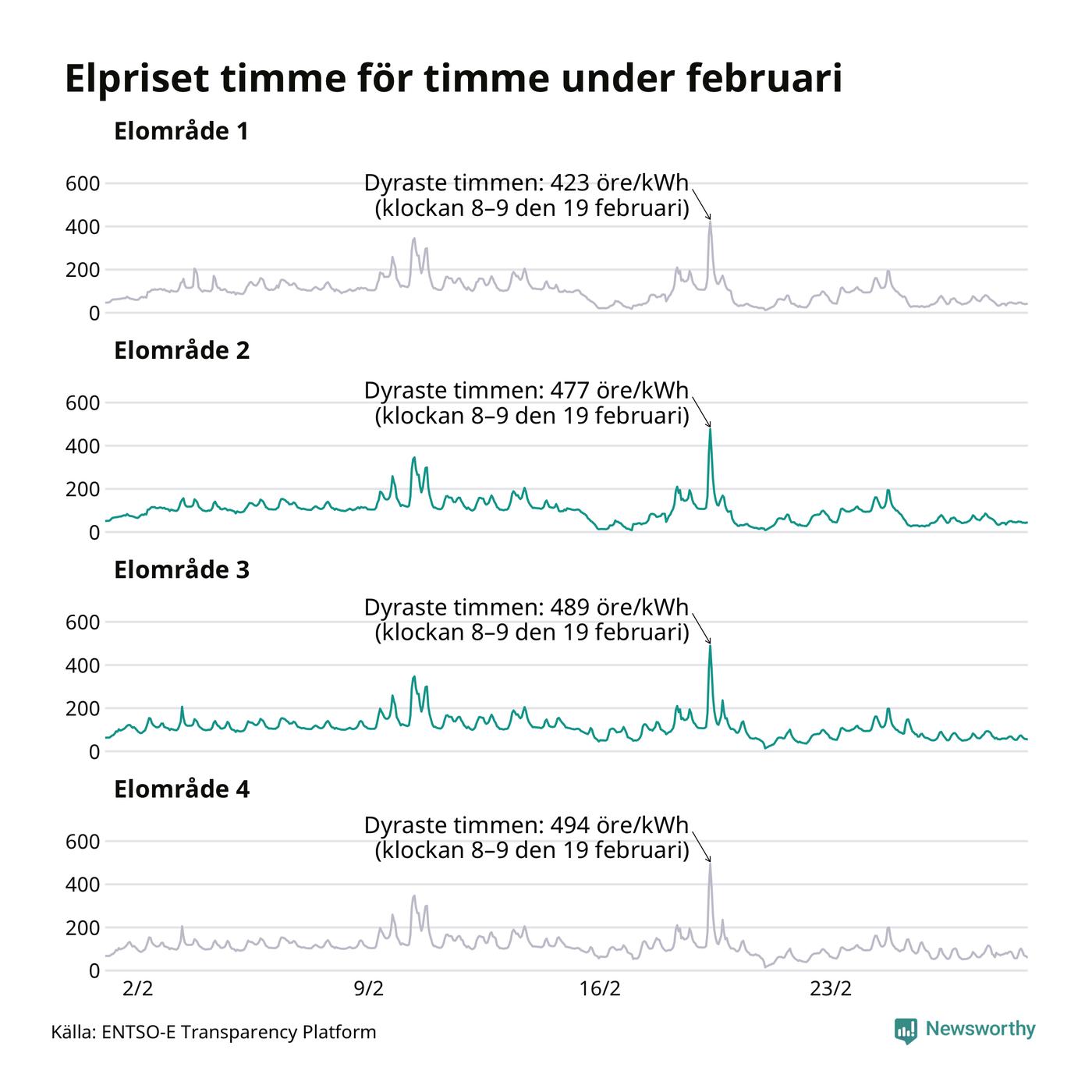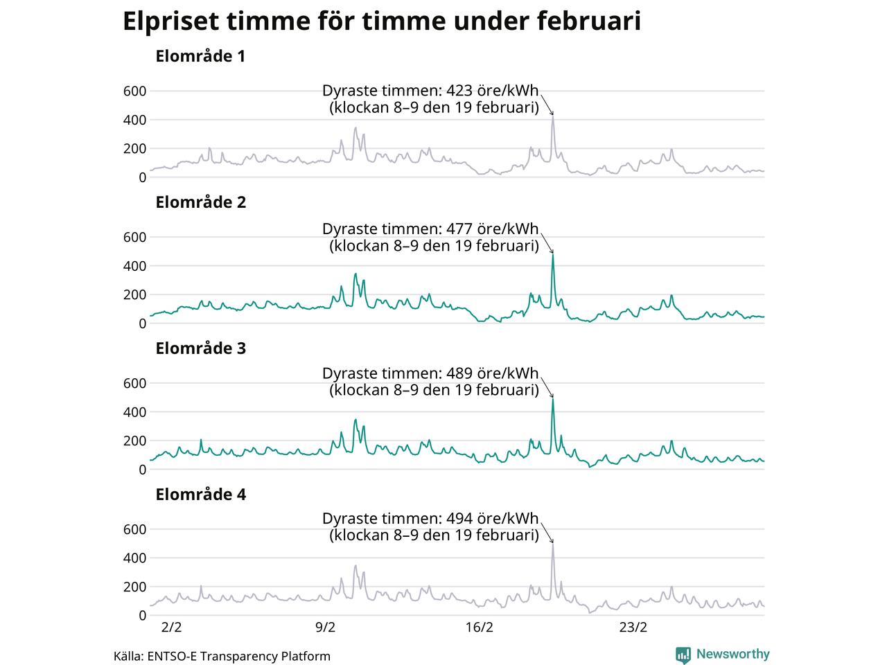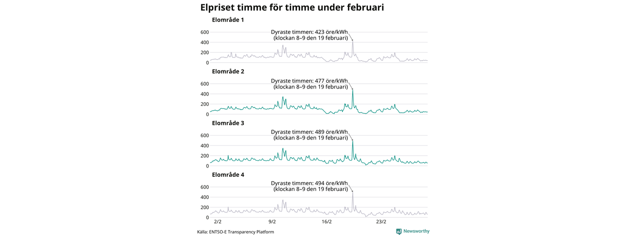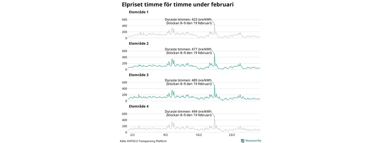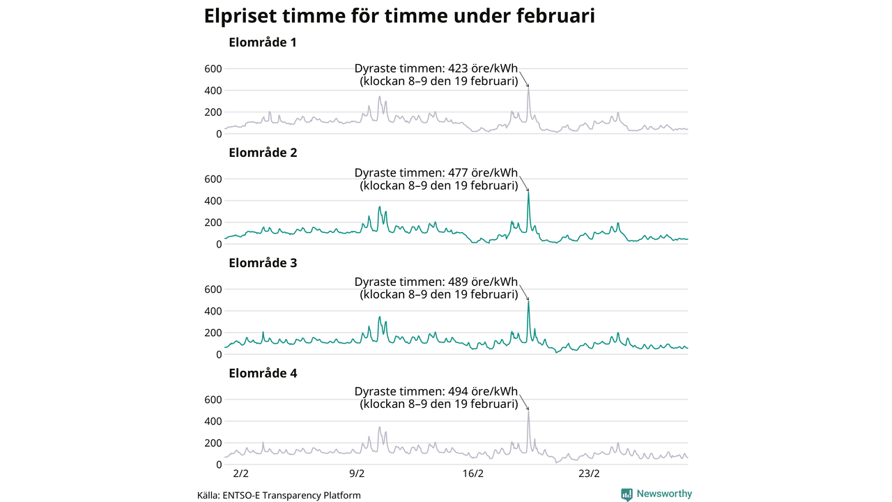 Det är inte bara prisskillnaderna mellan prisområdena som har ökat de senaste åren, även inom områdena pendlar priserna timme för timme – och skillnaderna mellan de dyraste och billigaste timmarna har blivit större sedan 2020. Dyraste timmen i februari i elområde 3 inträffade mellan klockan 7 och 8 den 19 februari, då kostade en kilowattimme 489 öre. Som lägst var priset i området 14 öre. I elområde 2 toppade priset samtidigt på 477 öre per kilowattimme. Som lägst kostade elen i området 9 öre per kilowattimme.