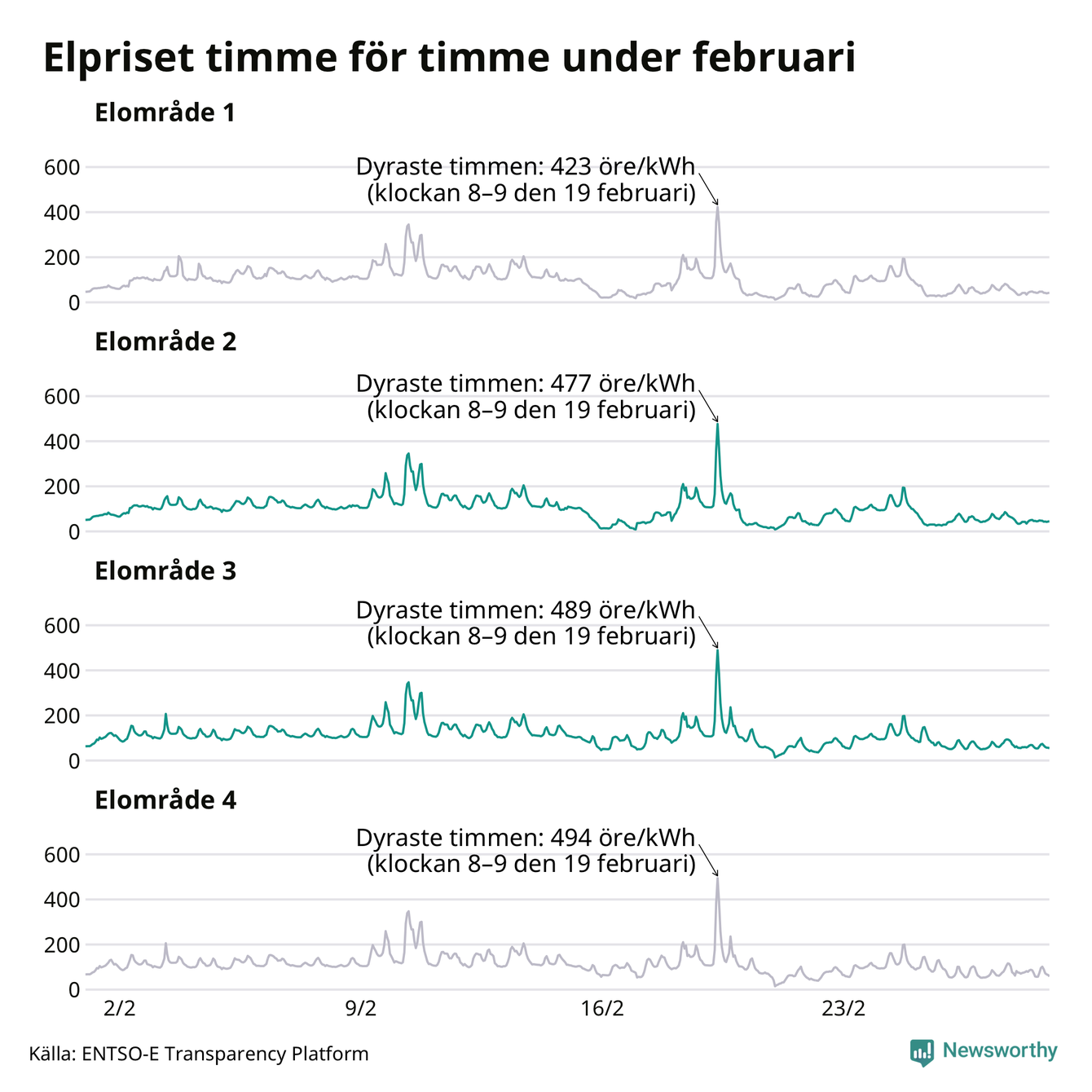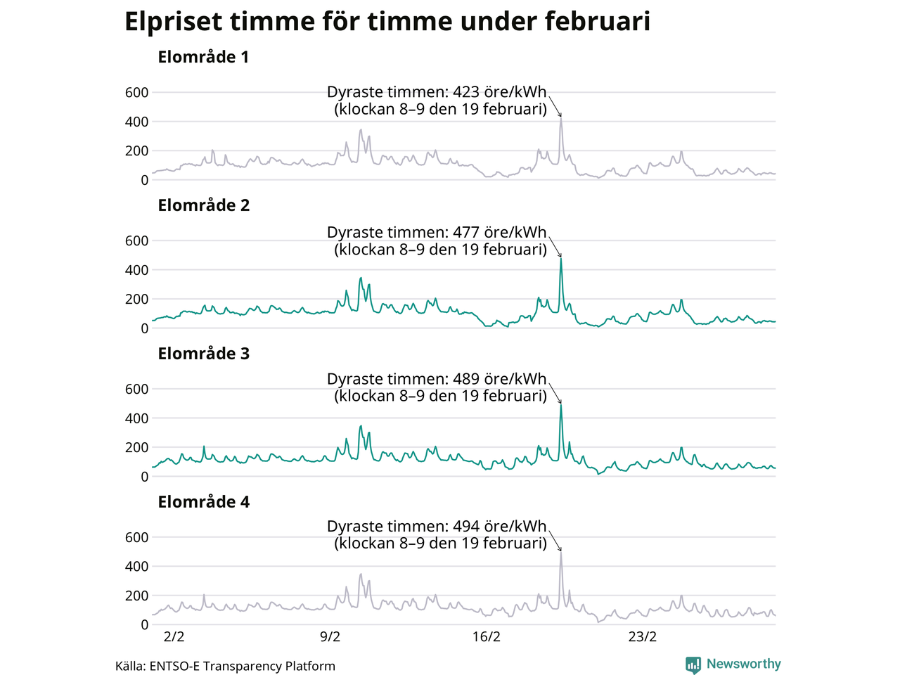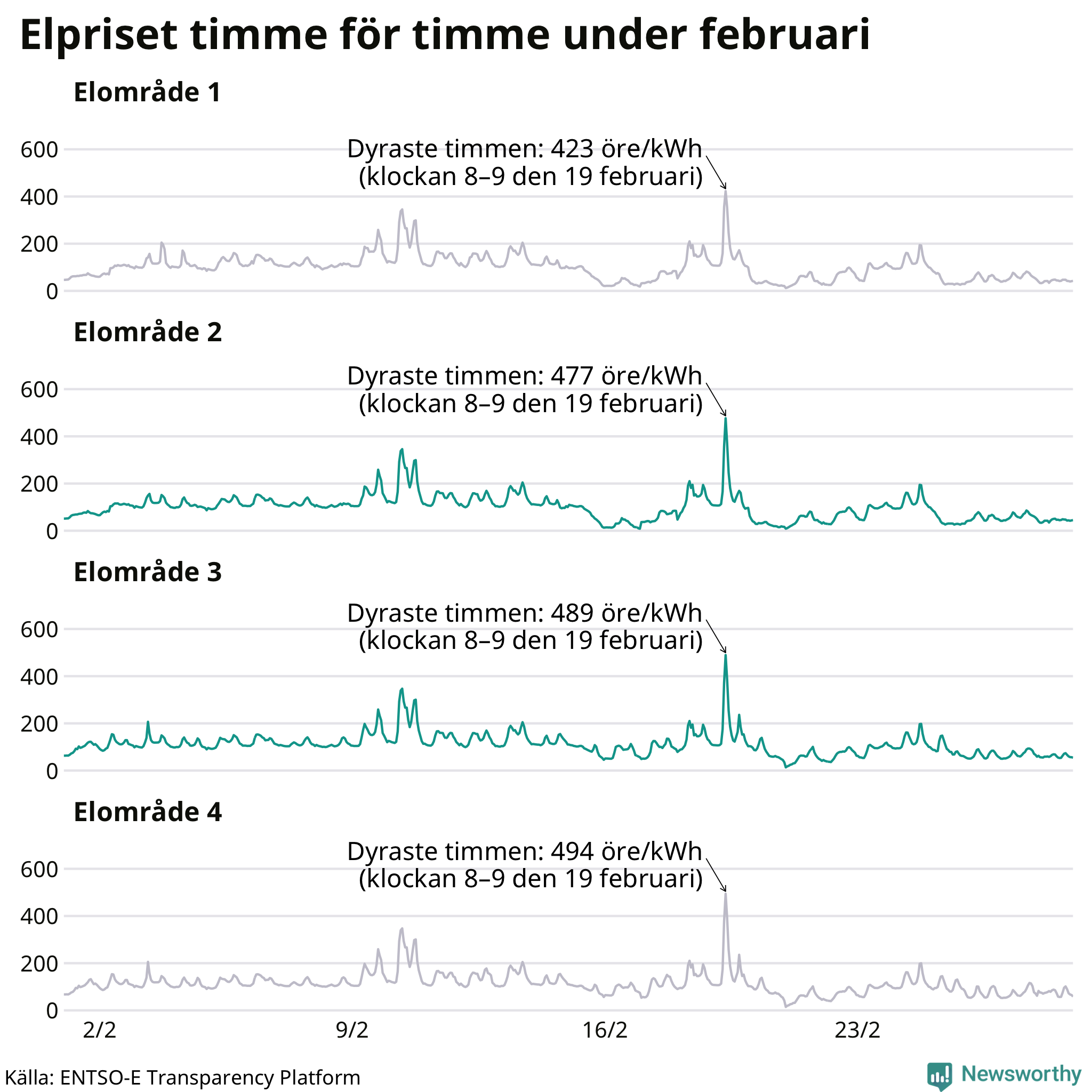 Det är inte bara prisskillnaderna mellan prisområdena som har ökat de senaste åren, även inom områdena pendlar priserna timme för timme – och skillnaderna mellan de dyraste och billigaste timmarna har blivit större sedan 2020. Dyraste timmen i februari i elområde 3 inträffade mellan klockan 7 och 8 den 19 februari, då kostade en kilowattimme 489 öre. Som lägst var priset i området 14 öre. I elområde 2 toppade priset samtidigt på 477 öre per kilowattimme. Som lägst kostade elen i området 9 öre per kilowattimme.