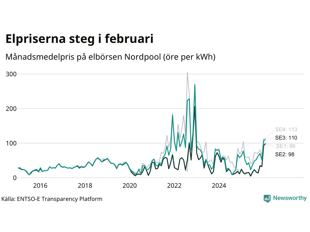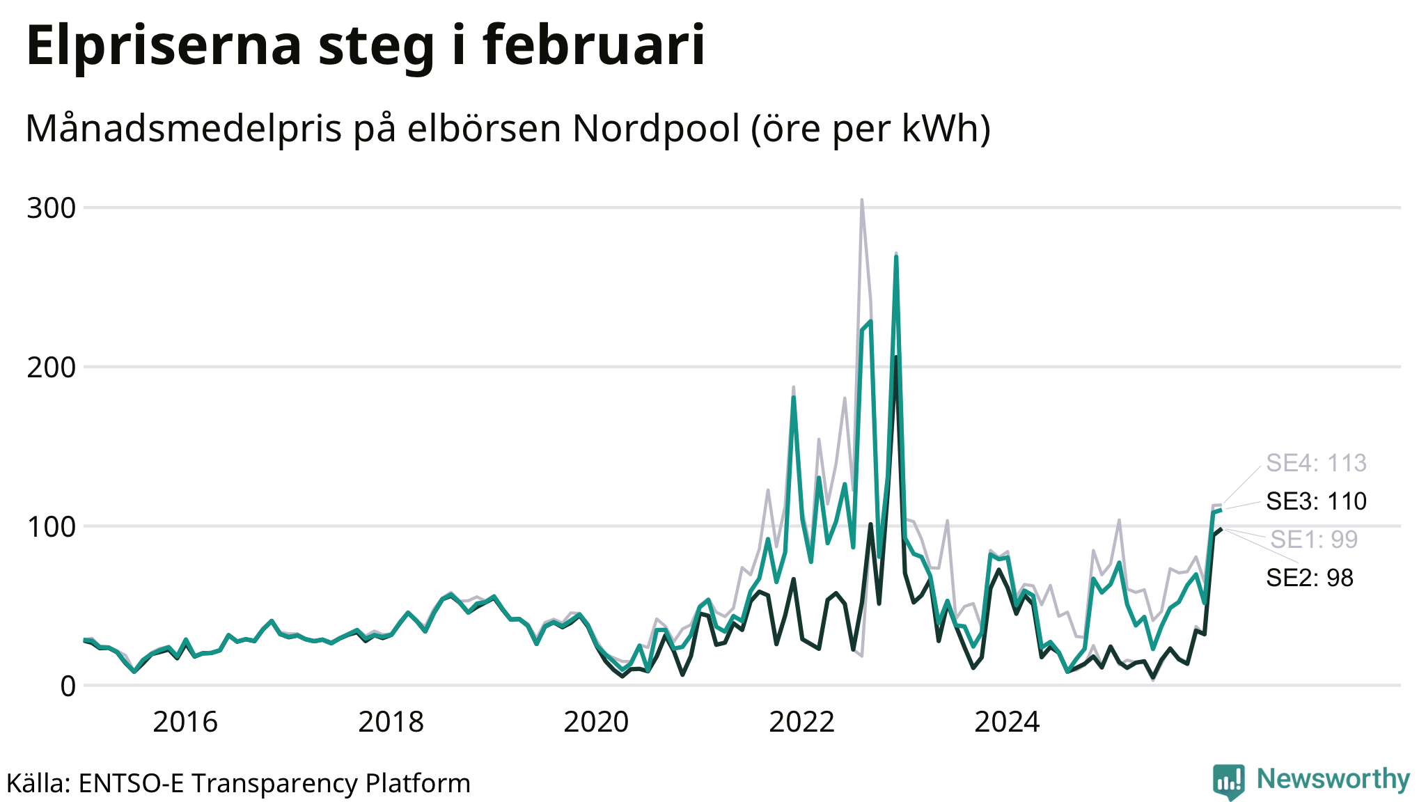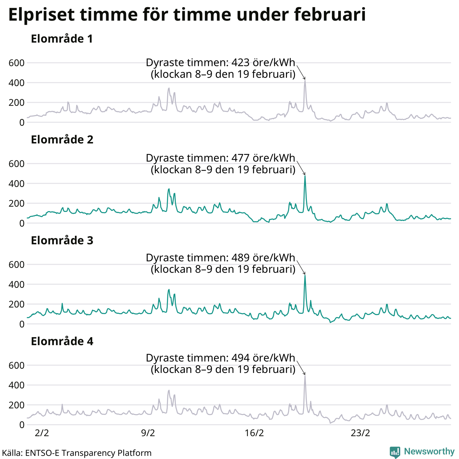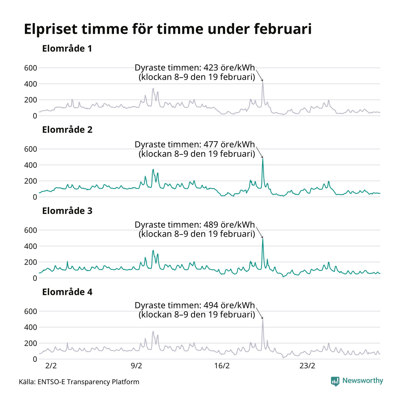 Det är inte bara prisskillnaderna mellan prisområdena som har ökat de senaste åren, även inom områdena pendlar priserna timme för timme – och skillnaderna mellan de dyraste och billigaste timmarna har blivit större sedan 2020. Dyraste timmen i februari i elområde 3 inträffade mellan klockan 7 och 8 den 19 februari, då kostade en kilowattimme 489 öre. Som lägst var priset i området 14 öre. I elområde 2 toppade priset samtidigt på 477 öre per kilowattimme. Som lägst kostade elen i området 9 öre per kilowattimme.