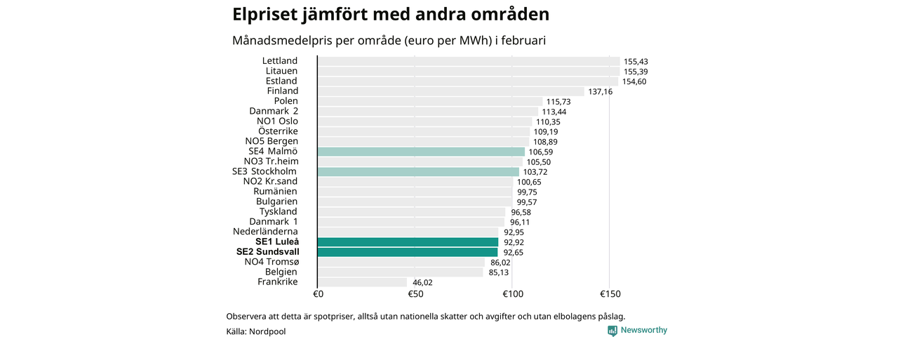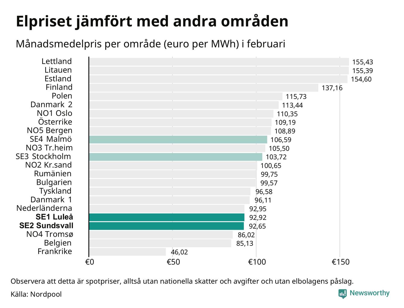 Om man tittar på månadsmedelpriset brukar de svenska elområdena oftast tillhöra de med lägst spotpriser i en europeisk jämförelse. Värt att notera är att detta handlar om spotpriser, de priser konsumenten sedan betalar beror på nationella avgifter och skatter samt elbolagens påslag. I praktiken ligger de svenska konsumentpriserna närmare det europeiska snittet efter skatter och påslag.