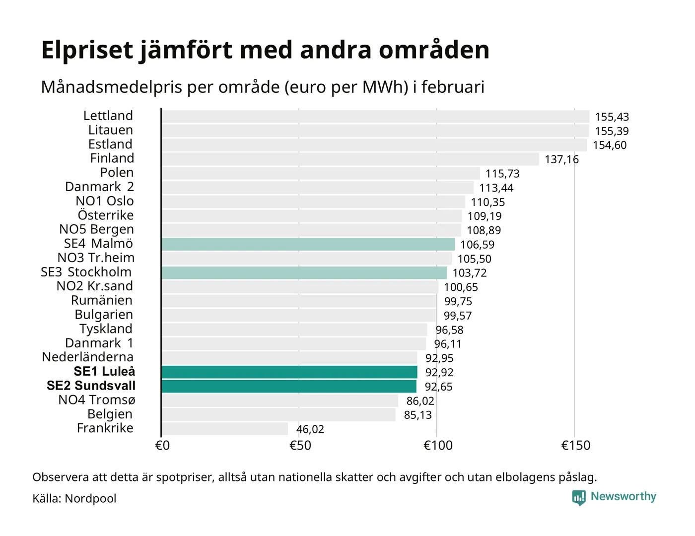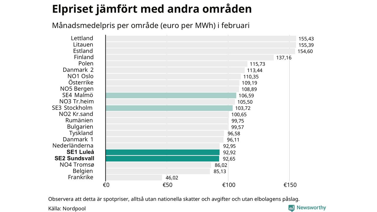 Det betyder också att det kan vara olika pris i de olika områdena. Elområde 1 och elområde 2 som Robertsfors delas mellan följer ofta varadra ofta prismässigt. Sedan 2020 har medelpriset skilt sig under 18 månader. Också i februari var priset det samma i båda områdena.