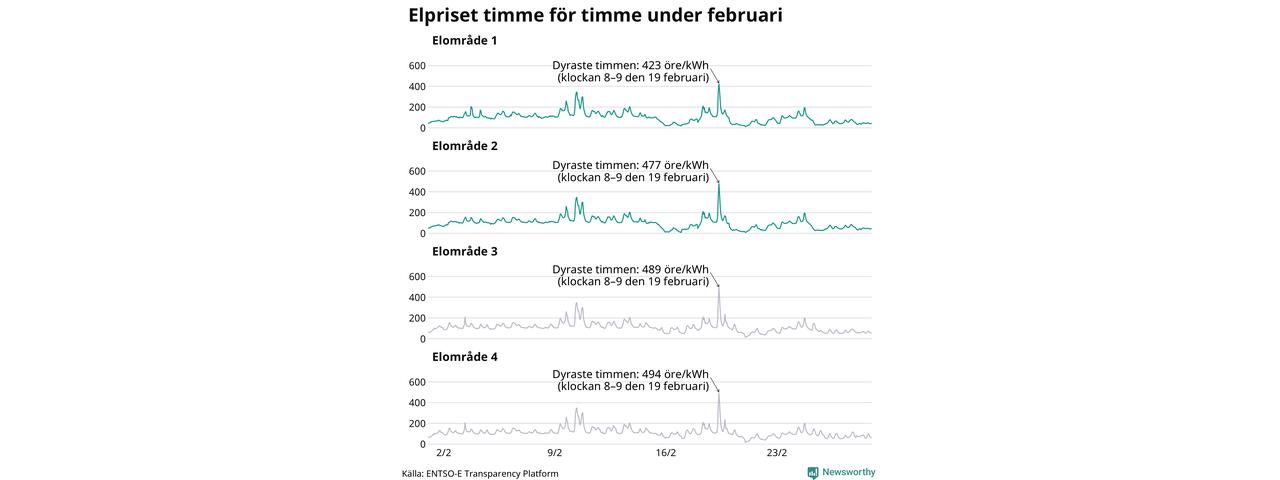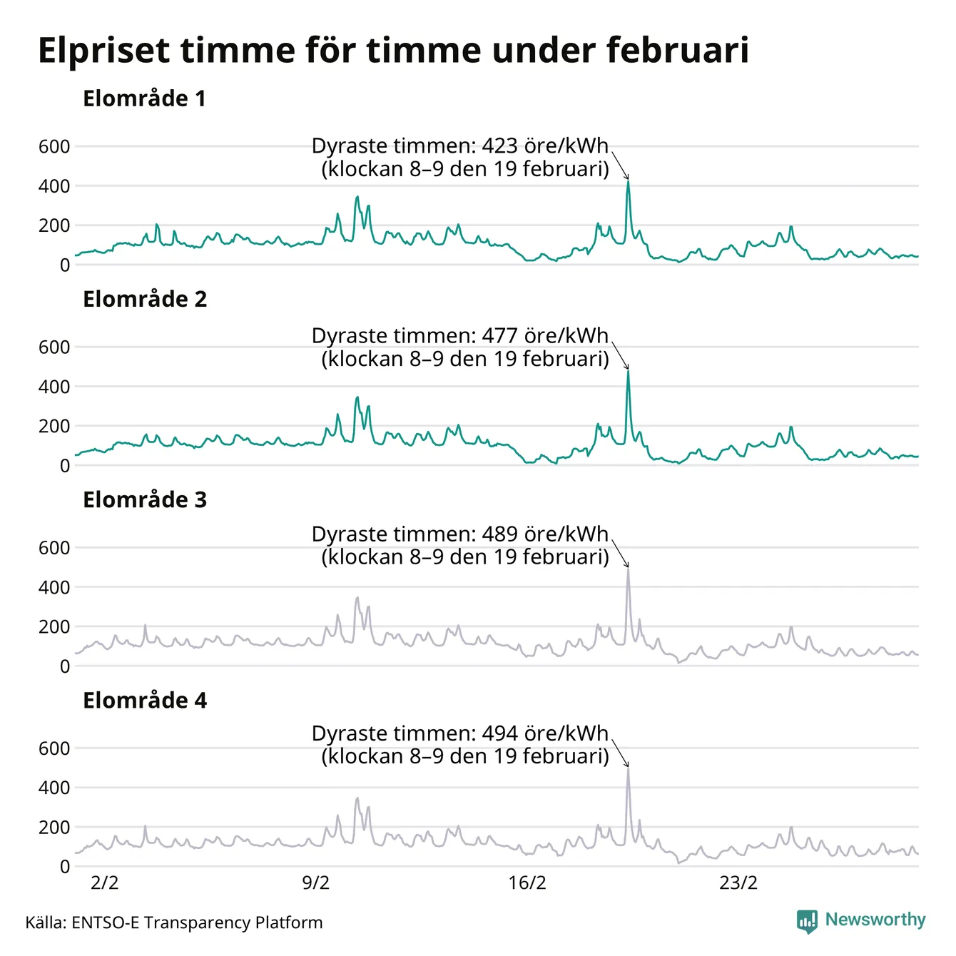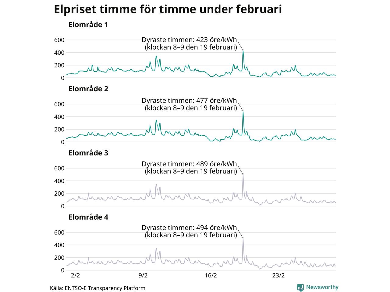 Det är inte bara prisskillnaderna mellan prisområdena som har ökat de senaste åren, även inom områdena pendlar priserna timme för timme – och skillnaderna mellan de dyraste och billigaste timmarna har blivit större sedan 2020. Dyraste timmen i februari i elområde 2 inträffade mellan klockan 7 och 8 den 19 februari, då kostade en kilowattimme 477 öre. Som lägst var priset i området 9 öre. I elområde 1 toppade priset samtidigt på 423 öre per kilowattimme. Som lägst kostade elen i området 12 öre per kilowattimme.