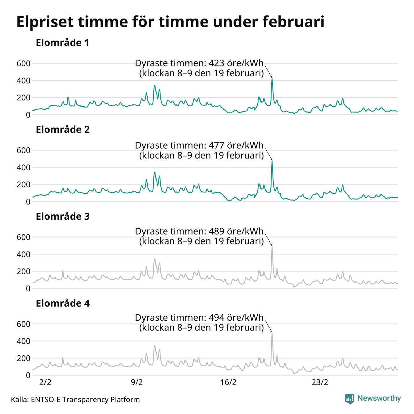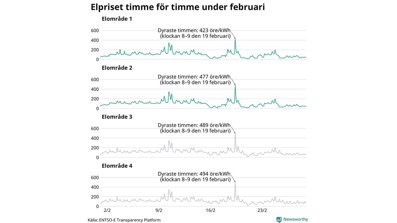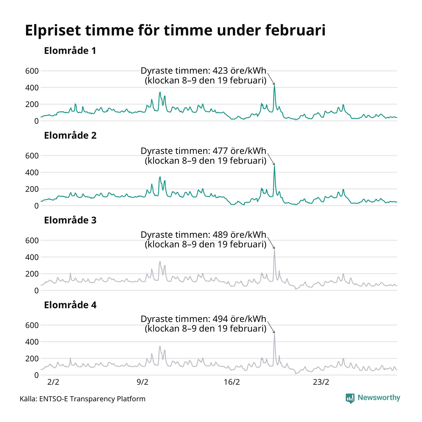 Det är inte bara prisskillnaderna mellan prisområdena som har ökat de senaste åren, även inom områdena pendlar priserna timme för timme – och skillnaderna mellan de dyraste och billigaste timmarna har blivit större sedan 2020. Dyraste timmen i februari i elområde 2 inträffade mellan klockan 7 och 8 den 19 februari, då kostade en kilowattimme 477 öre. Som lägst var priset i området 9 öre. I elområde 1 toppade priset samtidigt på 423 öre per kilowattimme. Som lägst kostade elen i området 12 öre per kilowattimme.