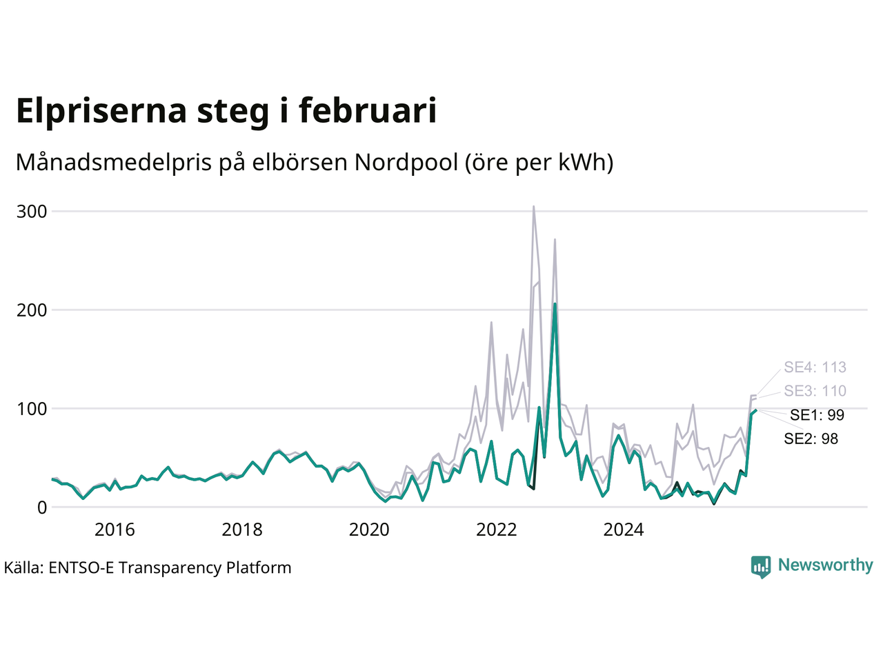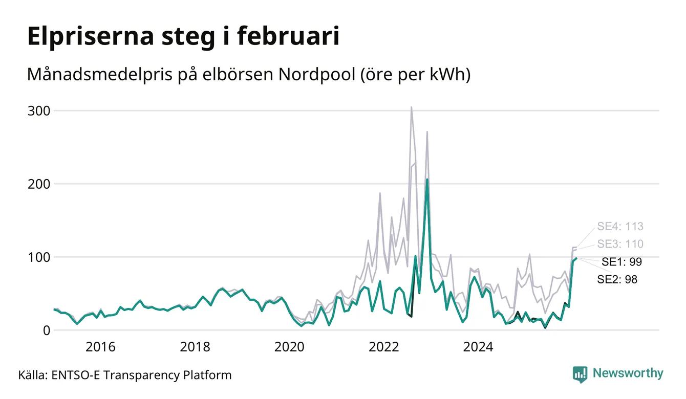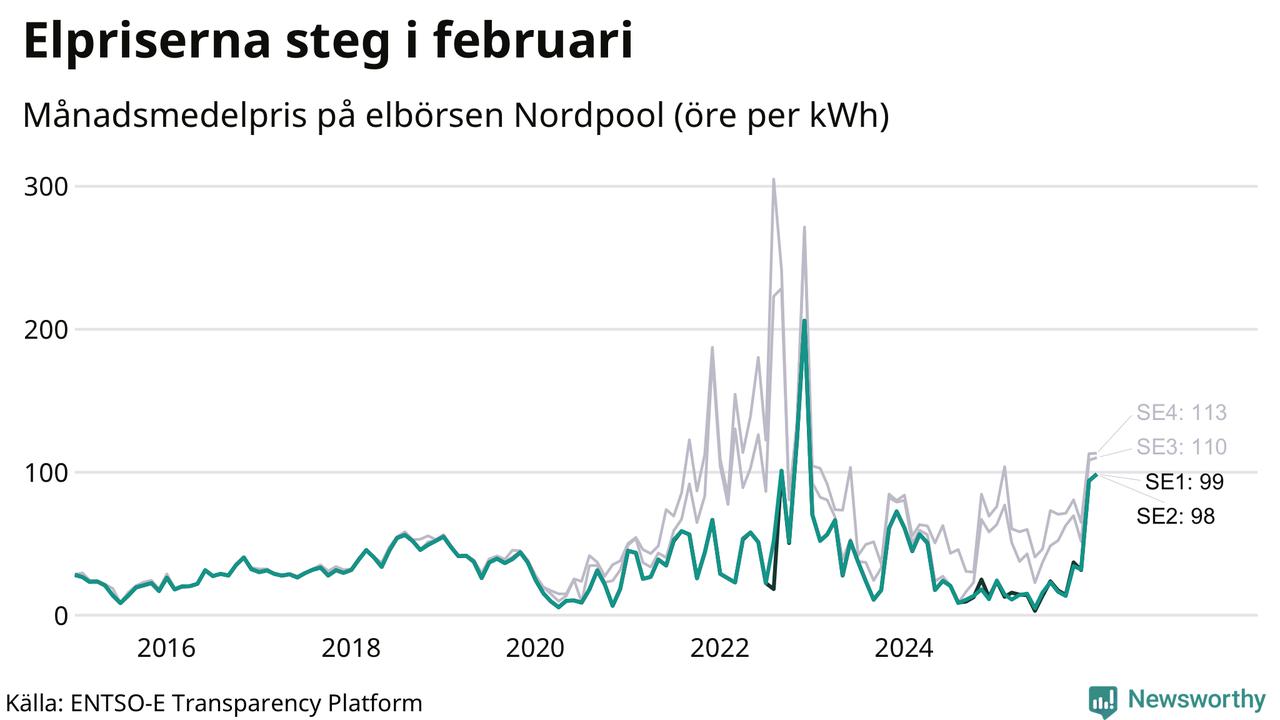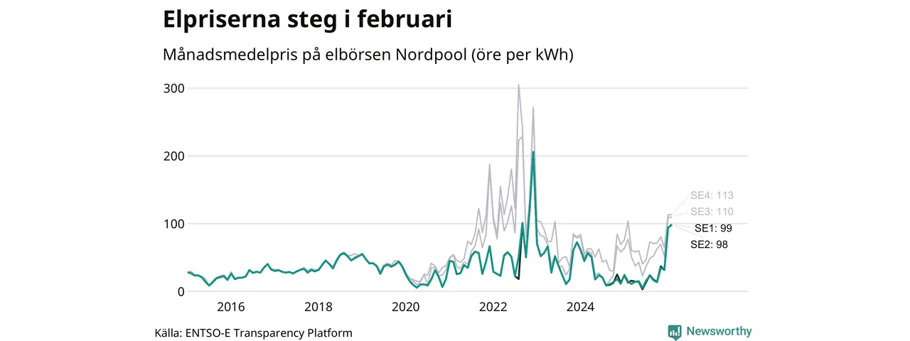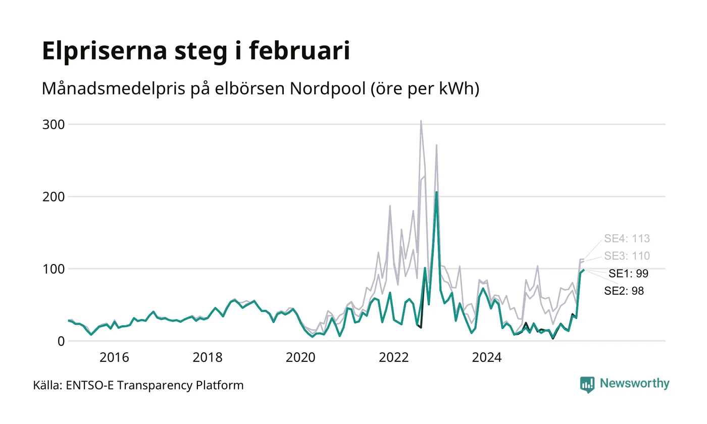 Robertsfors kommun tillhör två elområden, tätorten Robertsfors ligger i elområde 2, medan till exempel Ånäset tillhör elområde 1. Spotpriset – alltså priset som elbolagen köper in elen för – steg i båda områdena i februari: I elområde 2 landade månadspriset per kilowattimme på 98 öre och i elområde 1 99 öre. Det kan jämföras med 94 öre januari. Rekordnoteringarna för områdena är på 206 öre per kilowattimme i december 2022 – och faktum är att medelpriset den senaste månaden är det högsta som noterats sedan dess. För ett år sedan, i februari 2025, var snittpriset 14 öre per kilowattimme i elområde 2 och 13 öre per kilowattimme i elområde 1.