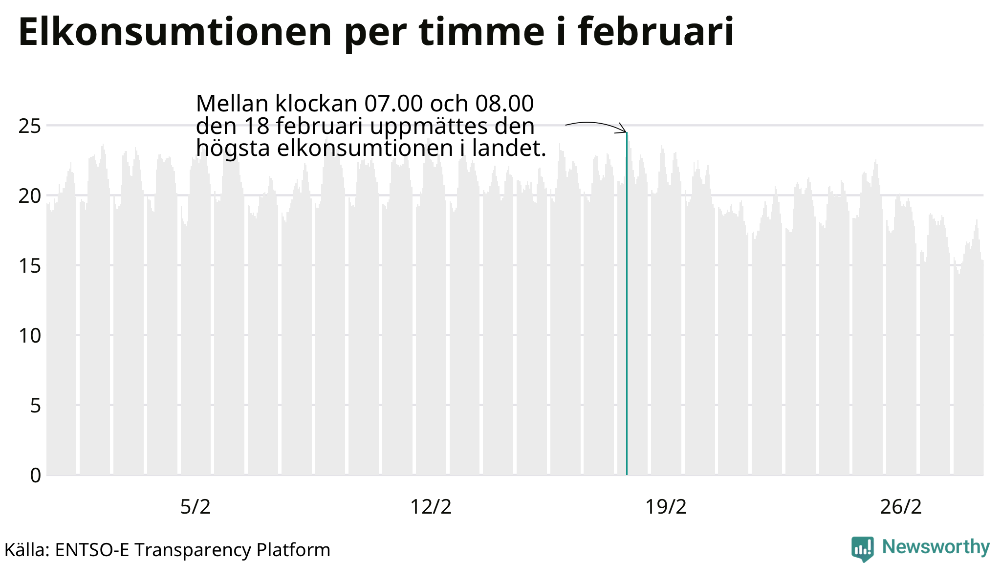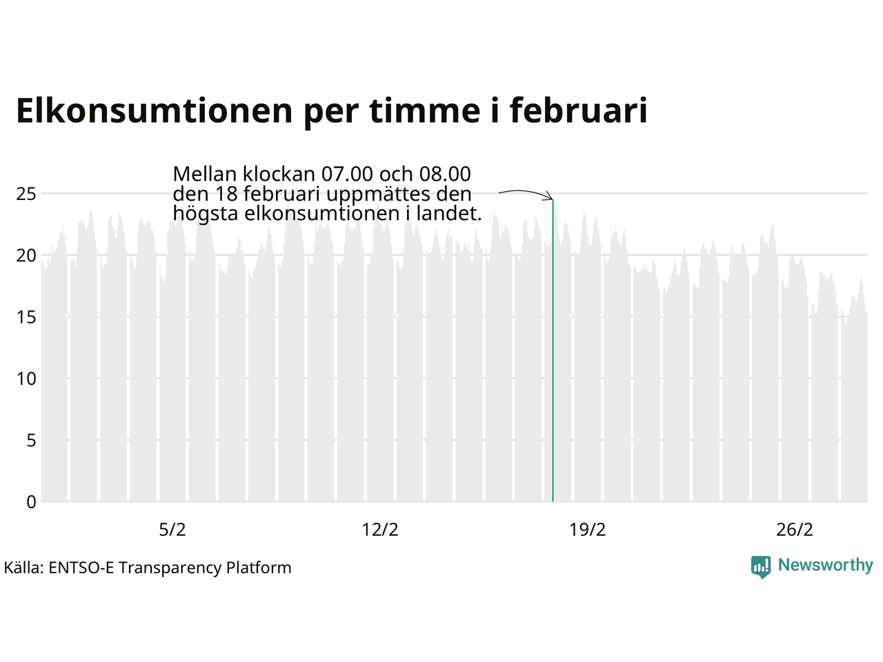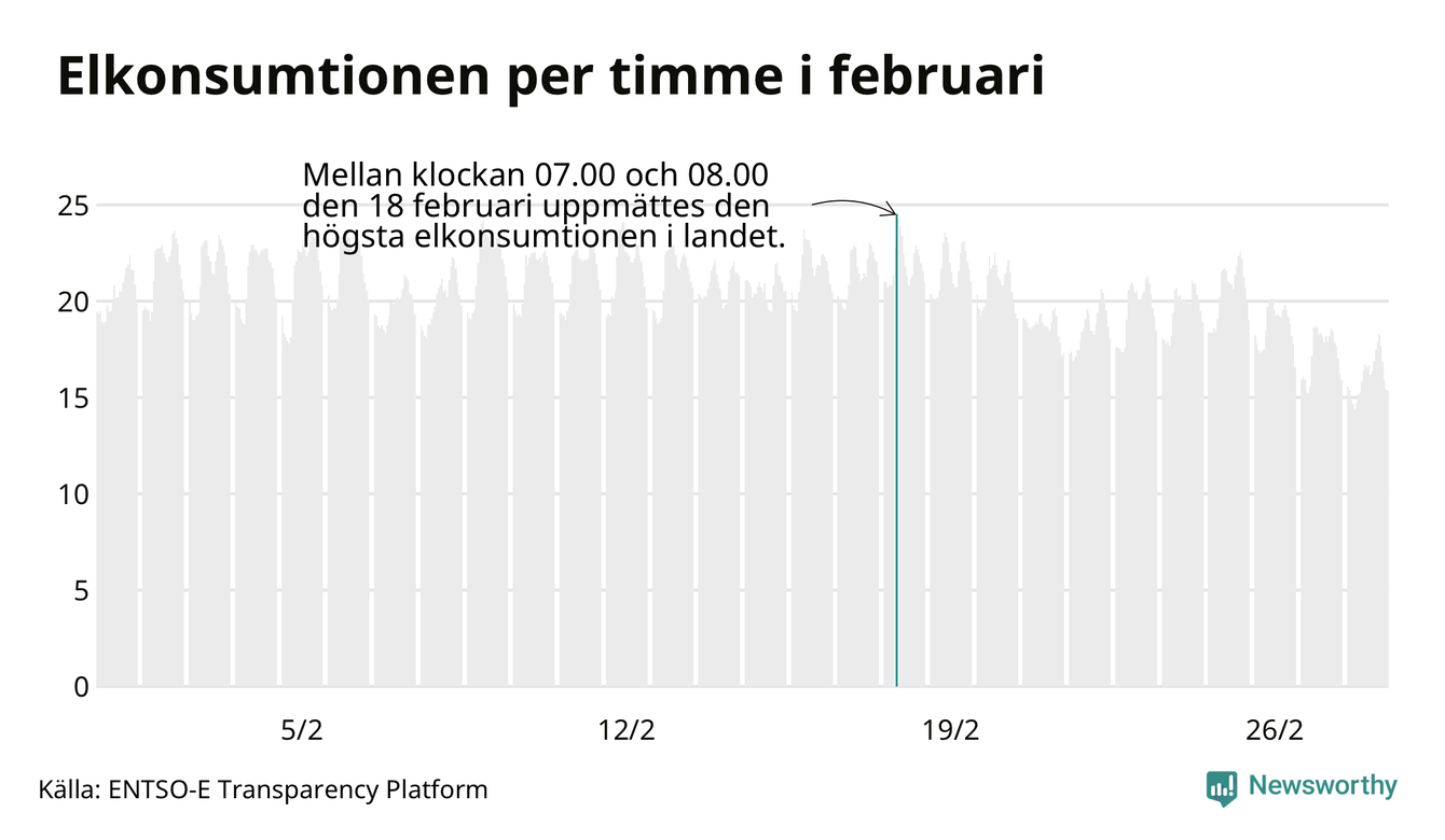 Den 18 februari konsumerades som mest el under ett dygn i Sverige under månaden, det var också under det dygnet då månadens topptimme uppmättes, mellan klockan 7 och 8.