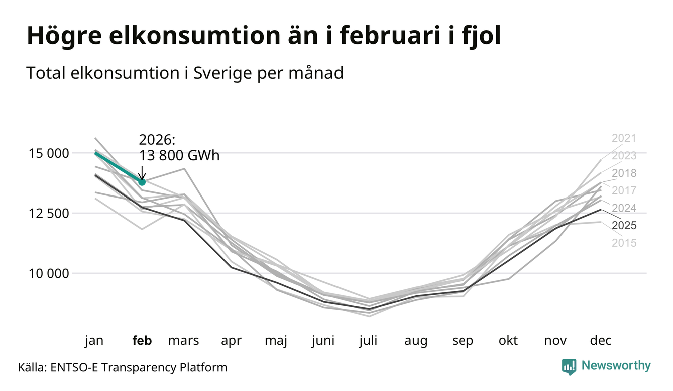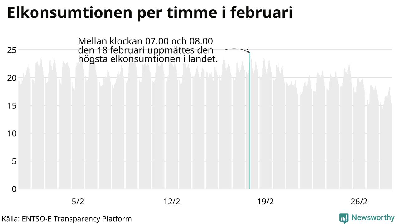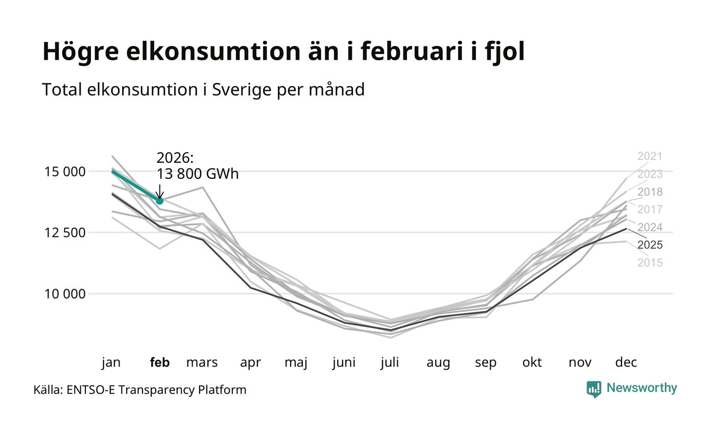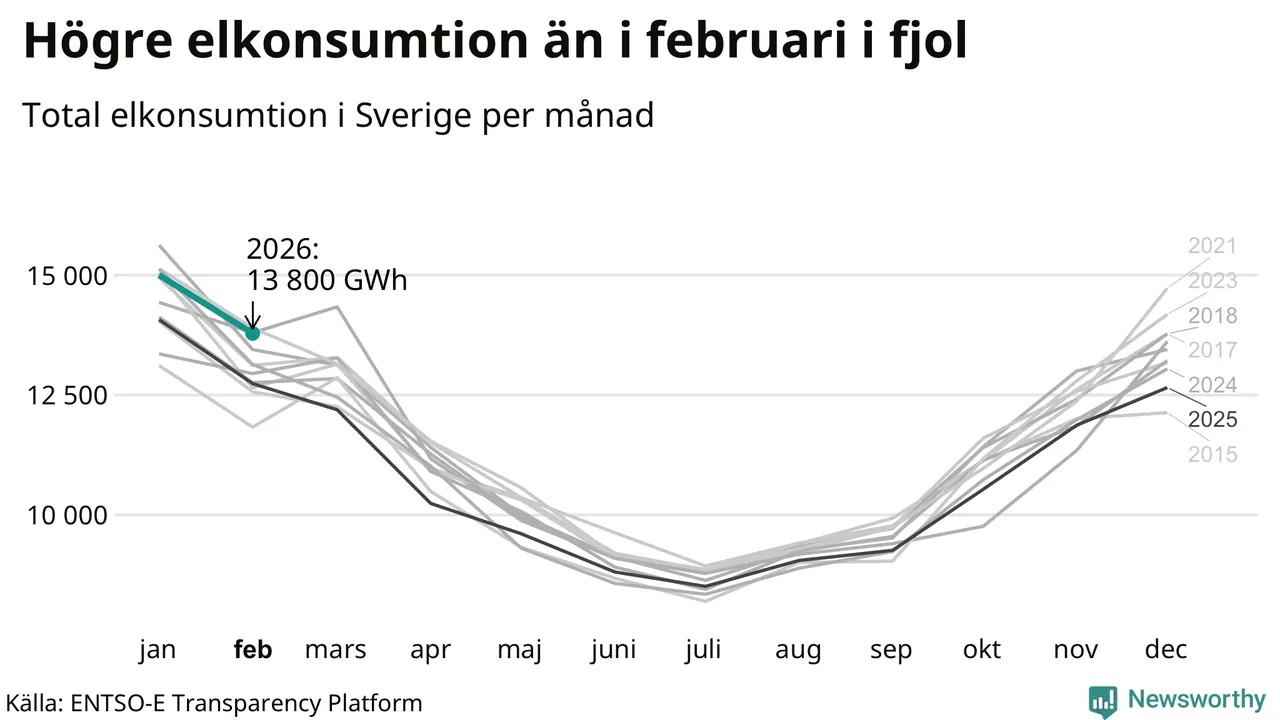 Under februari förbrukades det ungefär 13 800 gigawattimmar el i Sverige. Det är ungefär sex procent mer än snittet för månaden. Konsumtionen påverkas mycket av hur varmt det är i landet. SMHI konstaterar att februari varit kall och vintrig.