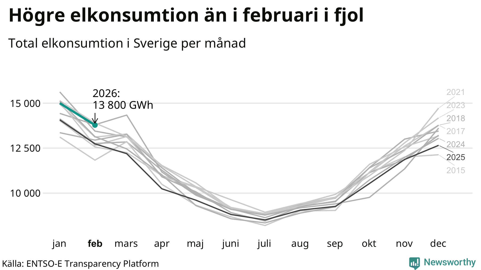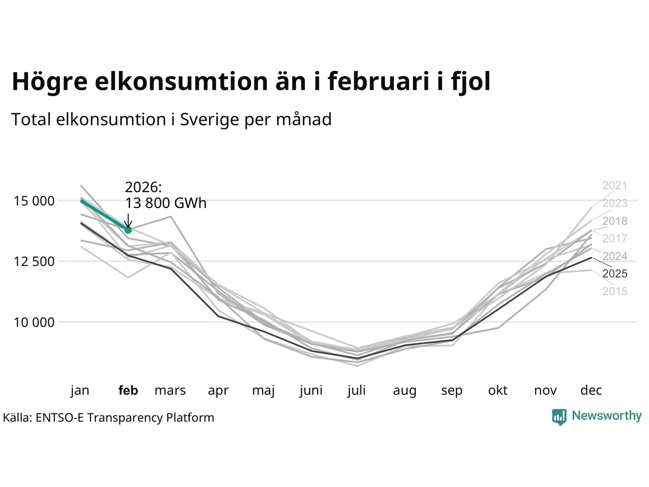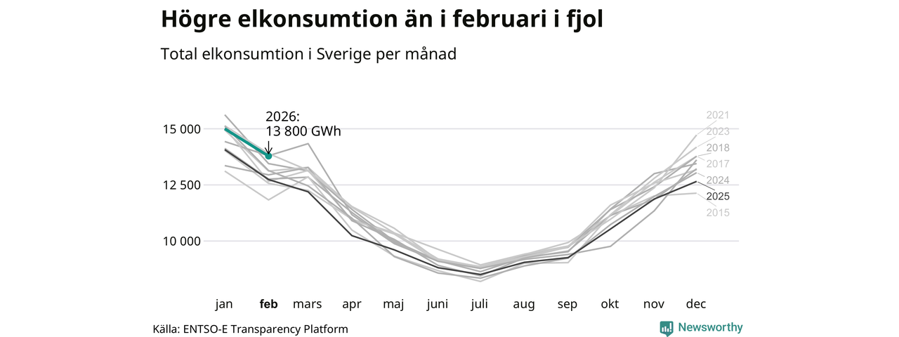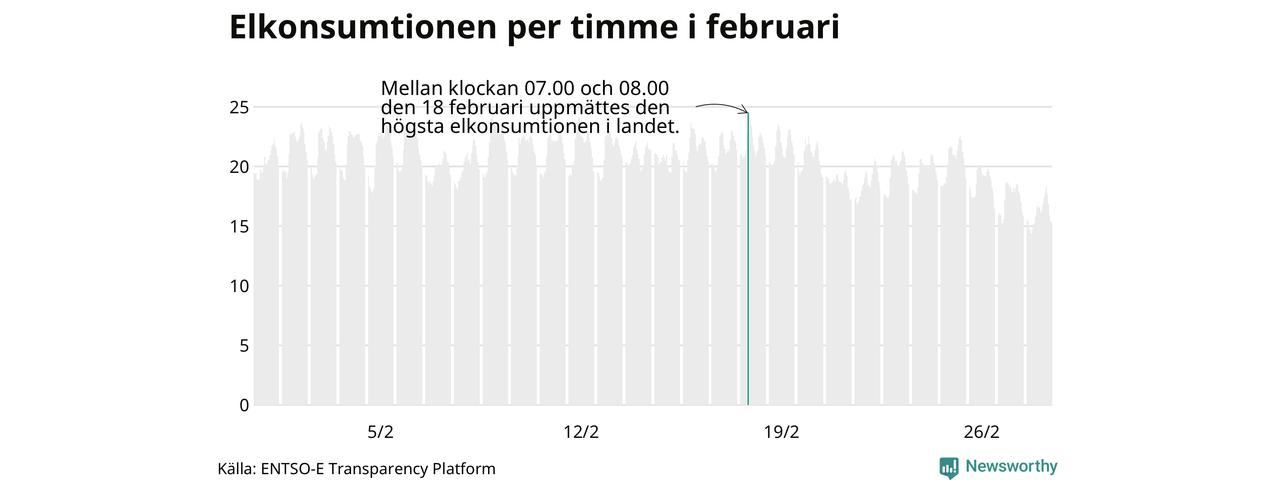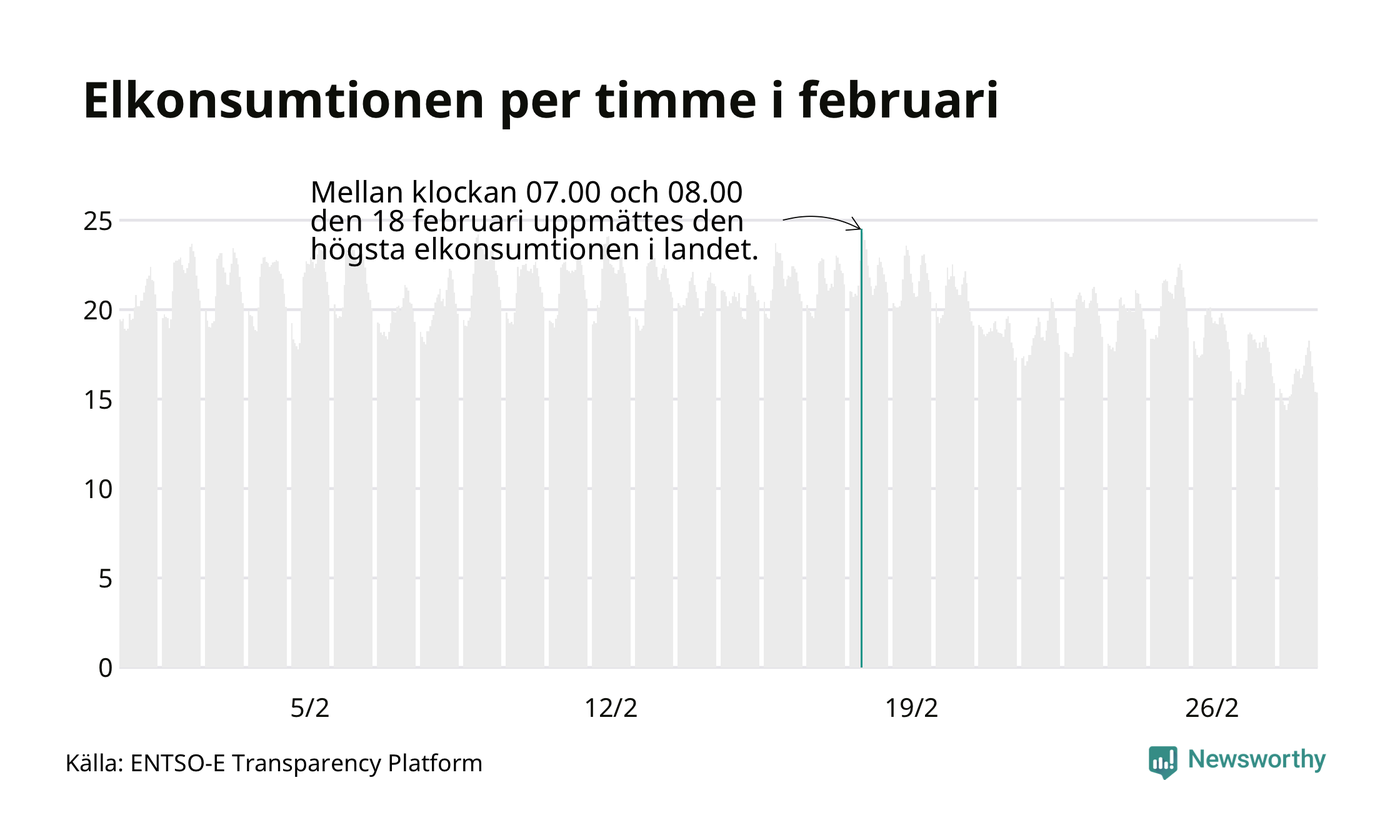 Under februari förbrukades det ungefär 13 800 gigawattimmar el i Sverige. Det är ungefär sex procent mer än snittet för månaden. Konsumtionen påverkas mycket av hur varmt det är i landet. SMHI konstaterar att februari varit kall och vintrig.