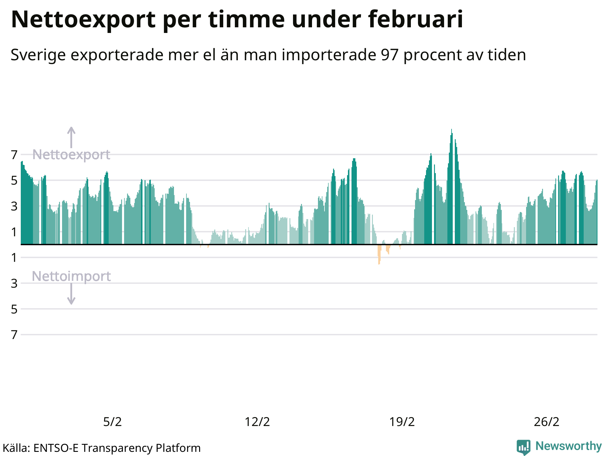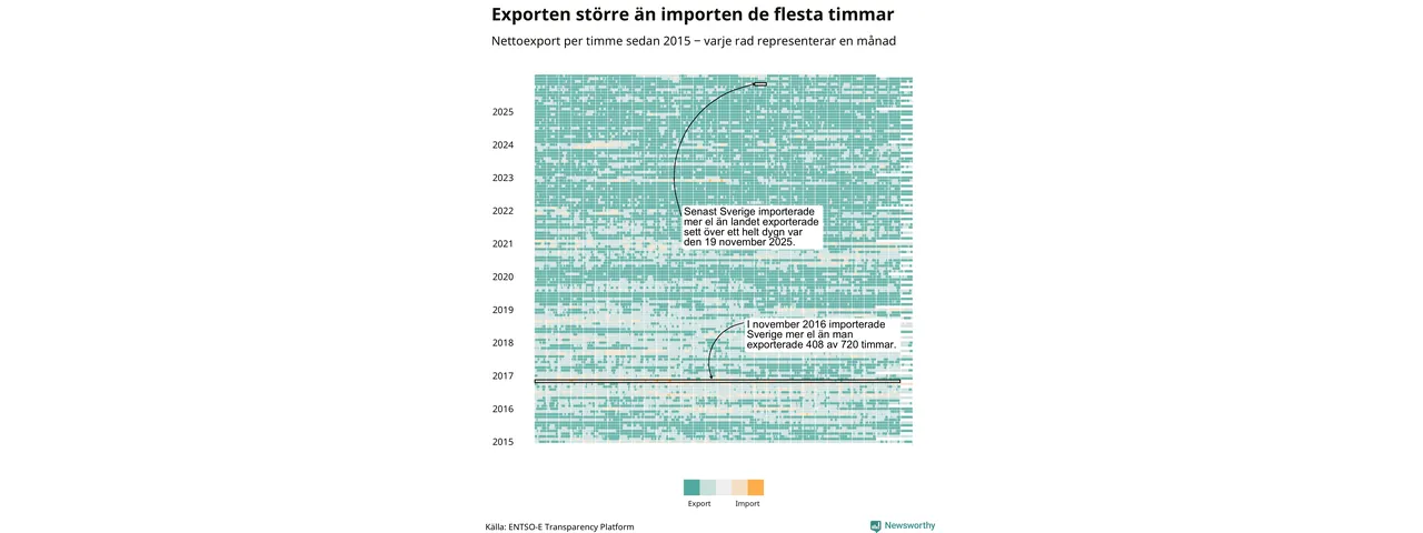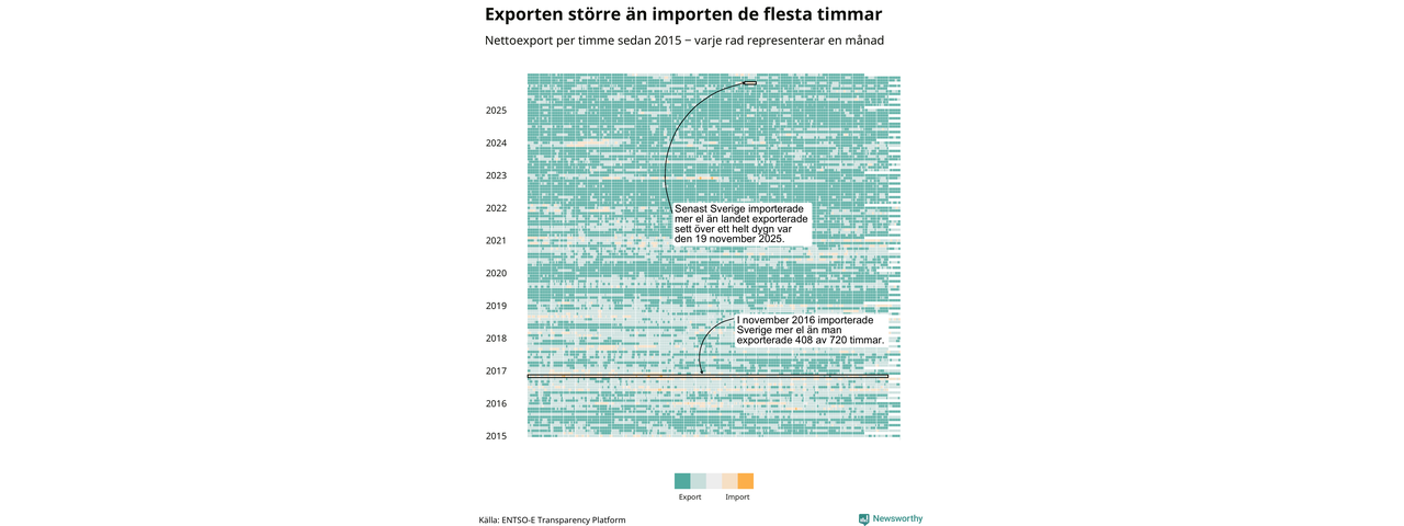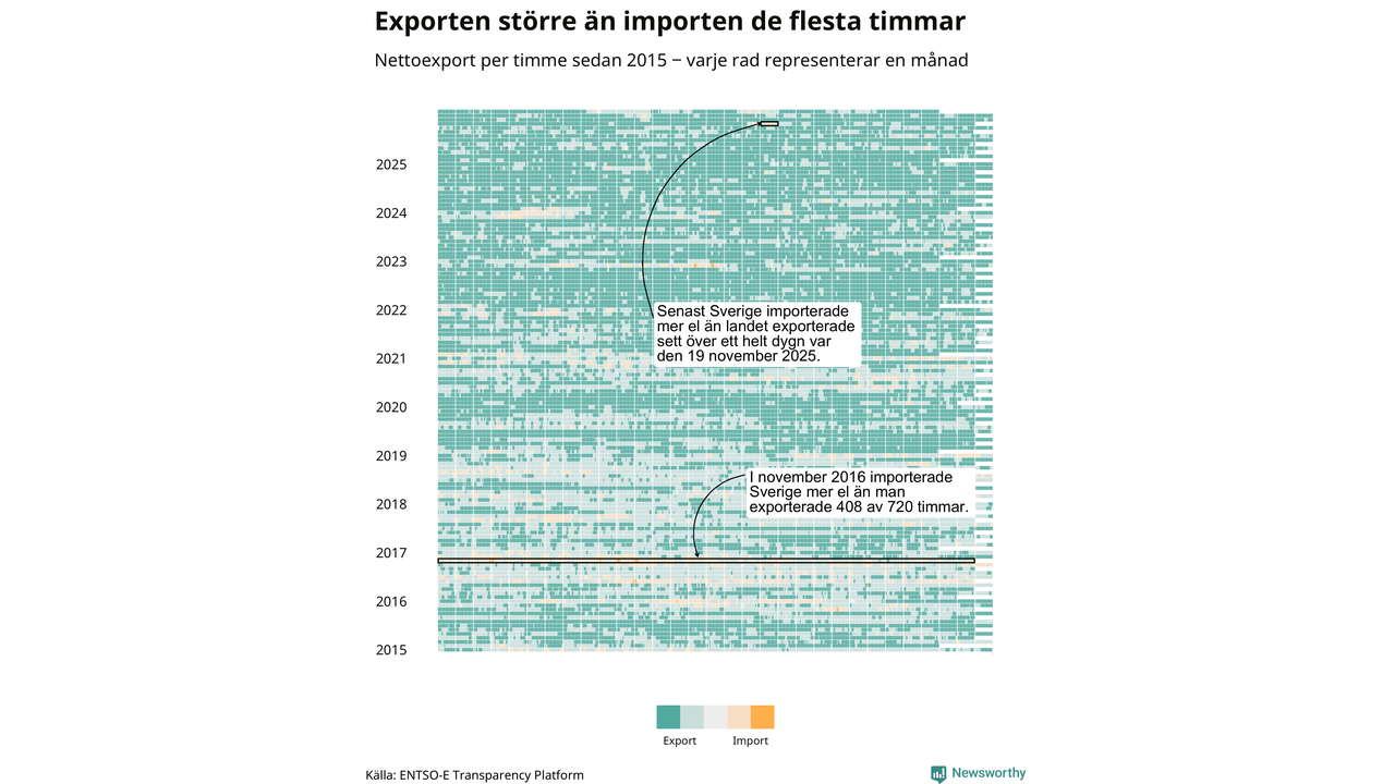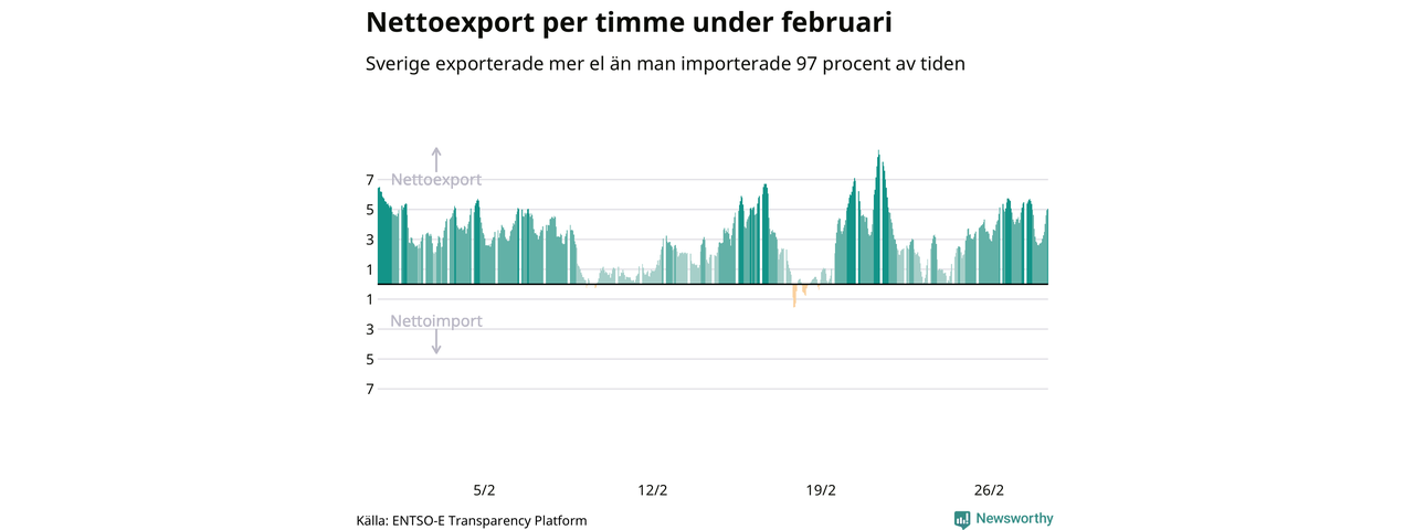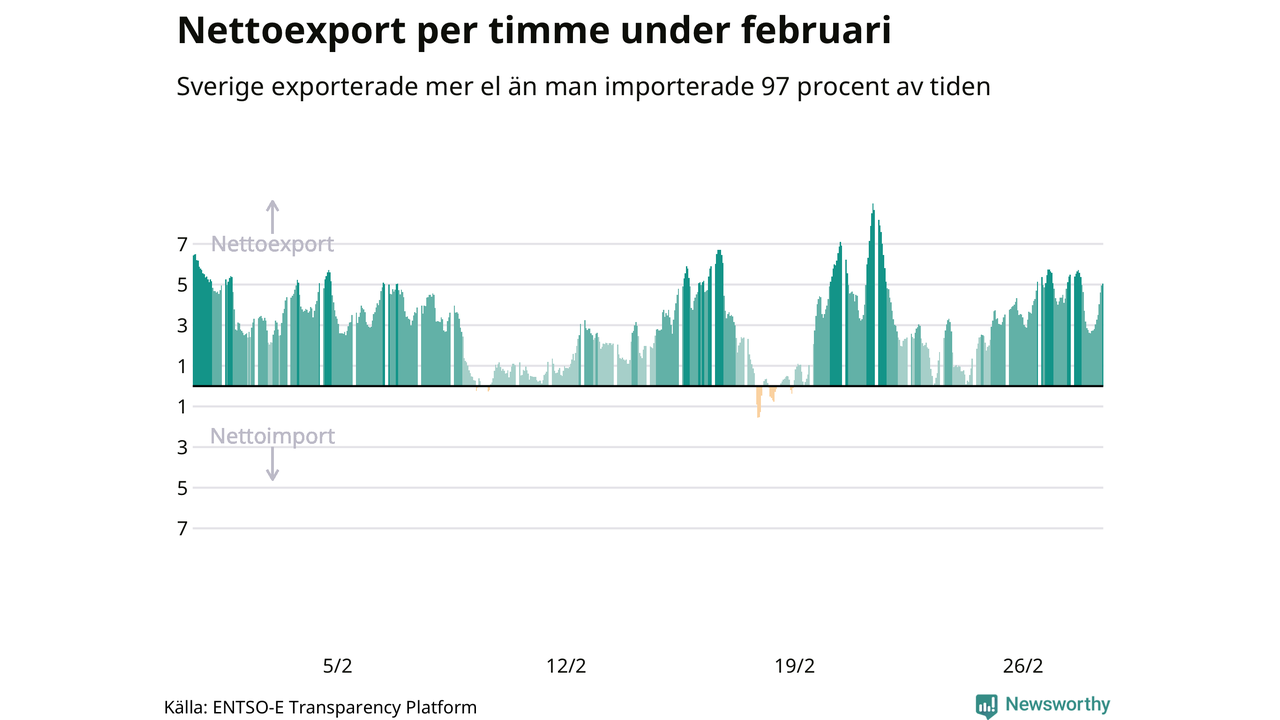Det produceras som sagt mer el i Sverige än det förbrukas, i alla fall om man tittar på månadsbasis – bara två månader under de senaste elva åren har Sverige importerat mer el än landet exporterat. Under kortare tidsperioder händer det att Sverige har nettoimport. Under februari importerade Sverige mer el än man exporterade under 20 timmar.
