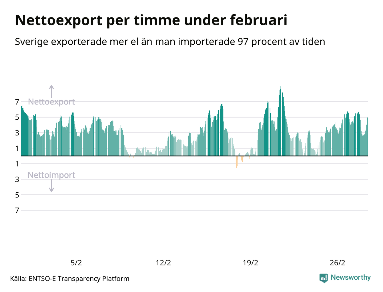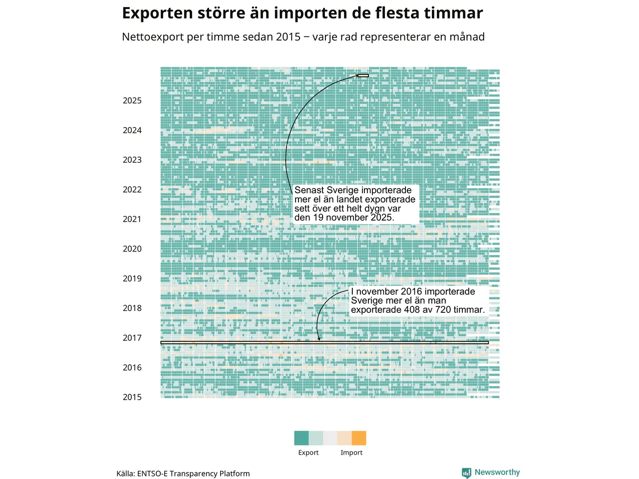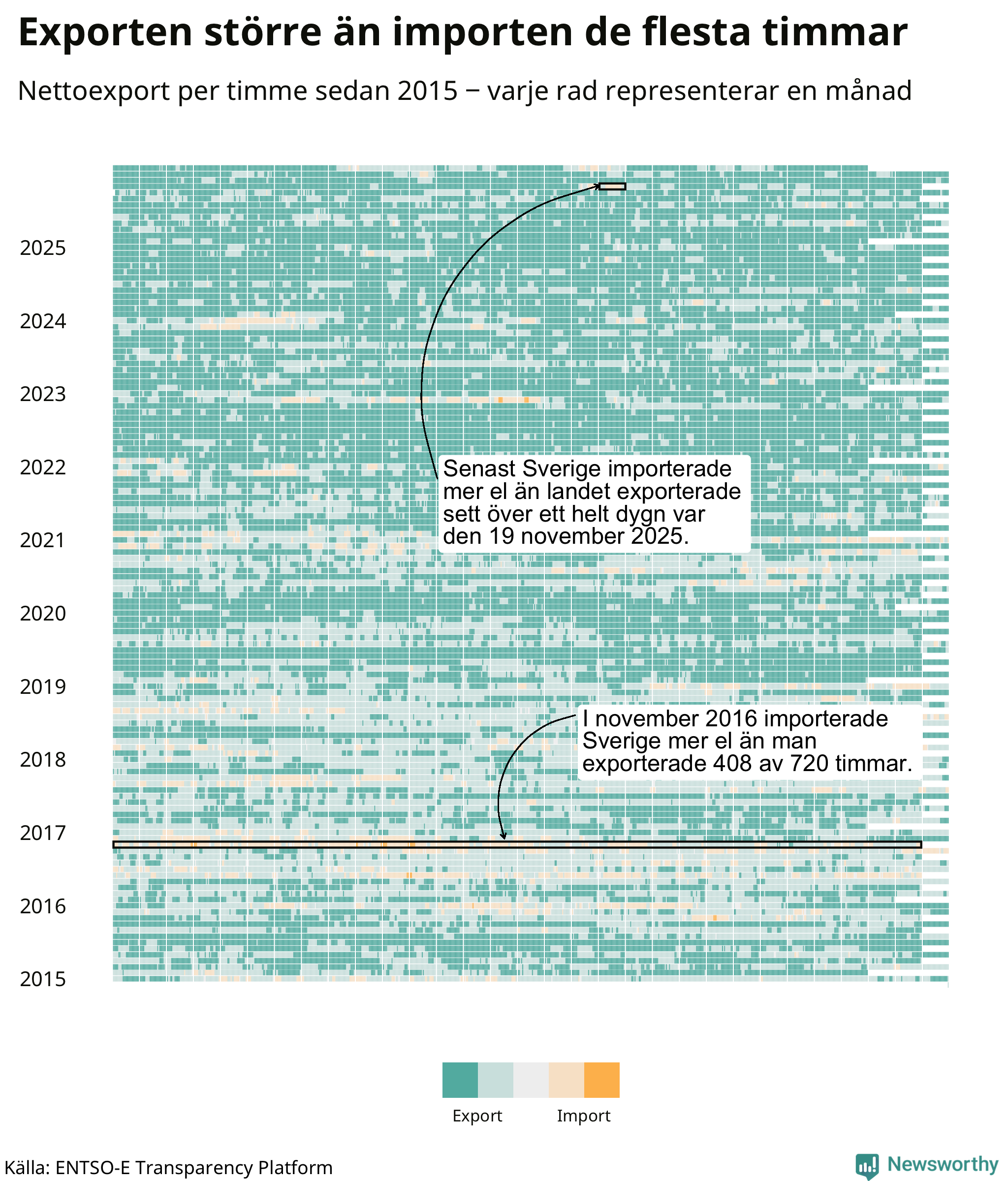 Det produceras som sagt mer el i Sverige än det förbrukas, i alla fall om man tittar på månadsbasis – bara två månader under de senaste elva åren har Sverige importerat mer el än landet exporterat. Under kortare tidsperioder händer det att Sverige har nettoimport. Under februari importerade Sverige mer el än man exporterade under 20 timmar.