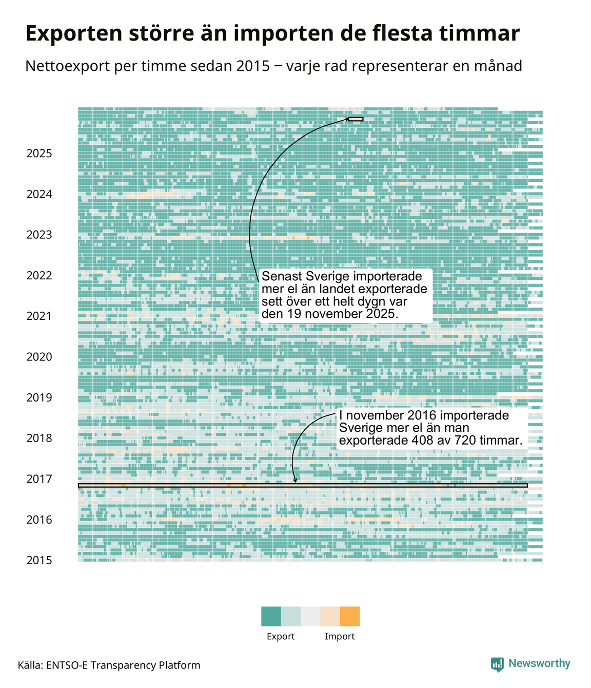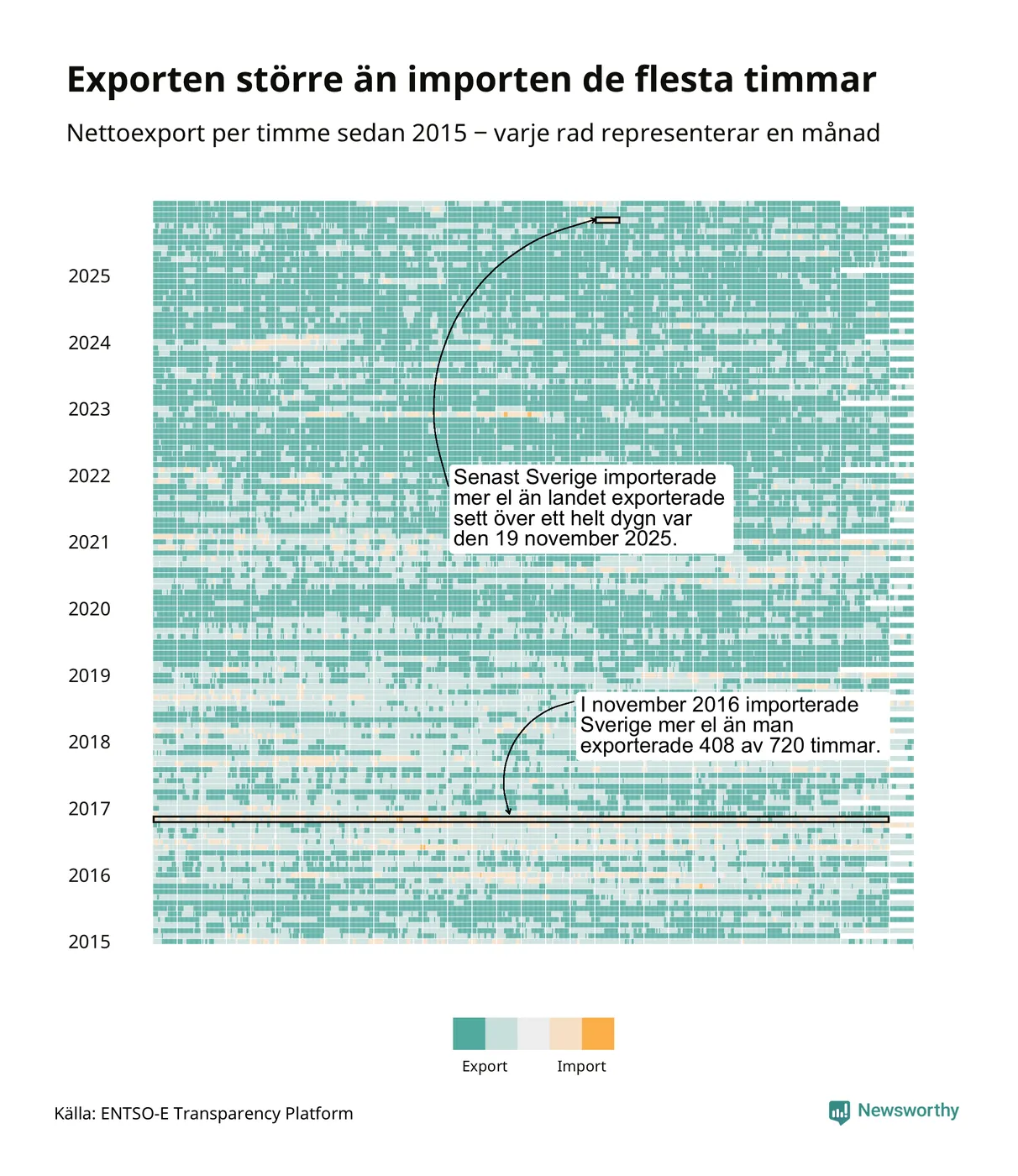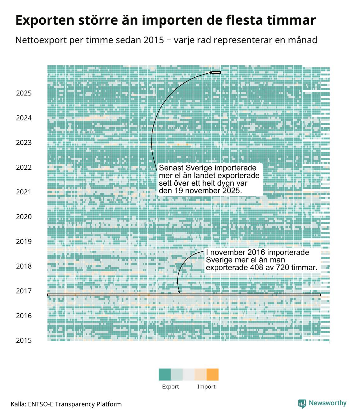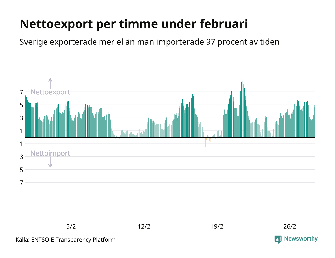 Det produceras som sagt mer el i Sverige än det förbrukas, i alla fall om man tittar på månadsbasis – bara två månader under de senaste elva åren har Sverige importerat mer el än landet exporterat. Under kortare tidsperioder händer det att Sverige har nettoimport. Under februari importerade Sverige mer el än man exporterade under 20 timmar.