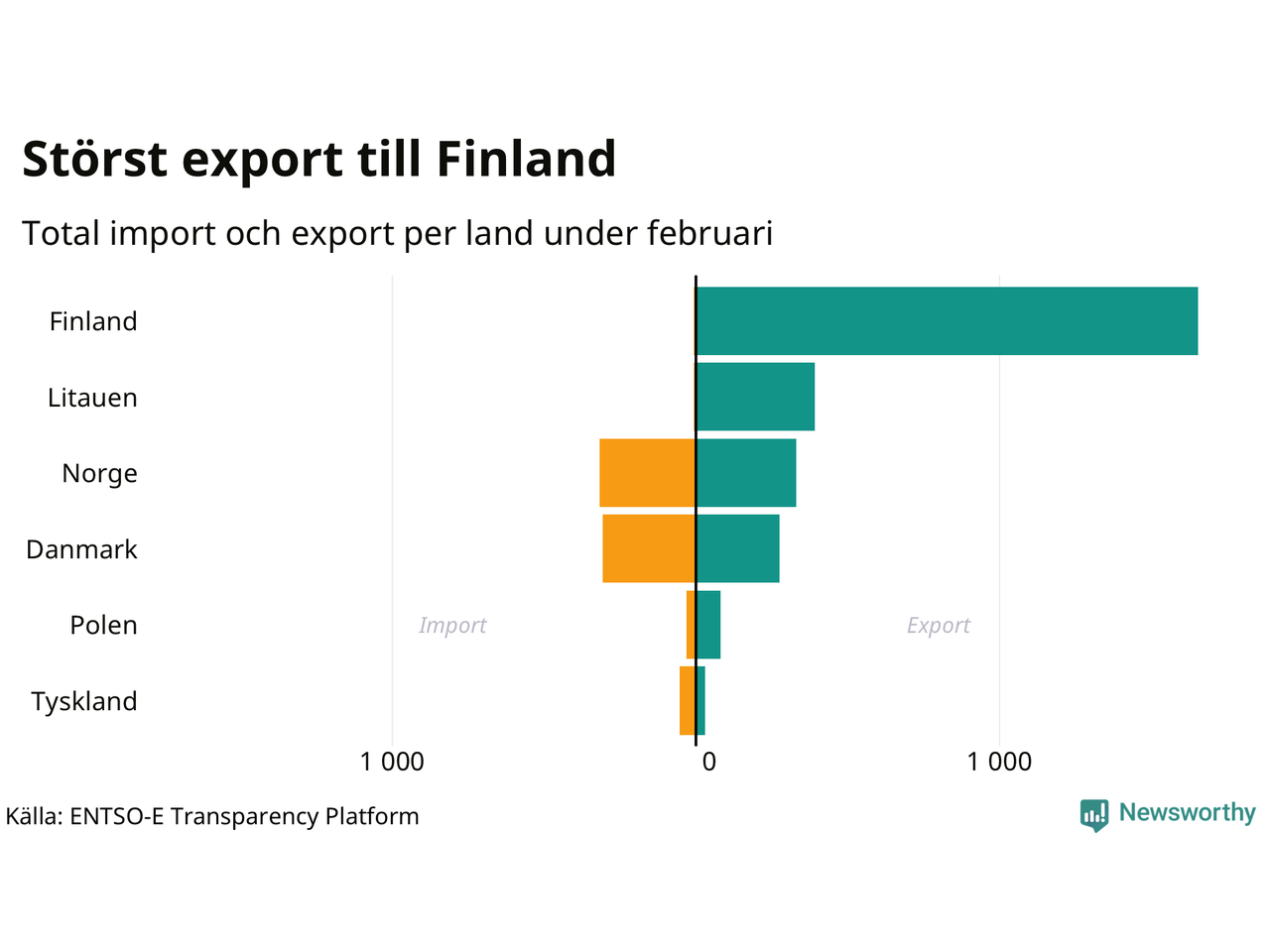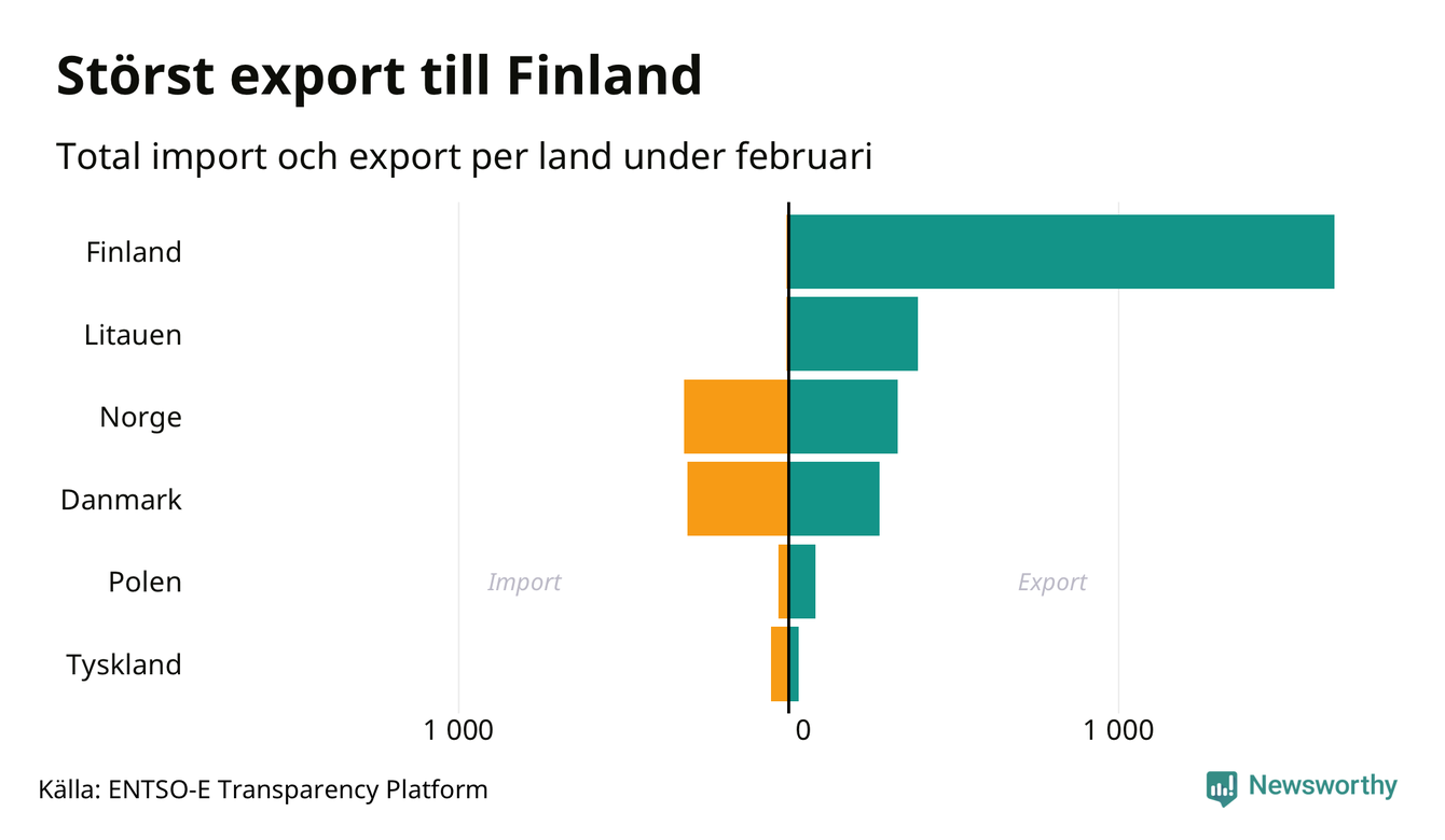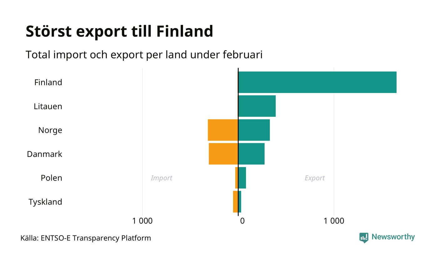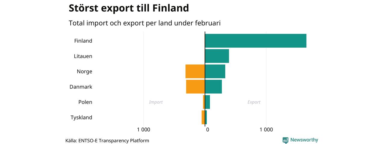 Under februari exporterade Sverige mest el till Finland, medan den största importen kom från Norge.