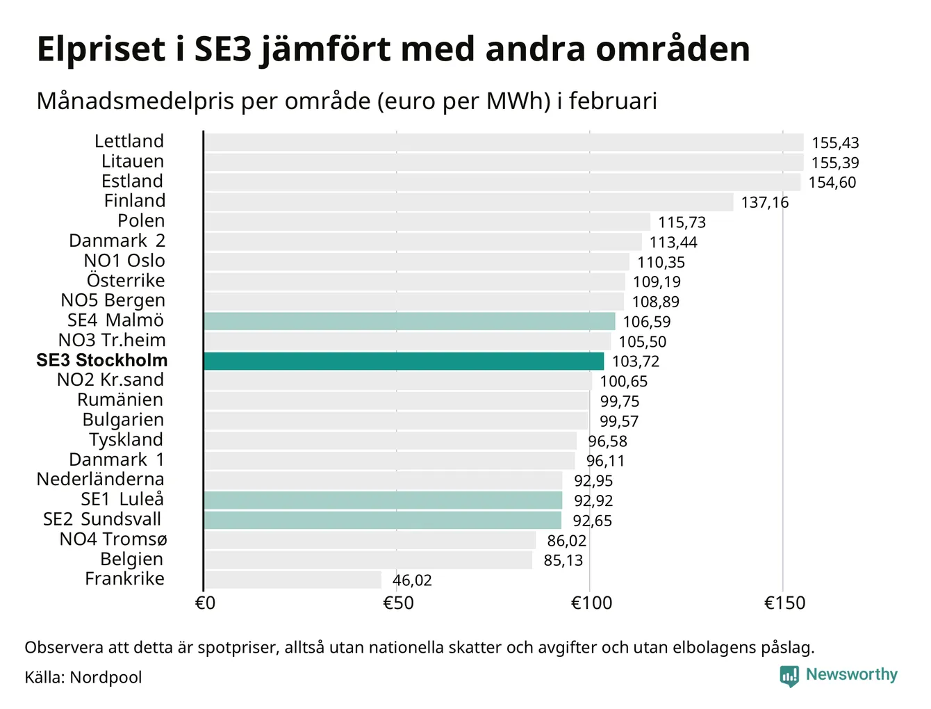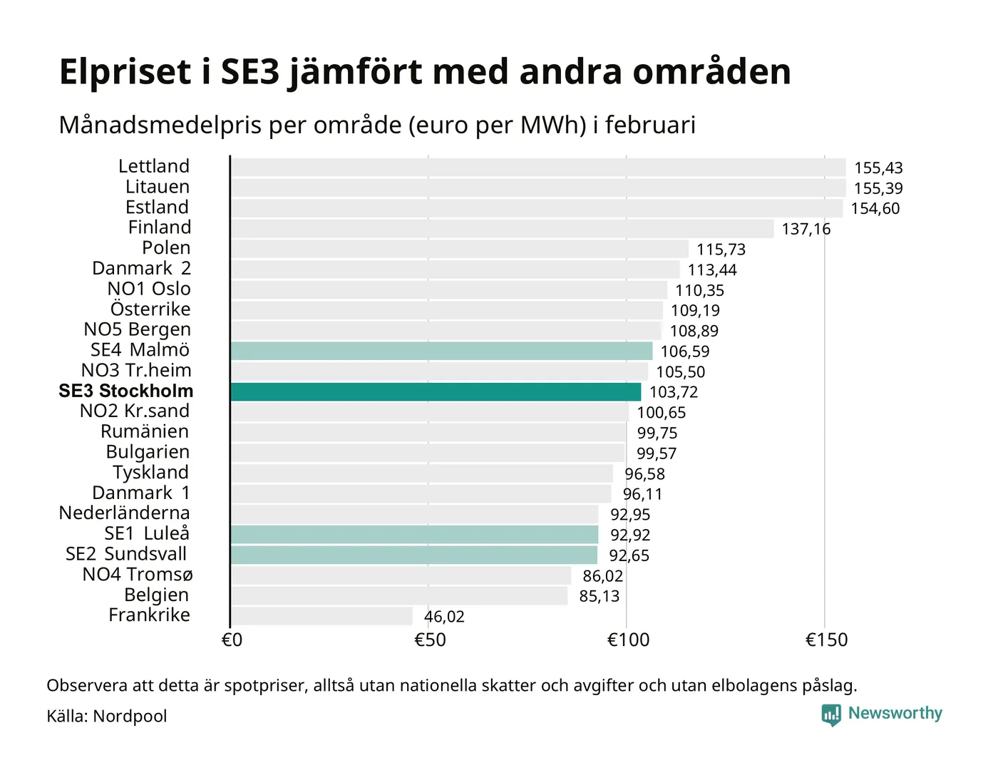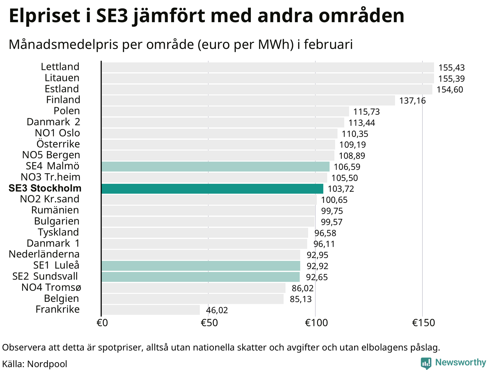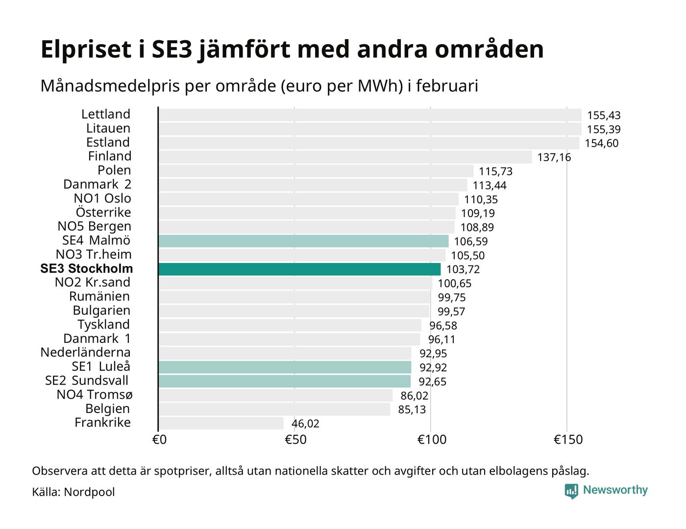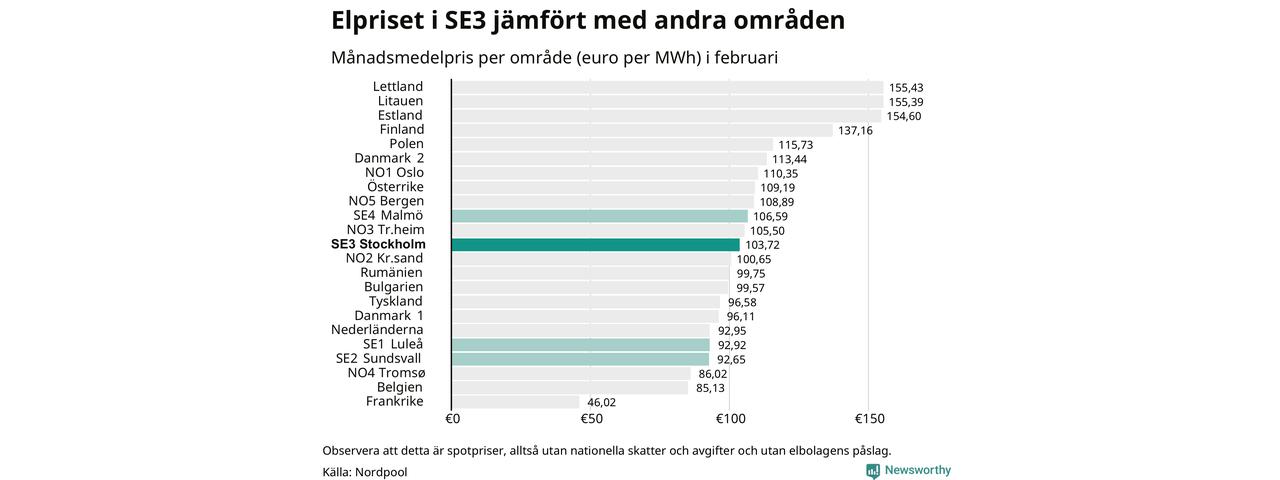 Om man tittar på månadsmedelpriset brukar de svenska elområdena oftast tillhöra de med lägst spotpriser i en europeisk jämförelse. Värt att notera är att detta handlar om spotpriser, de priser konsumenten sedan betalar beror på nationella avgifter och skatter samt elbolagens påslag. I praktiken ligger de svenska konsumentpriserna närmare det europeiska snittet efter skatter och påslag.