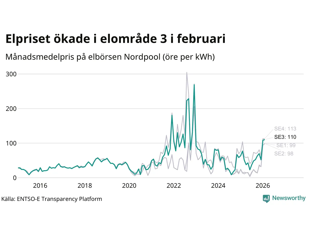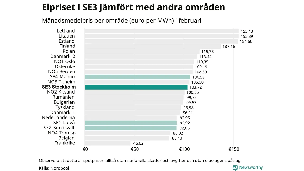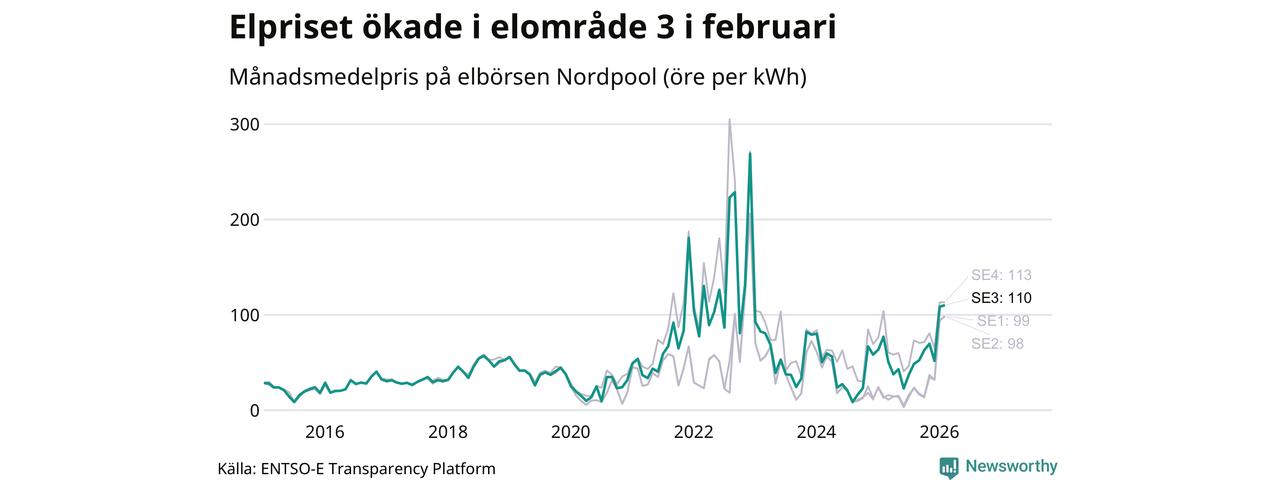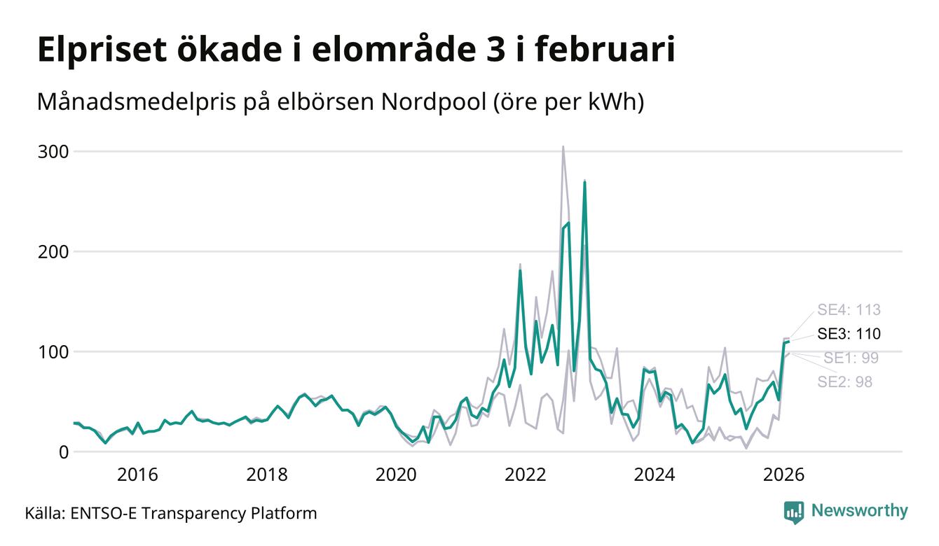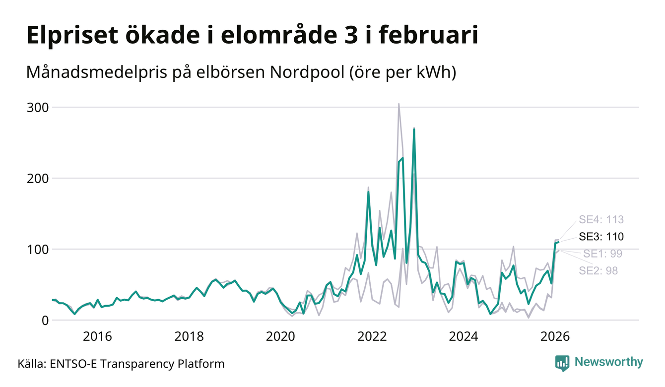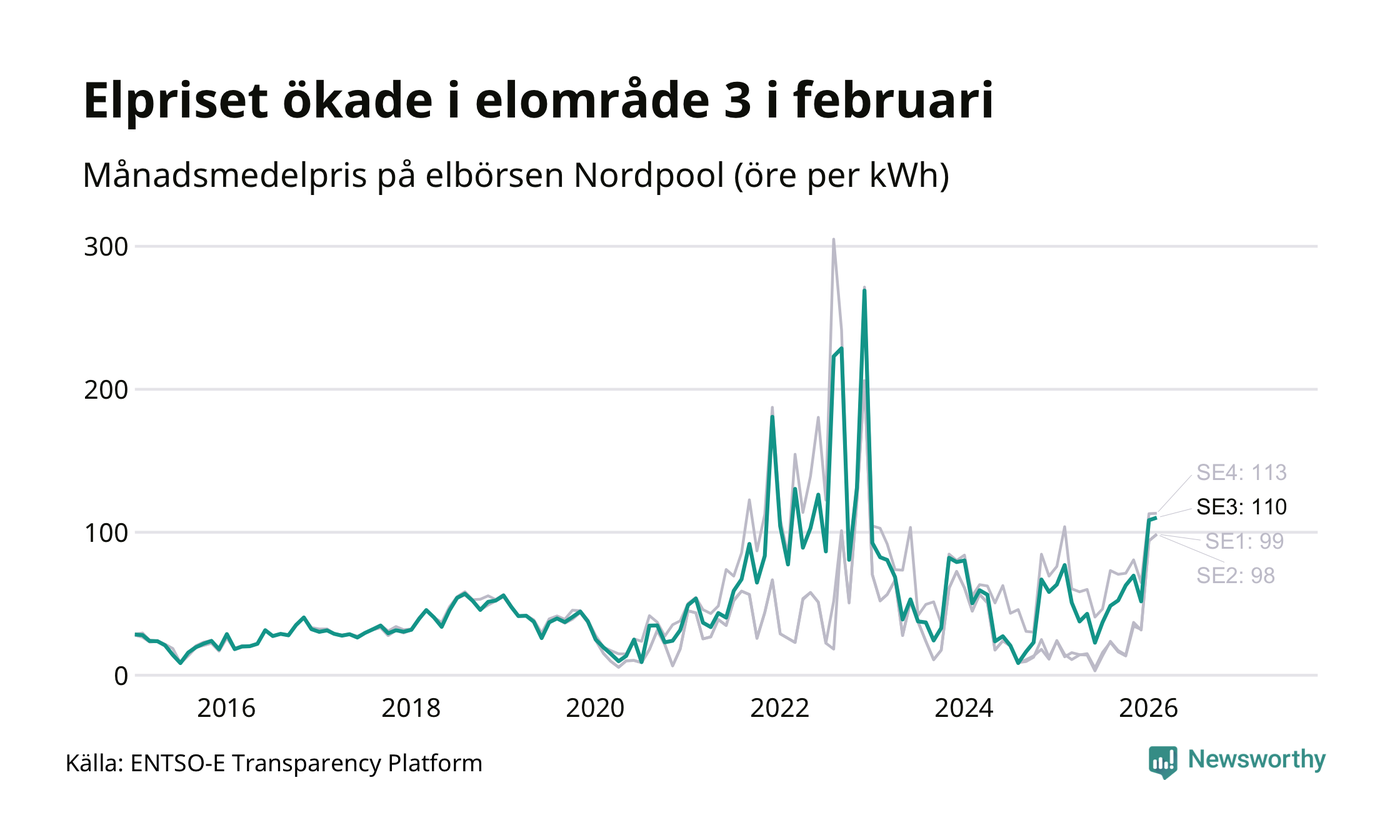 Spotpriset – alltså priset som elbolagen köper in elen för – gick upp i februari i elområde 3 som Sunne tillhör. Månadspriset var 110 öre per kilowattimme, vilket är 2 öre dyrare än i januari. Det är det högsta priset i området sedan december 2022, då snittet för månaden låg på 269 öre per kilowattimme – vilket är rekordet för området. För ett år sedan – i februari 2025 – kostade en kilowattimme 77 öre.