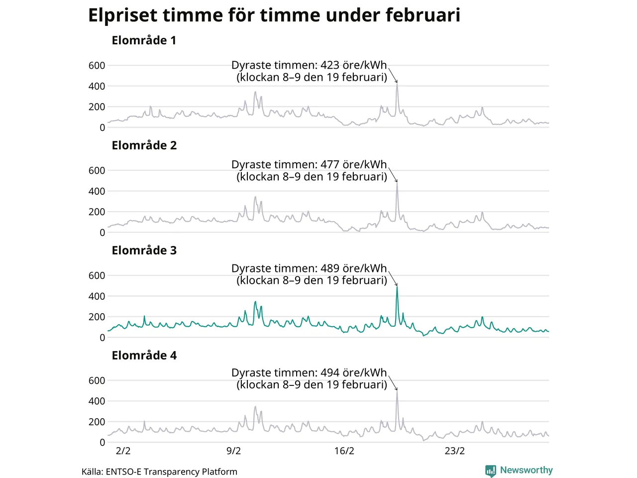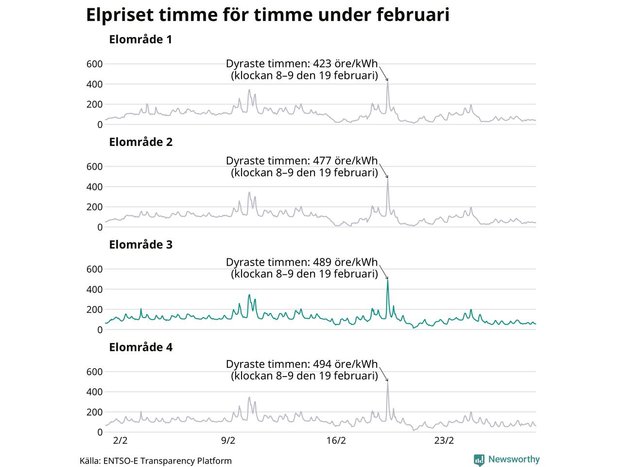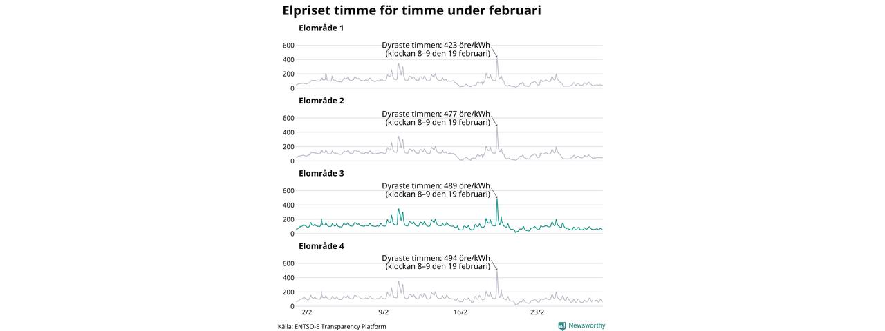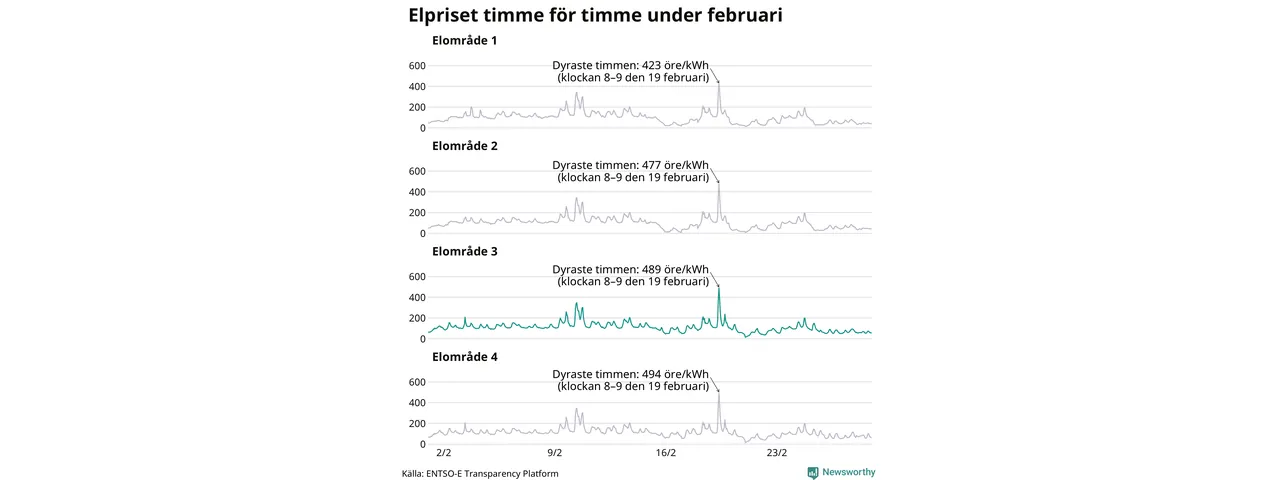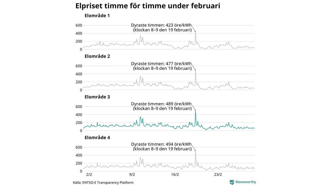 Det är inte bara prisskillnaderna mellan prisområdena som har ökat de senaste åren, även inom områdena pendlar priserna mer över tid. Sedan oktober sätts priserna varje kvart. Dyraste timmen i februari i Sunne inträffade mellan klockan 7 och 8 den 19 februari, då kostade en kilowattimme i snitt 489 öre. Som lägst var snittpriset per timme i området 14 öre.