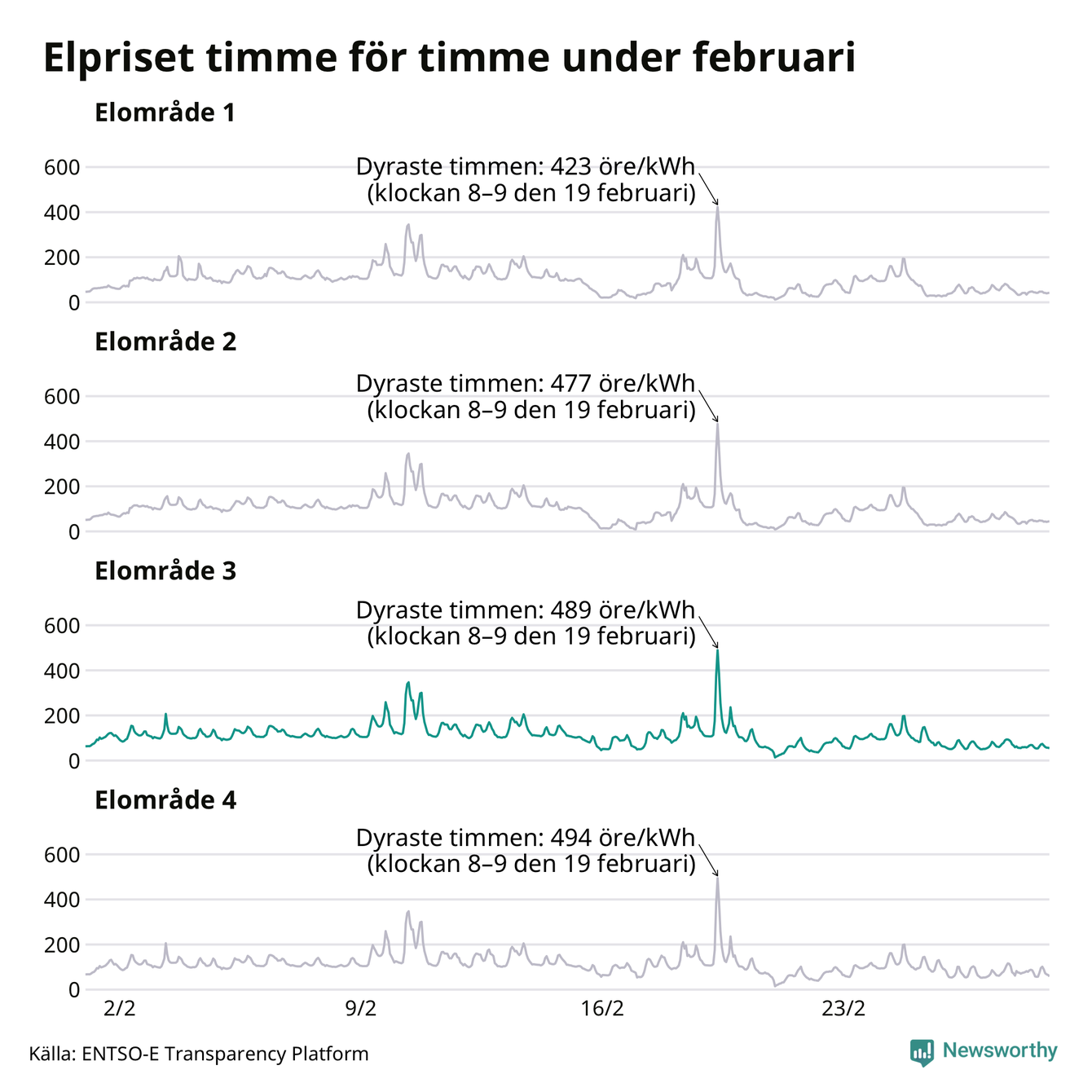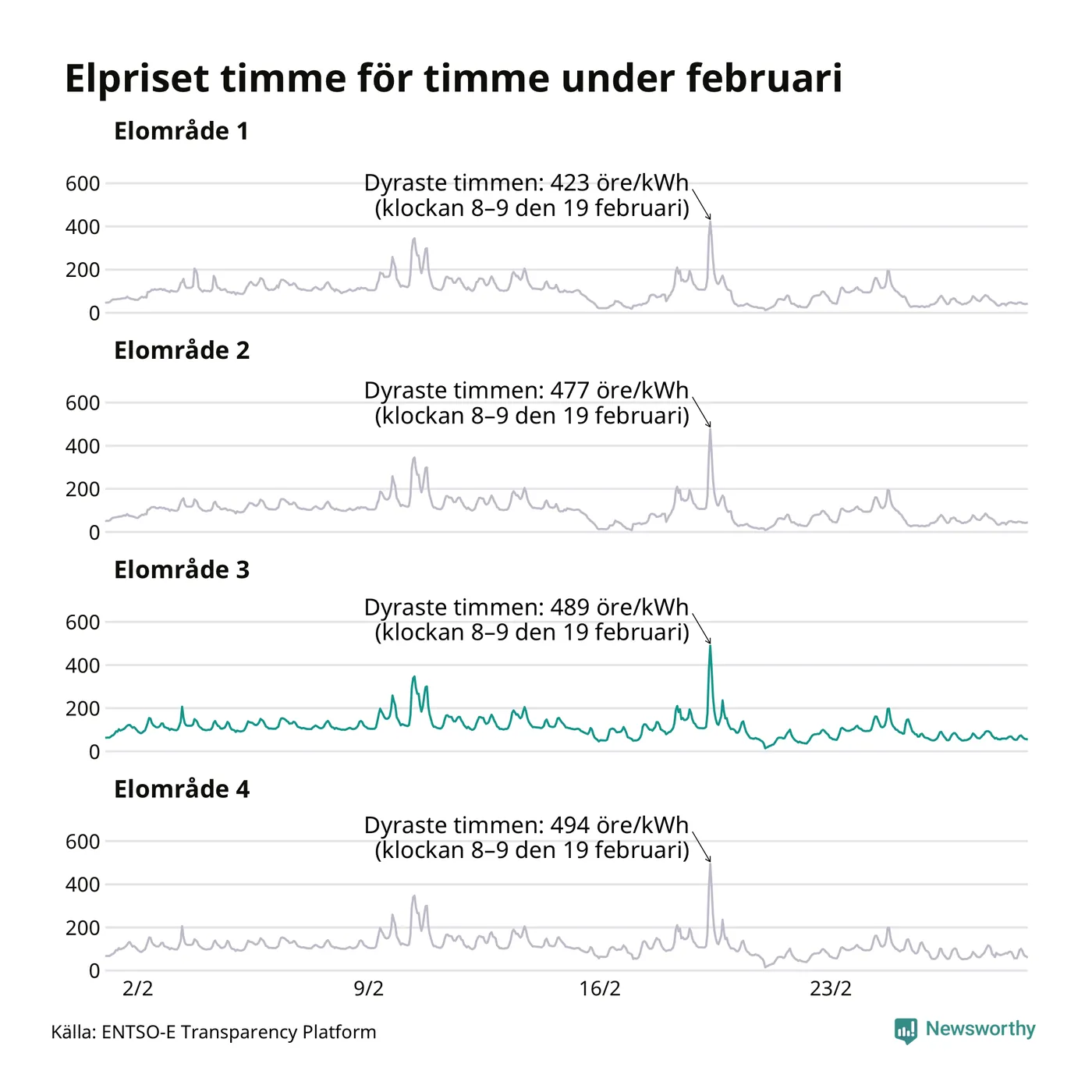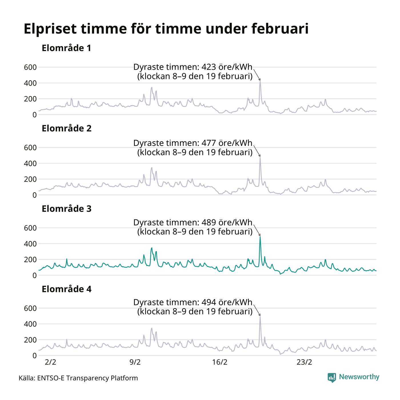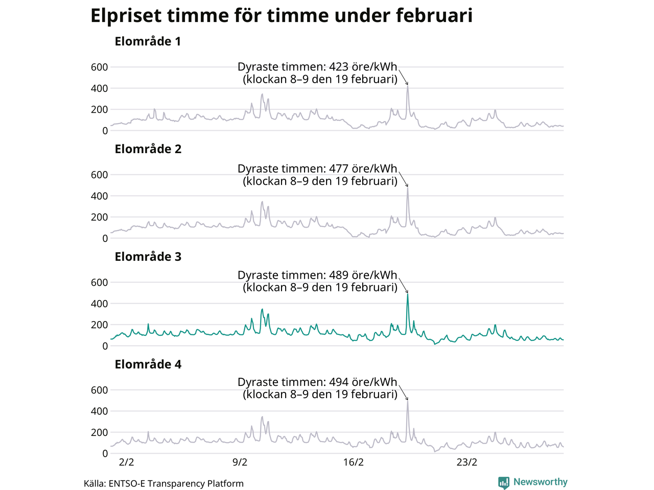 Det är inte bara prisskillnaderna mellan prisområdena som har ökat de senaste åren, även inom områdena pendlar priserna mer över tid. Sedan oktober sätts priserna varje kvart. Dyraste timmen i februari i Sunne inträffade mellan klockan 7 och 8 den 19 februari, då kostade en kilowattimme i snitt 489 öre. Som lägst var snittpriset per timme i området 14 öre.