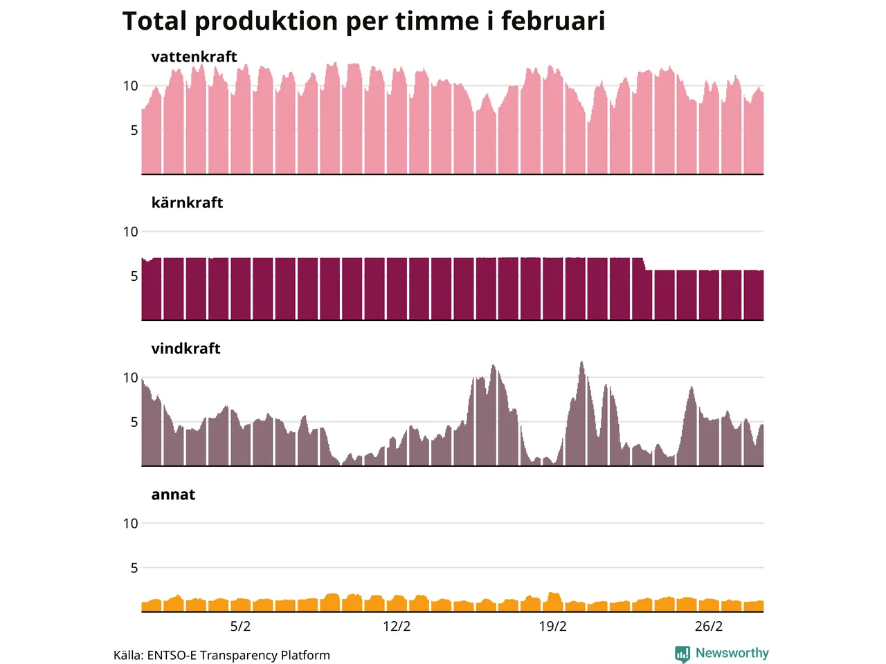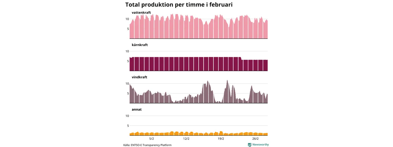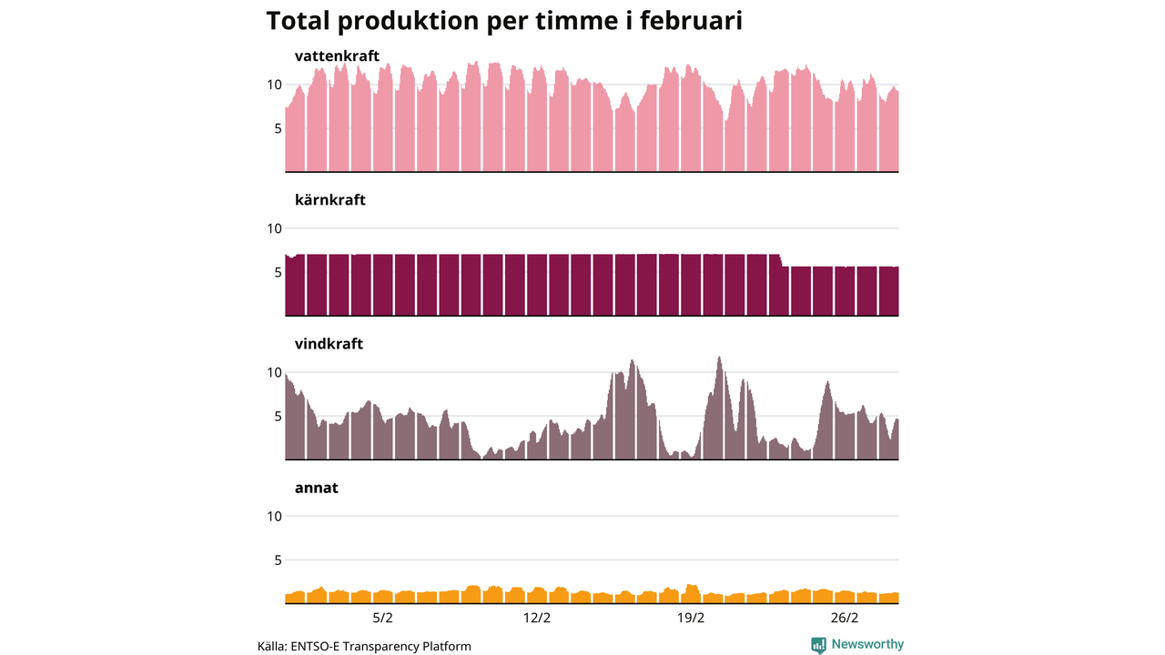 Produktionen av vindkraft är svår att planera, den är beroende av just vind. För att upprätthålla balansen justeras produktionen främst av vattenkraft – som förutom att användas som baskraft också kan startas och stoppas på kort tid och möta variationer i efterfrågan. Tittar man på produktionen timme för timme syns det i diagrammet här som en ”taggigare” kurva, medan kärnkraftsproduktionen ligger stabil över tid. Den 23 februari togs Oskarshamn 3 ur drift, på grund av att ventiler behöver kontrolleras. Reaktorn väntas tas i drift i slutet av mars igen.