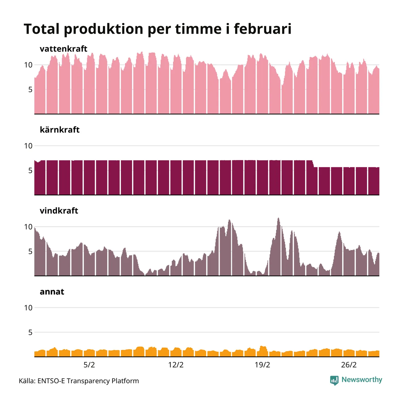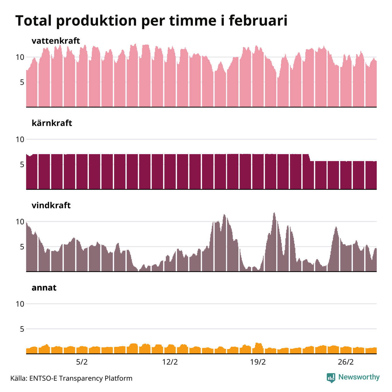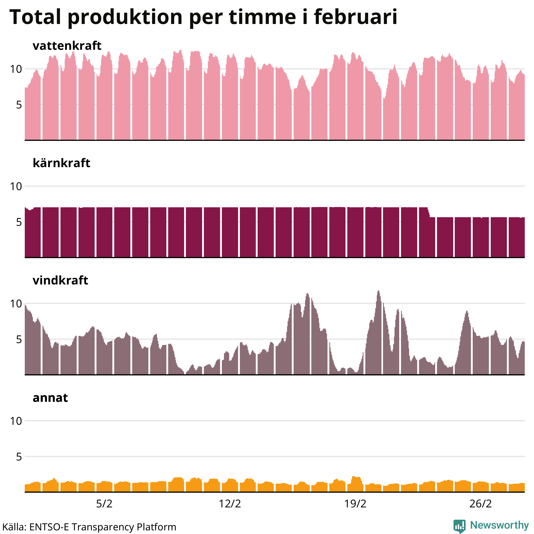 Produktionen av vindkraft är svår att planera, den är beroende av just vind. För att upprätthålla balansen justeras produktionen främst av vattenkraft – som förutom att användas som baskraft också kan startas och stoppas på kort tid och möta variationer i efterfrågan. Tittar man på produktionen timme för timme syns det i diagrammet här som en ”taggigare” kurva, medan kärnkraftsproduktionen ligger stabil över tid. Den 23 februari togs Oskarshamn 3 ur drift, på grund av att ventiler behöver kontrolleras. Reaktorn väntas tas i drift i slutet av mars igen.
