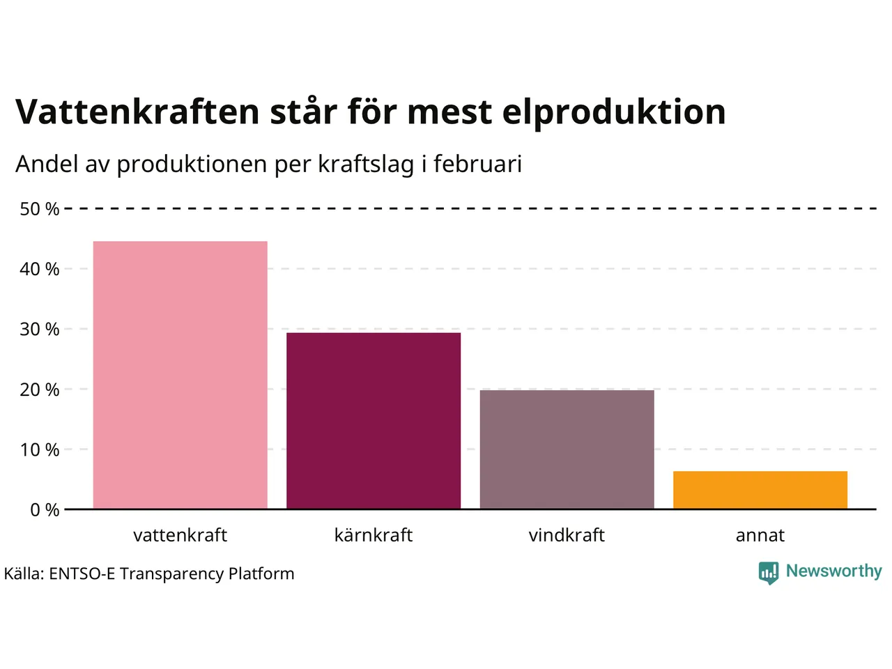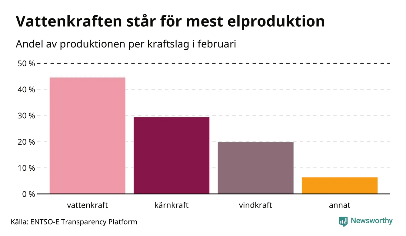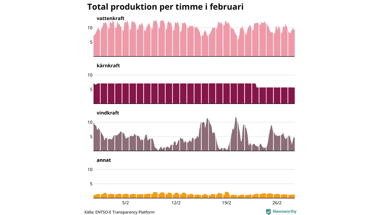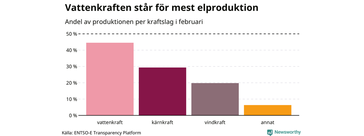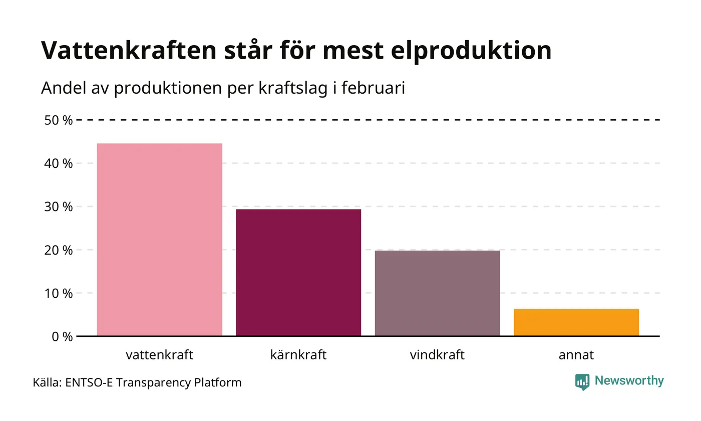 Enligt de preliminära siffrorna kom ungefär 45 procent av elproduktionen under februari från vattenkraft, ungefär 29 procent från kärnkraft och runt 20 procent från vindkraft.