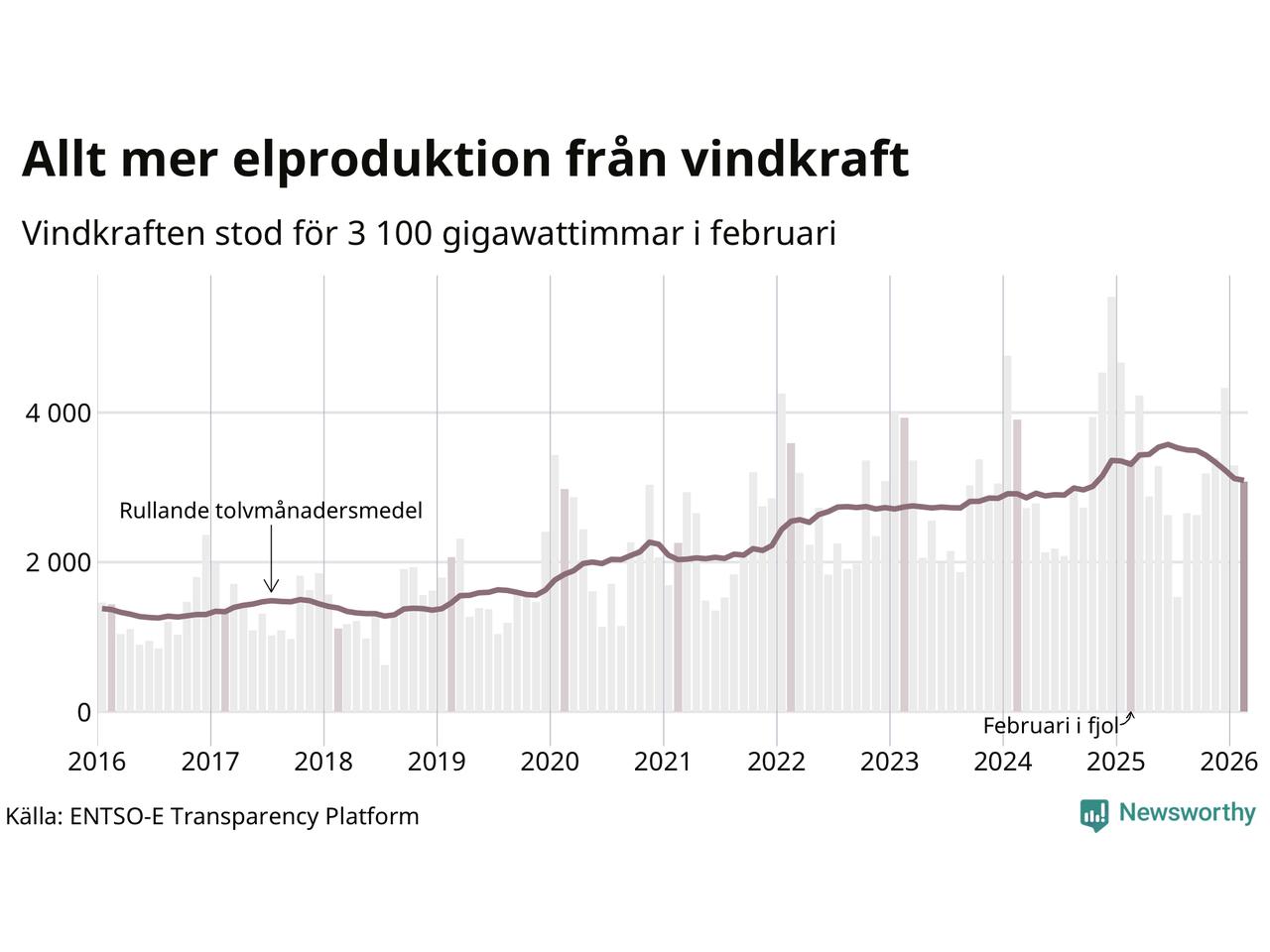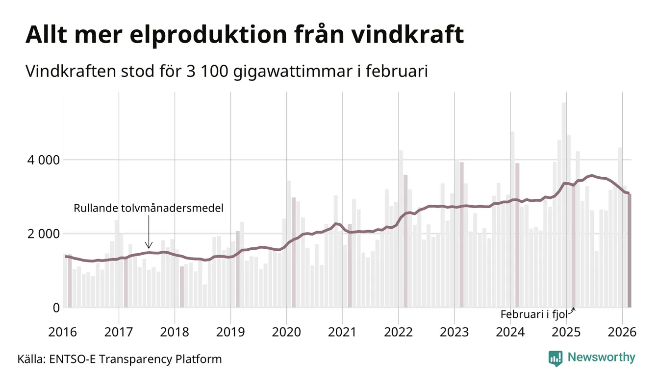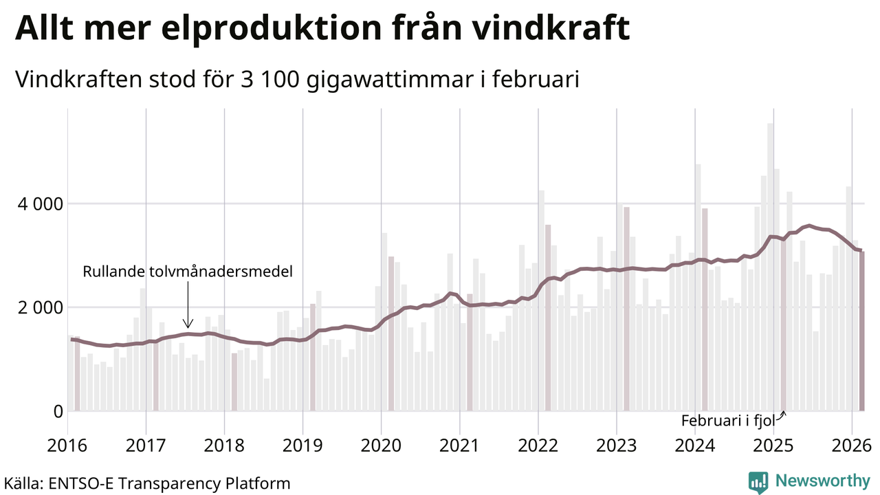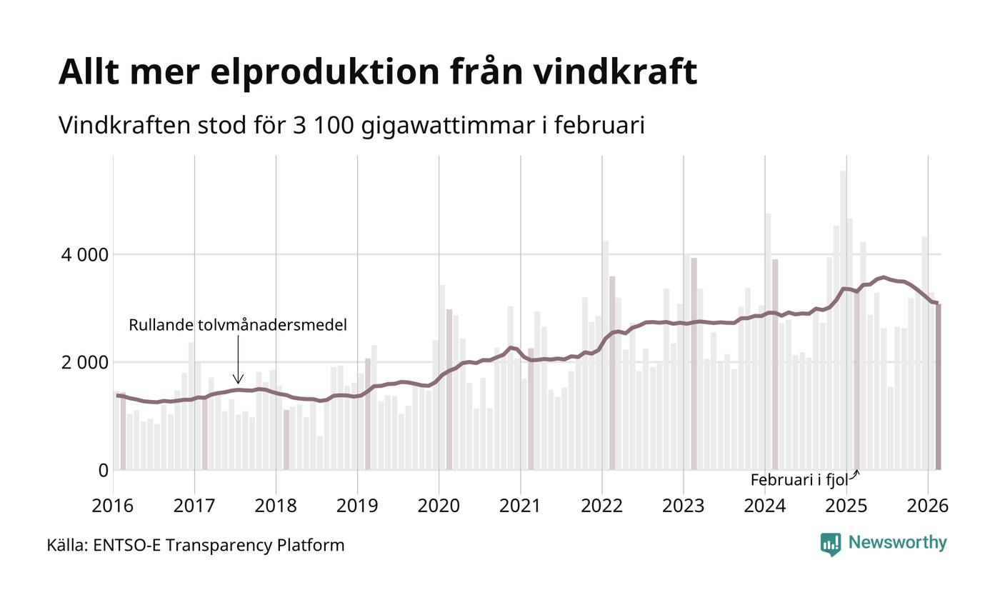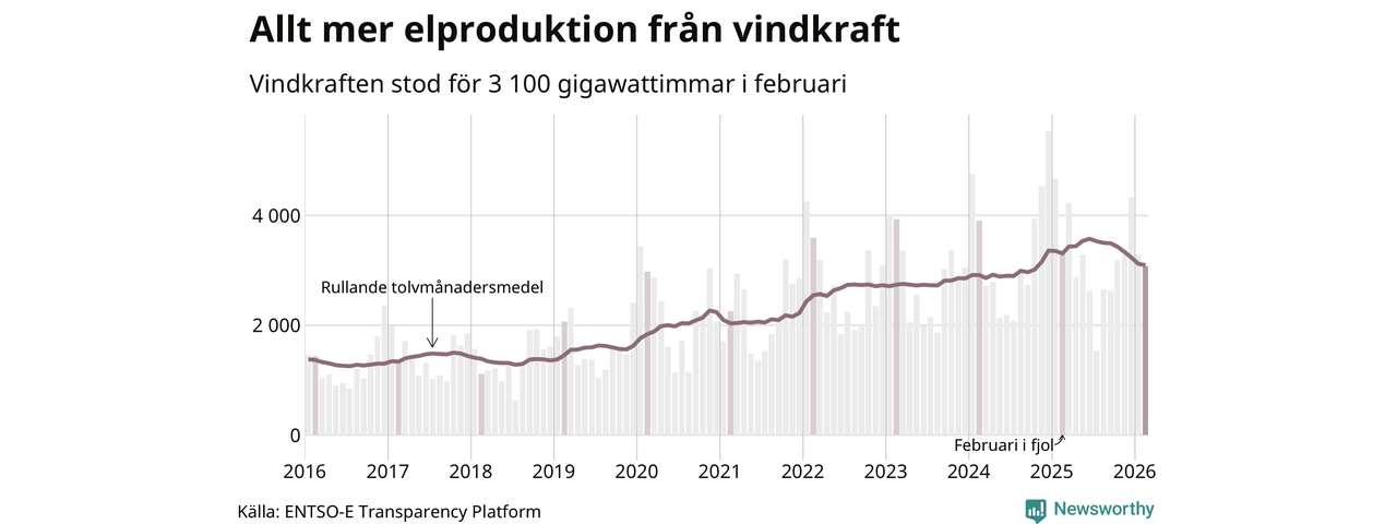 Vindkraften stod alltså för cirka 20 procent av elproduktionen i februari. Det motsvarar ungefär 3 100 gigawattimmar, vilket är mindre än samma månad i fjol. Det är den minsta vindkraftproduktionen under en februarimånad sedan 2021. Och tittar man på hela året har vindkraften producerat färre gigawattimmar än året innan (−6,5 procent). Jämfört med för fem år sedan har snittproduktionen från vindkraft ökat med runt 50 procent.