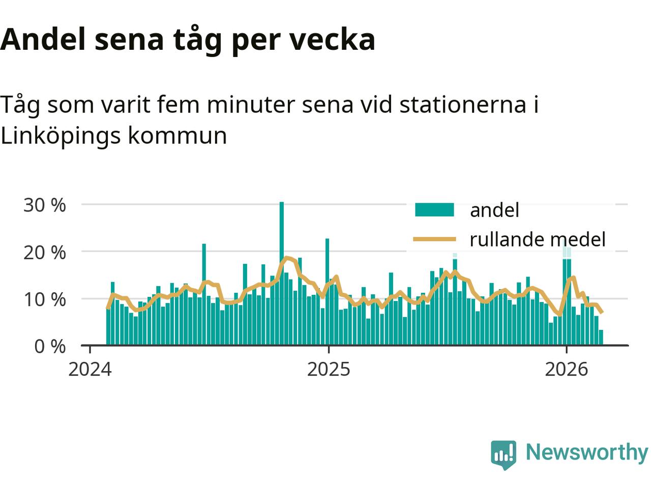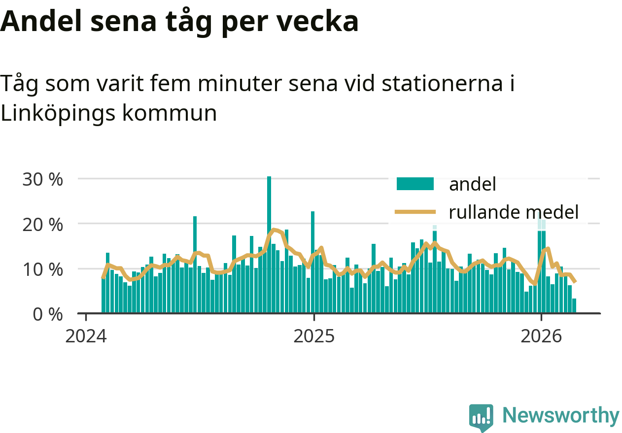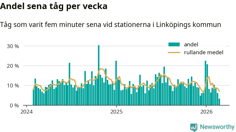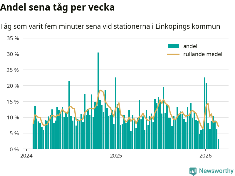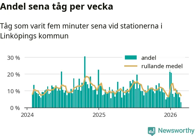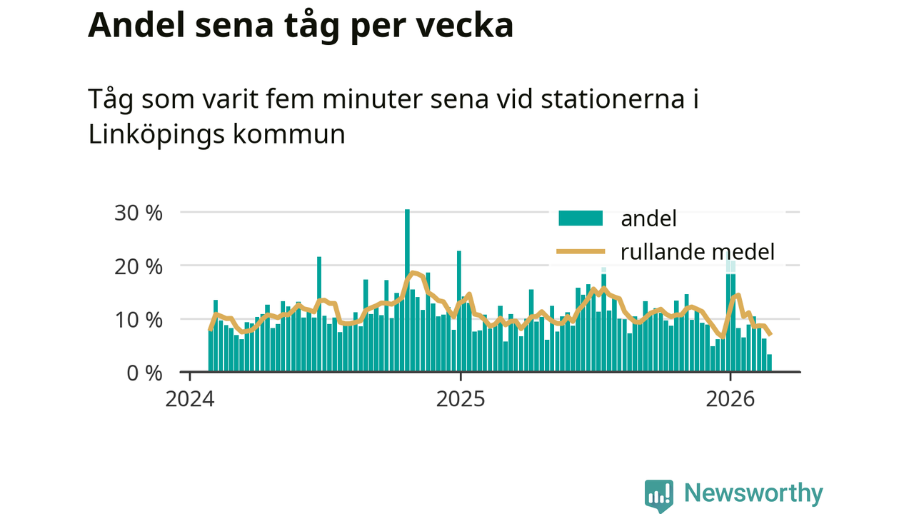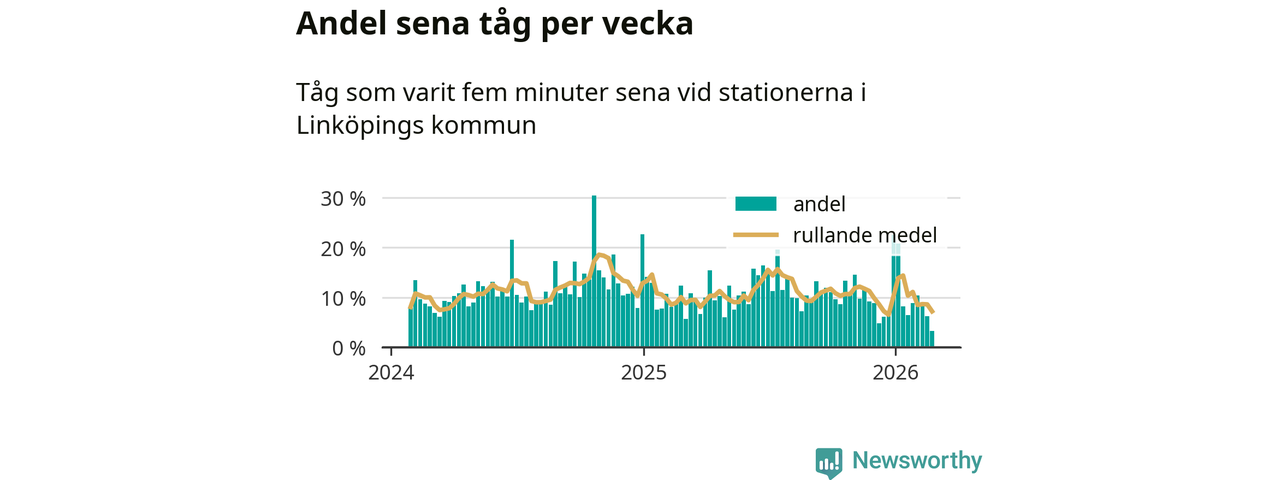 Bara tre procent av tågen var sena när de passerade någon av de 4 stationerna i Linköping under vecka 9. Det är en ovanligt låg siffra. En genomsnittlig vecka är motsvarande siffra elva procent,