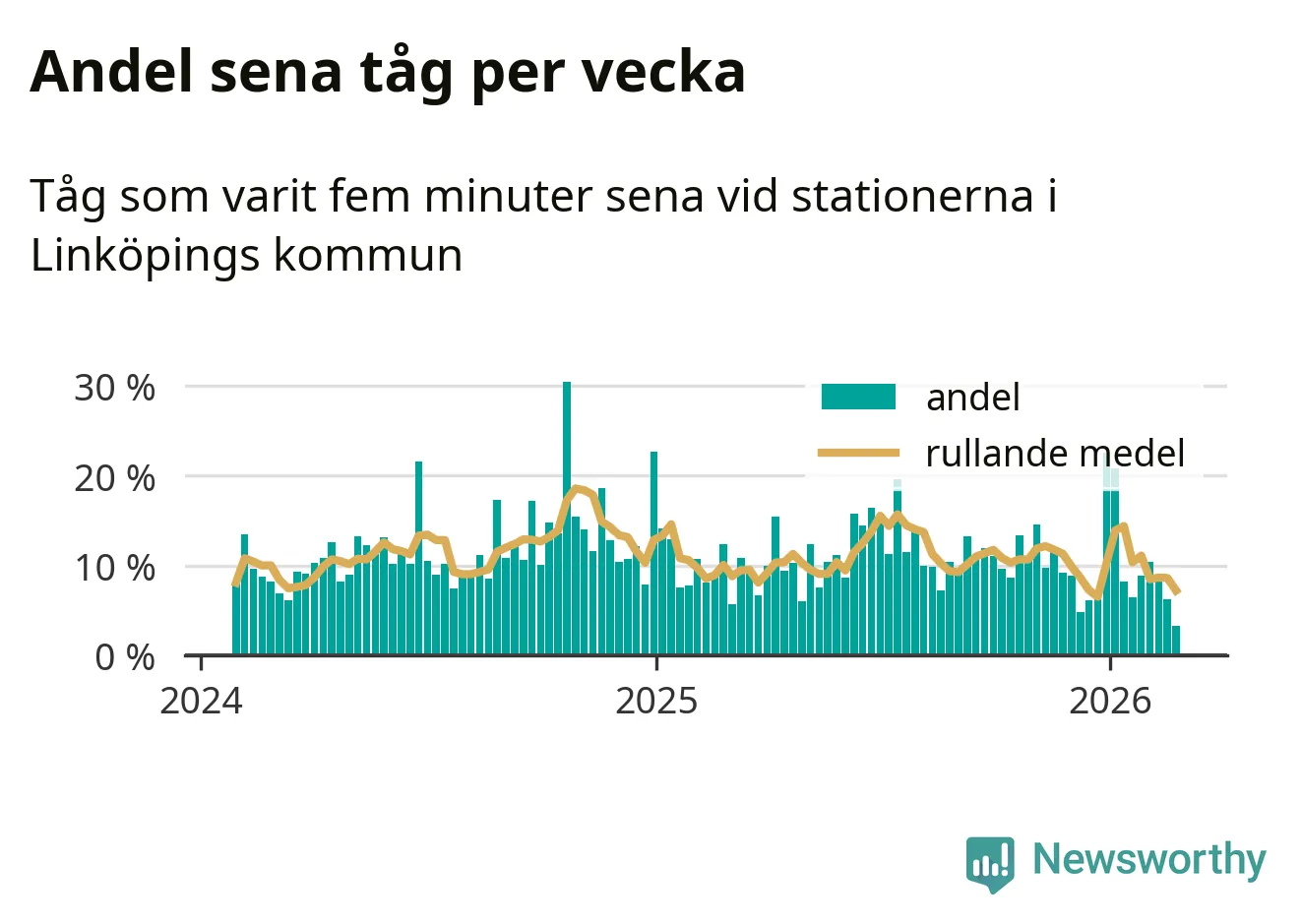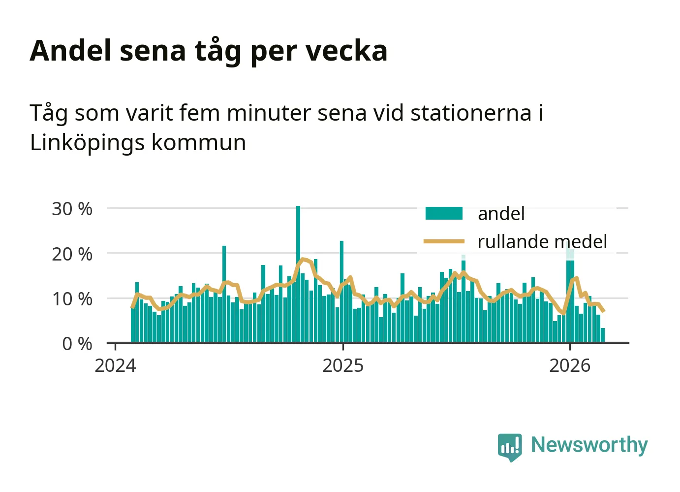 har andelen sena tåg varit 9 procent.