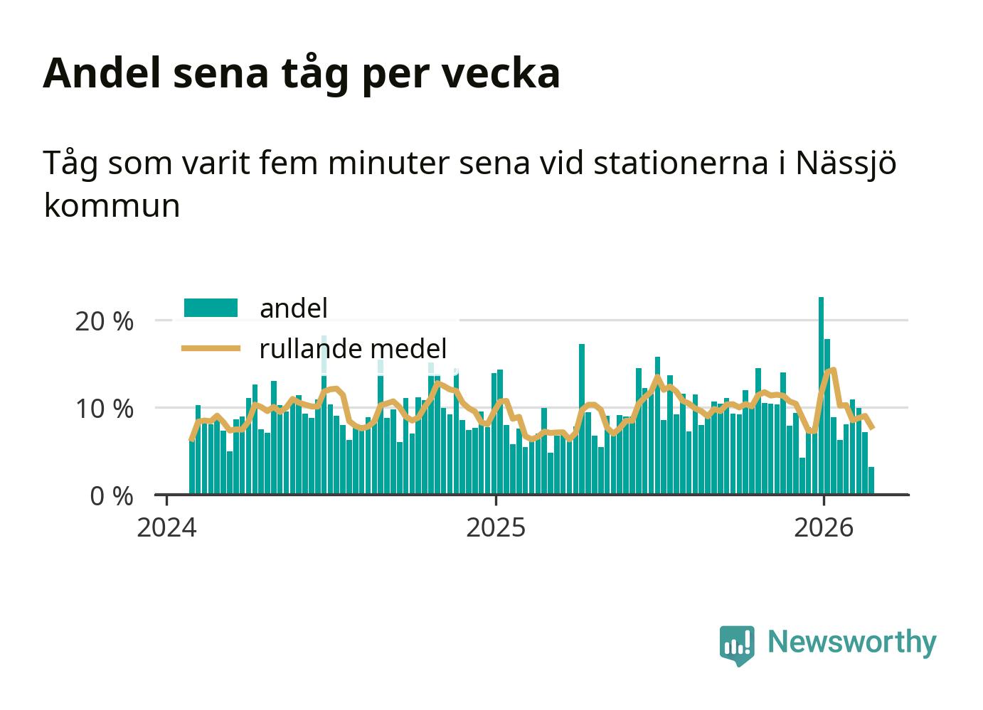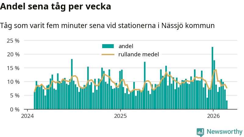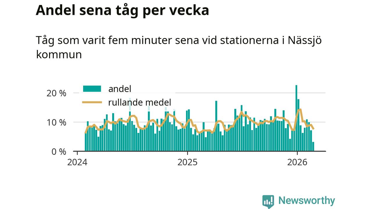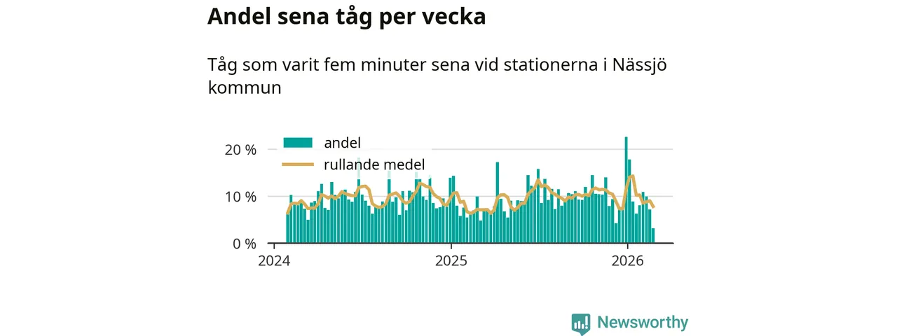 Bara tre procent av tågen var sena när de passerade någon av de 7 stationerna i Nässjö under vecka 9. Det är en ovanligt låg siffra. En genomsnittlig vecka är motsvarande siffra tio procent,
