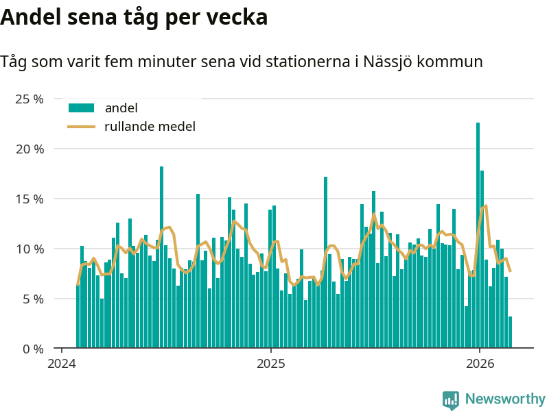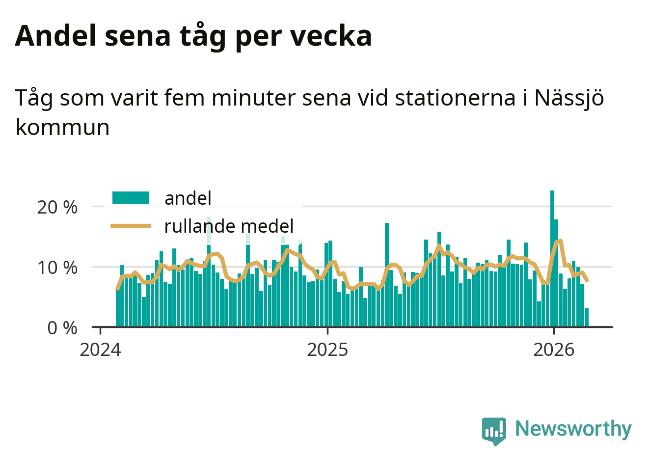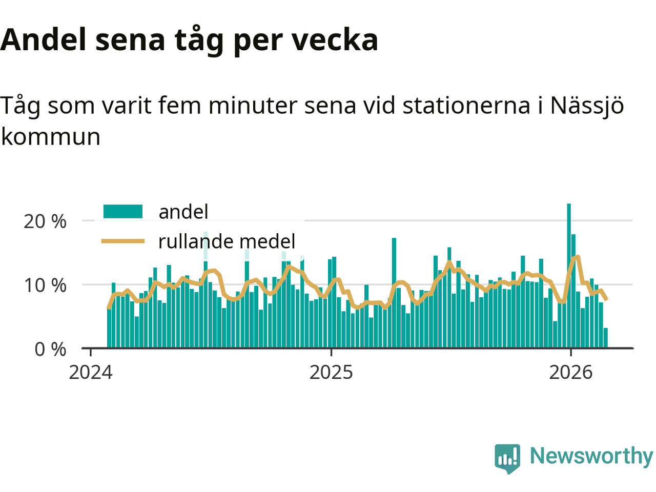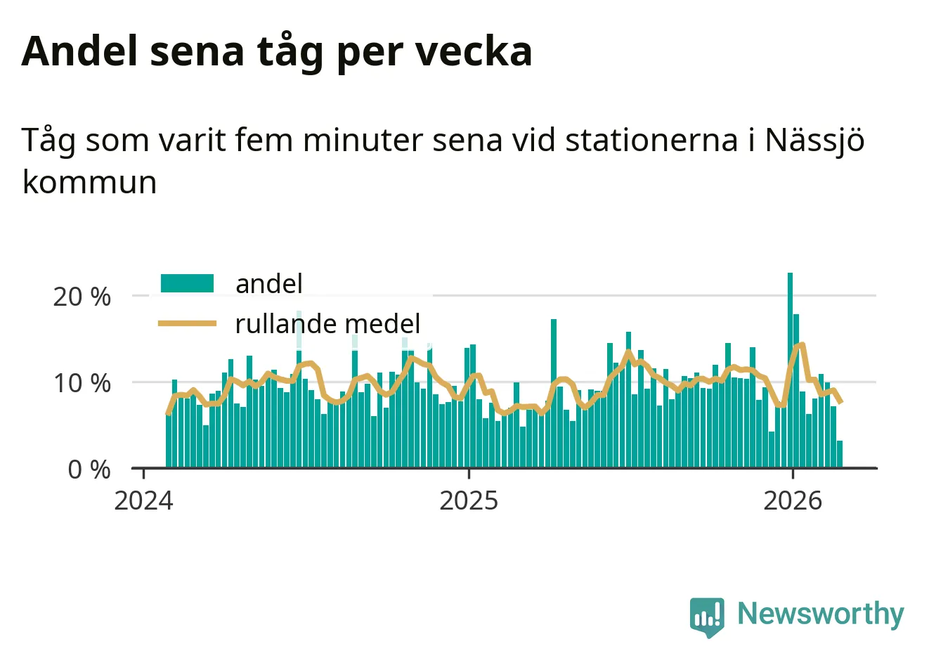 Bara tre procent av tågen var sena när de passerade någon av de 7 stationerna i Nässjö under vecka 9. Det är en ovanligt låg siffra. En genomsnittlig vecka är motsvarande siffra tio procent,