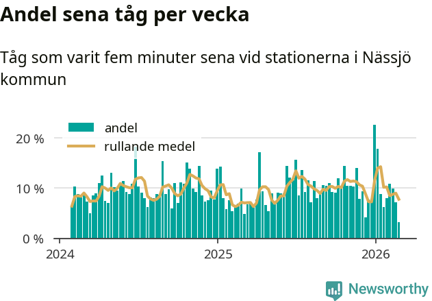 Stationerna i Nässjö hör till dem som oftast har relativt få och små förseningar. En genomsnittlig vecka är alltså 10 procent