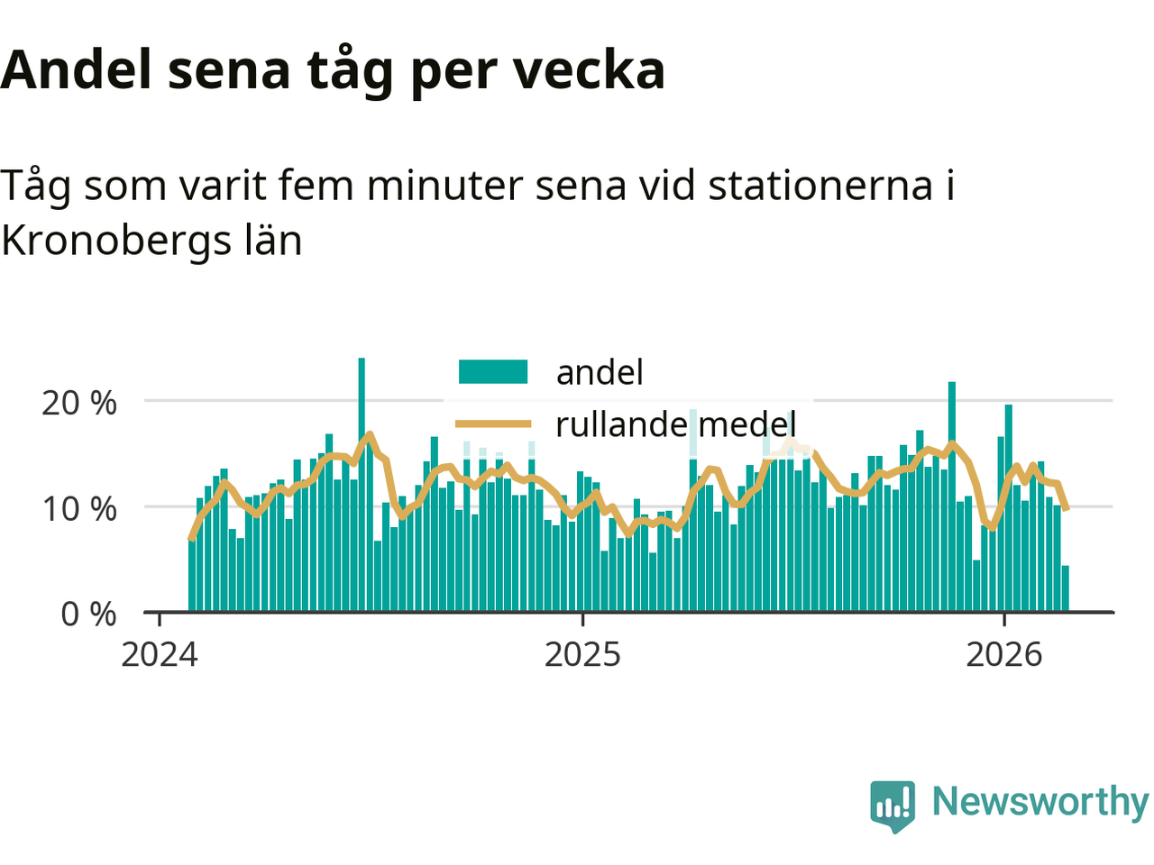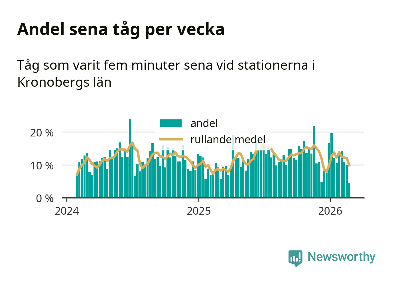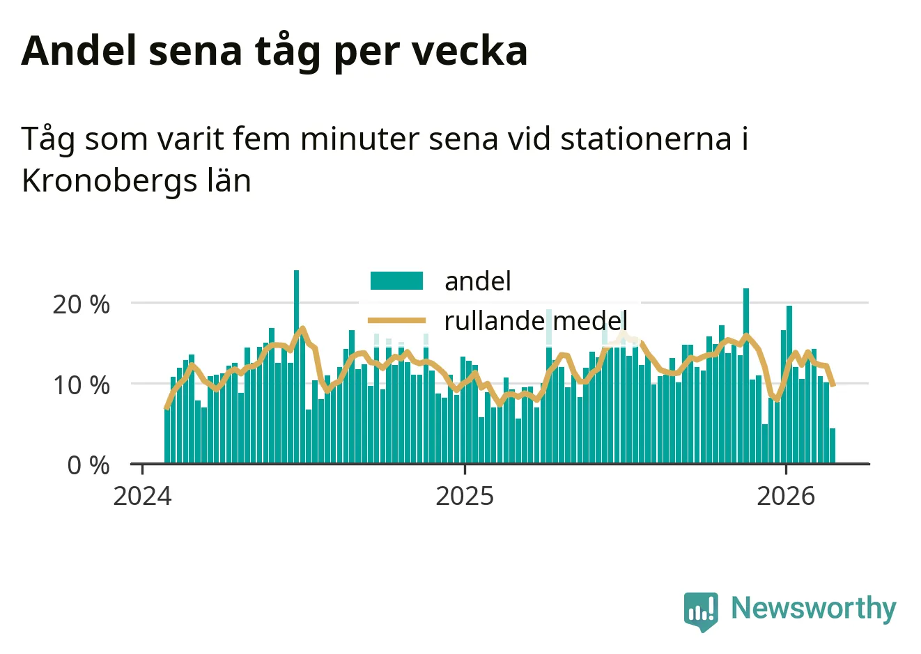 Bara fyra procent av tågen var sena när de passerade någon av de 11 stationerna i Kronoberg under vecka 9. Det är en ovanligt låg siffra. En genomsnittlig vecka är motsvarande siffra tolv procent,