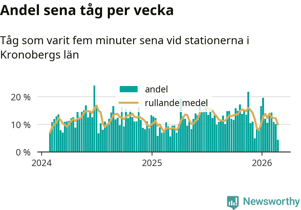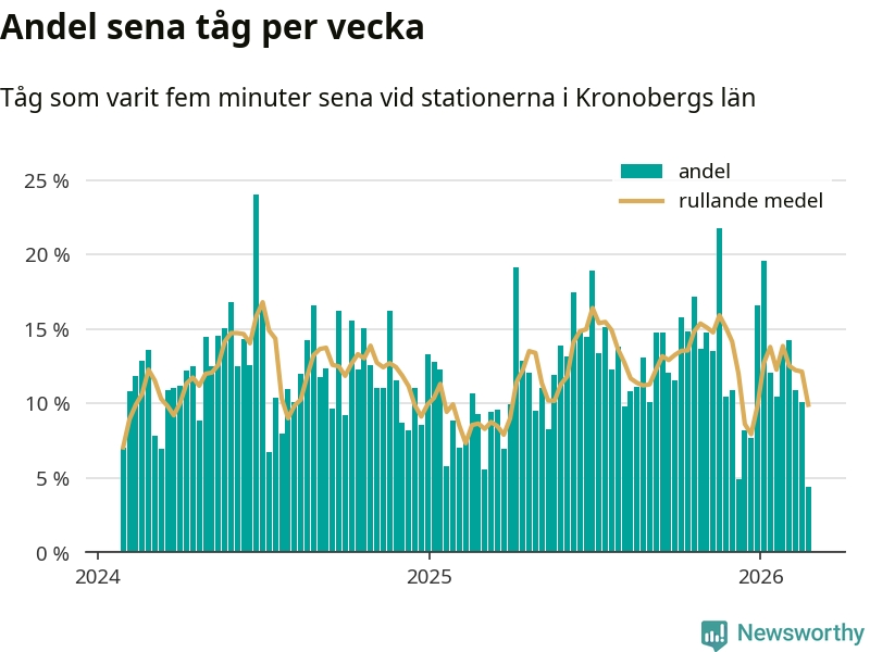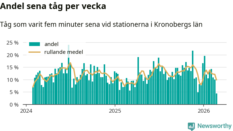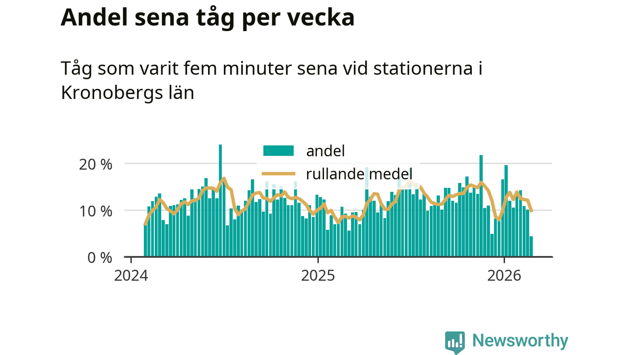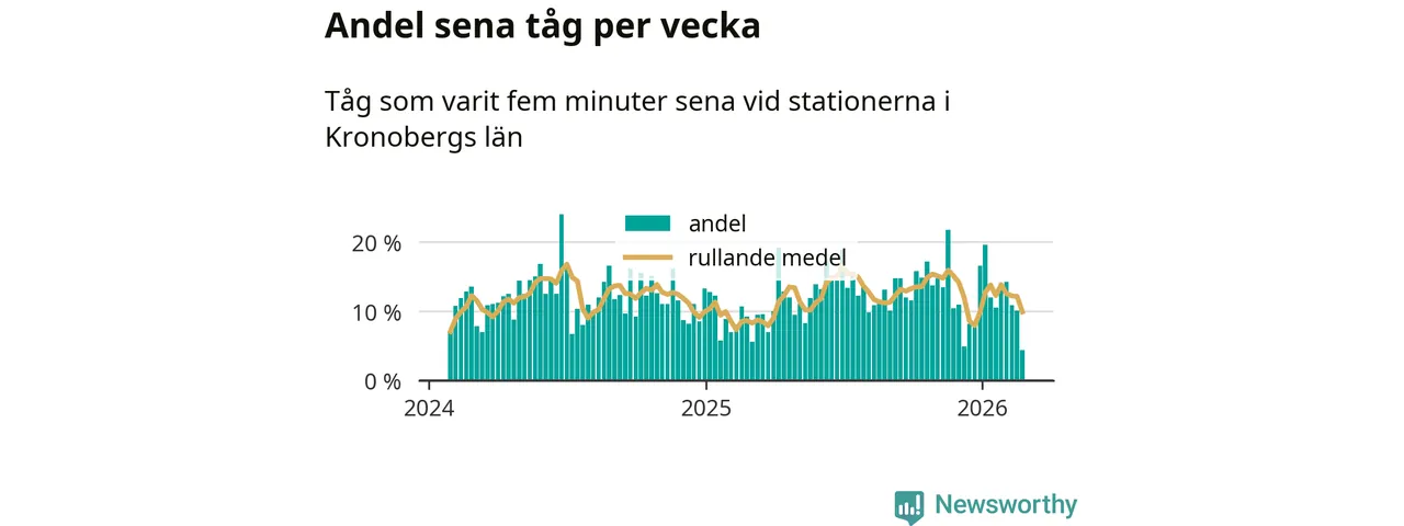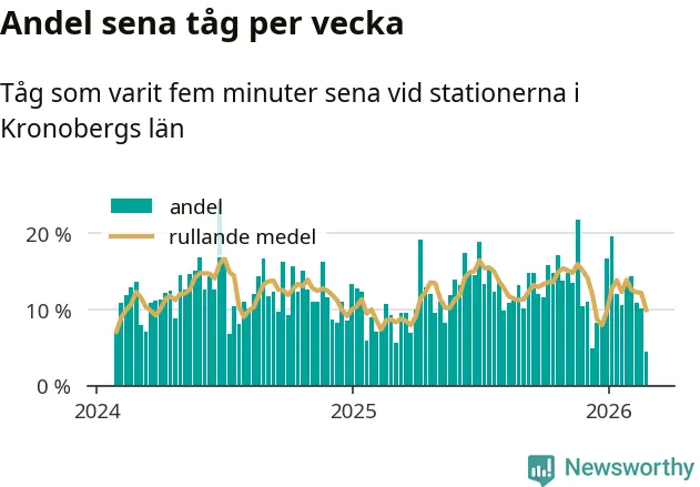 Bara fyra procent av tågen var sena när de passerade någon av de 11 stationerna i Kronoberg under vecka 9. Det är en ovanligt låg siffra. En genomsnittlig vecka är motsvarande siffra tolv procent,