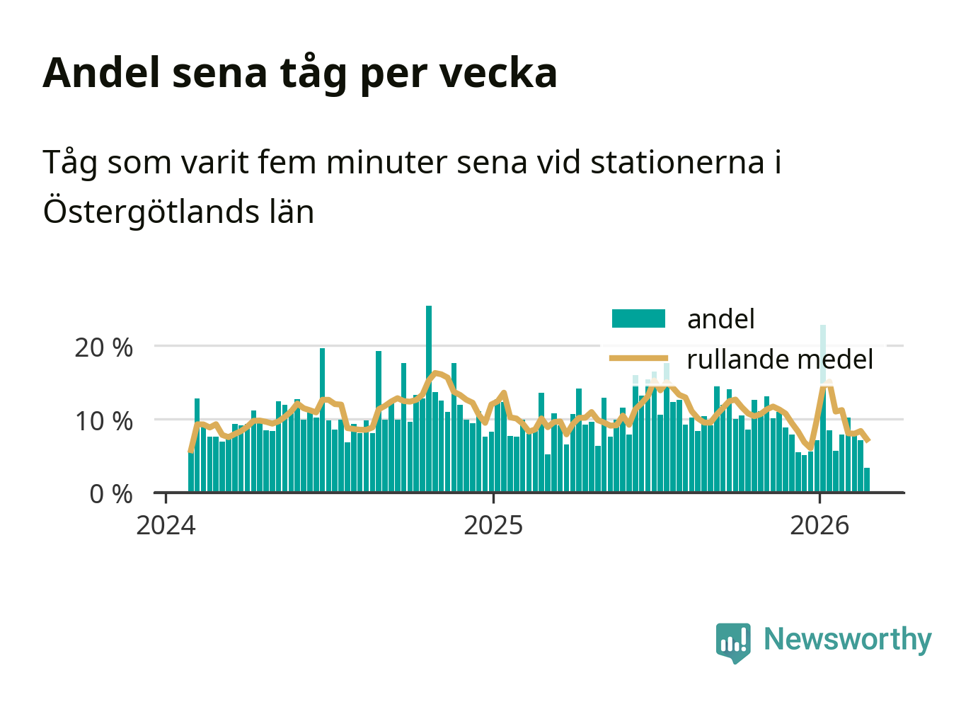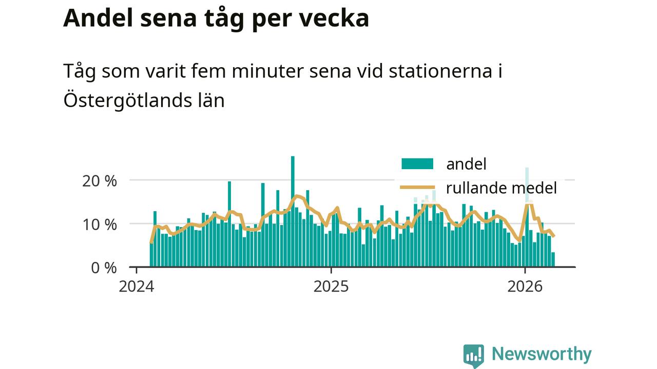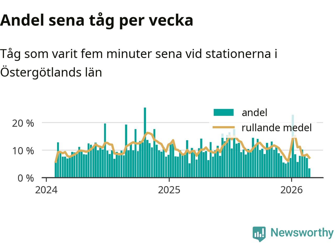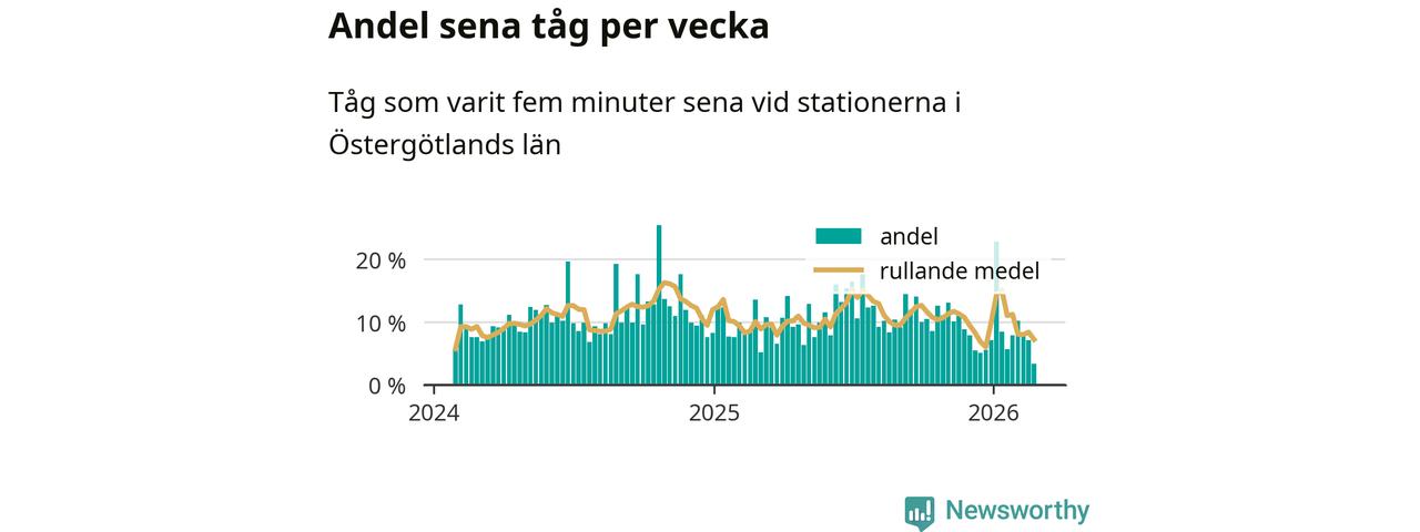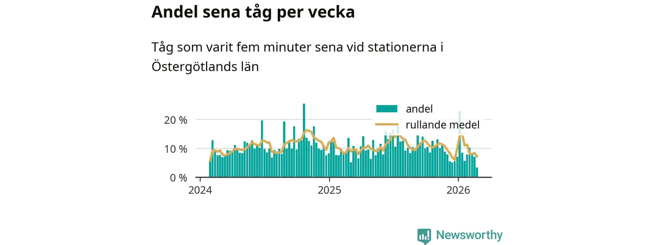 Bara tre procent av tågen var sena när de passerade någon av de 17 stationerna i Östergötland under vecka 9. Det är en ovanligt låg siffra. En genomsnittlig vecka är motsvarande siffra elva procent, baserat på data som Newsworthy har samlat in sedan början av 2024.