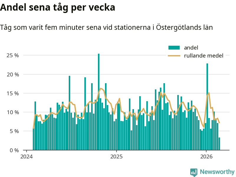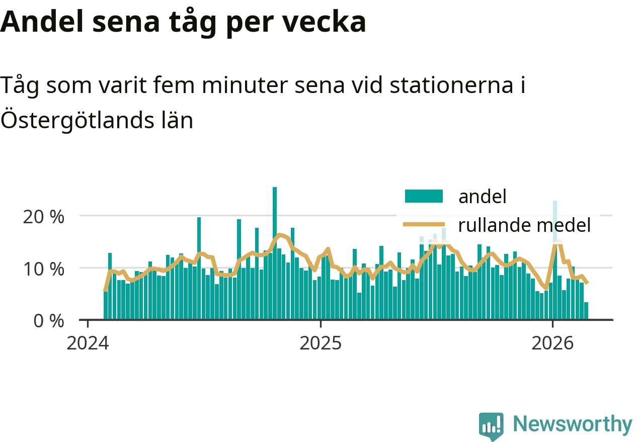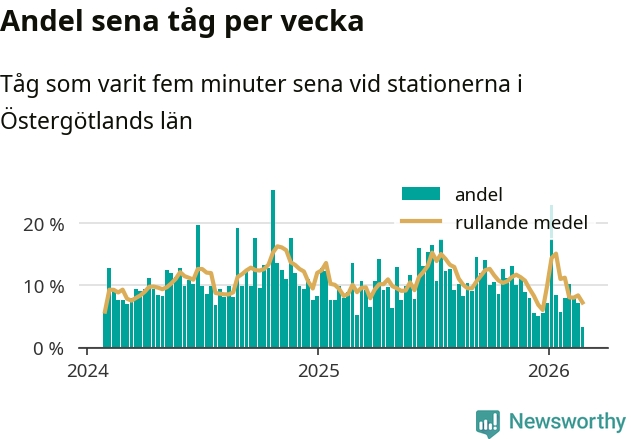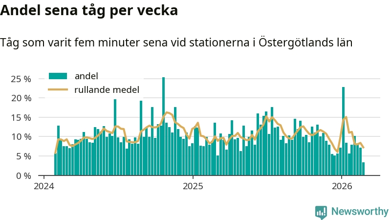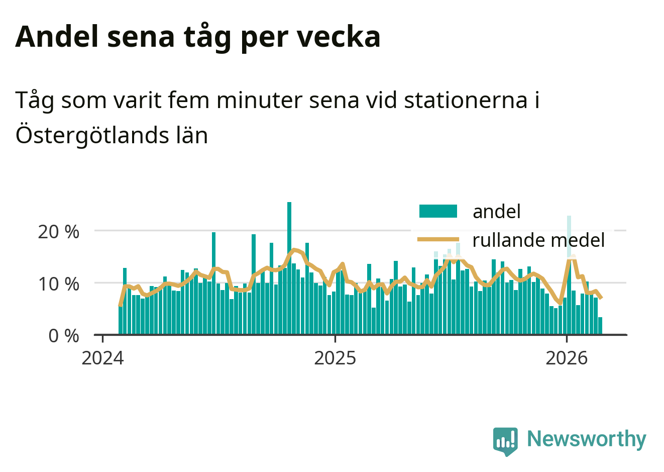 Bara tre procent av tågen var sena när de passerade någon av de 17 stationerna i Östergötland under vecka 9. Det är en ovanligt låg siffra. En genomsnittlig vecka är motsvarande siffra elva procent, baserat på data som Newsworthy har samlat in sedan början av 2024.