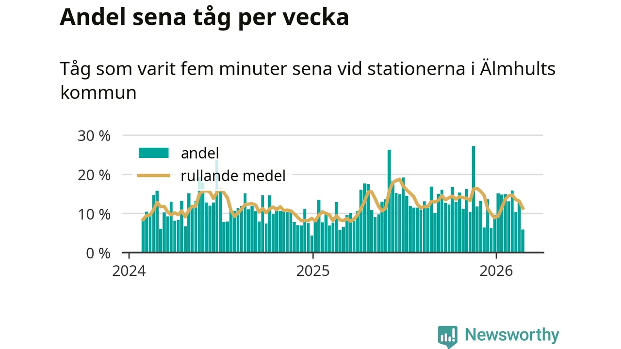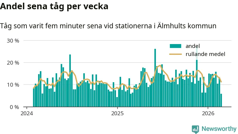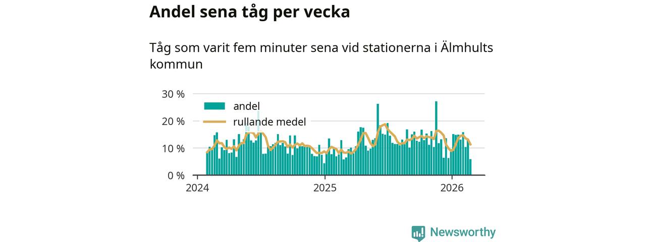 Förra veckan var andelen sena tåg den lägsta vid Älmhult och Diö sedan slutet av februari 2025. Bara sex procent av tågen var sena.