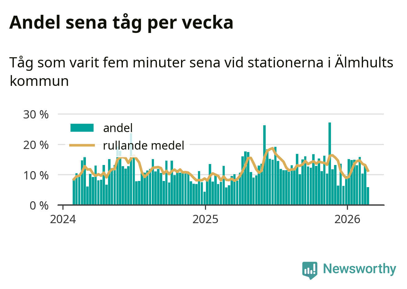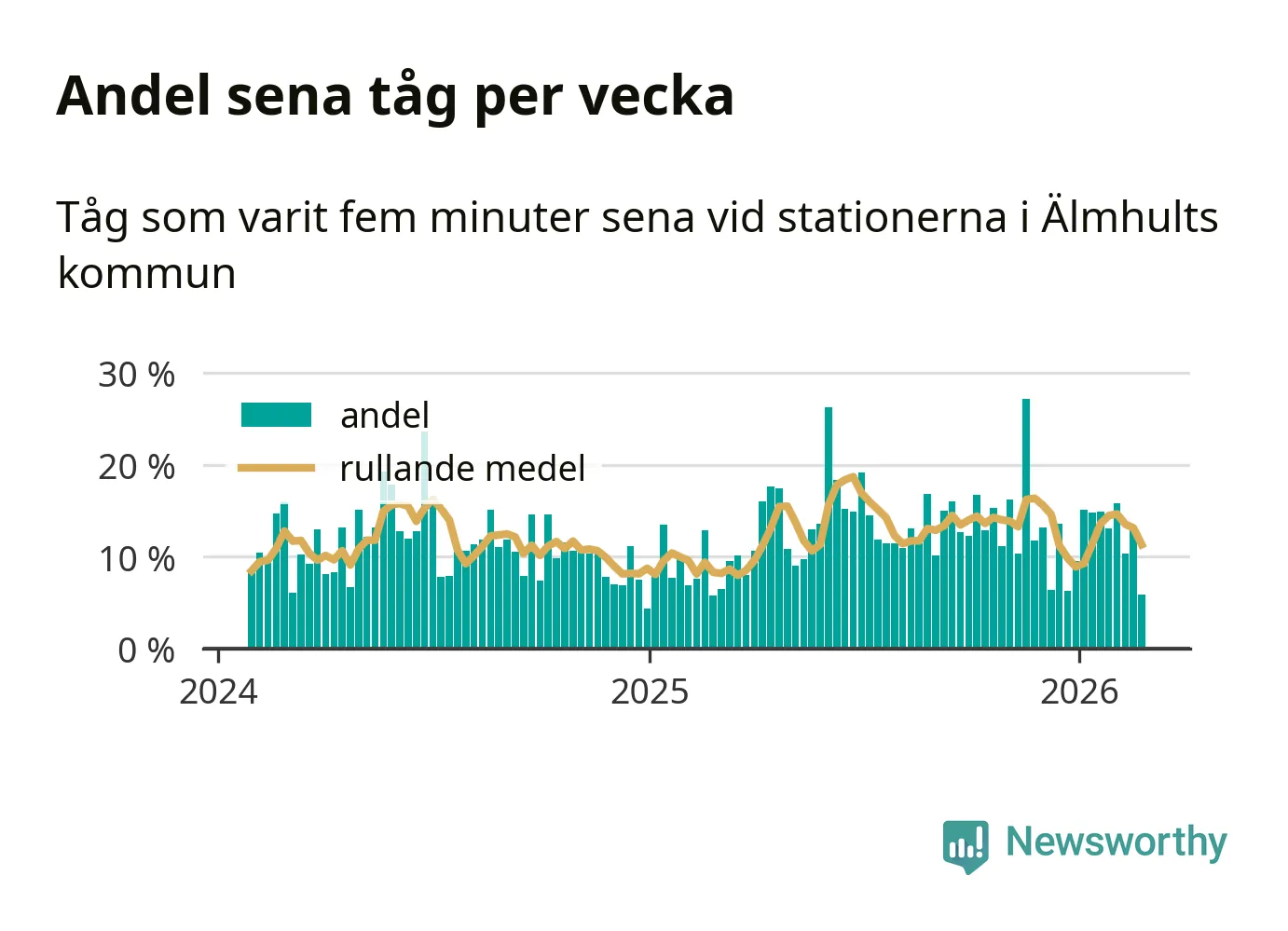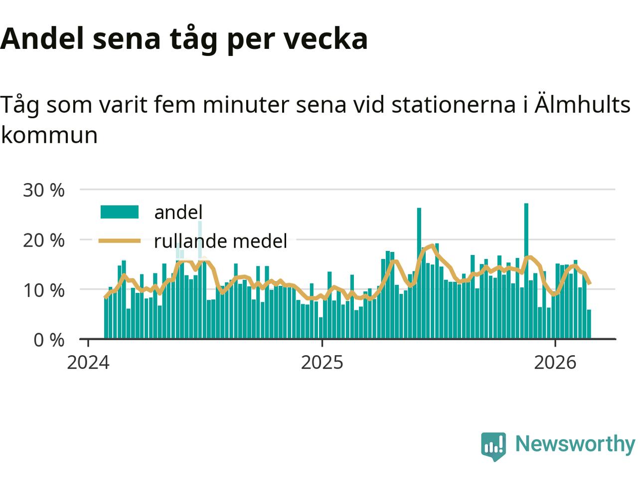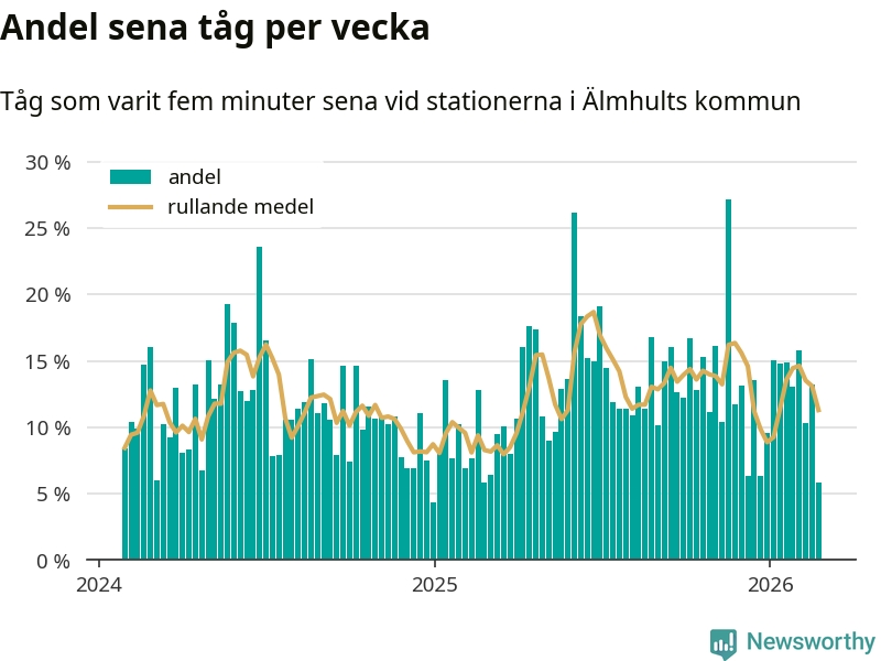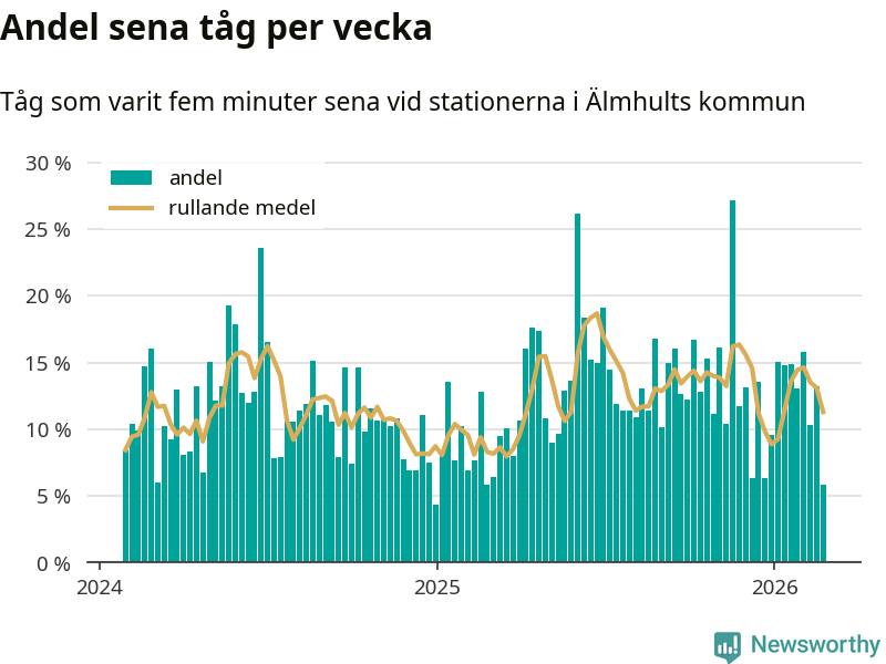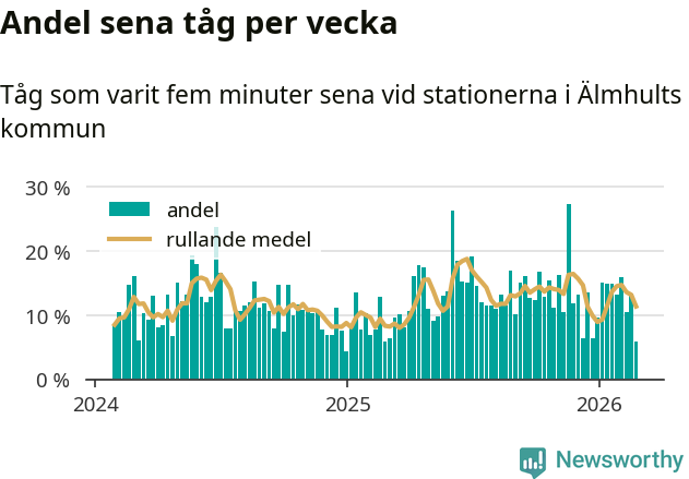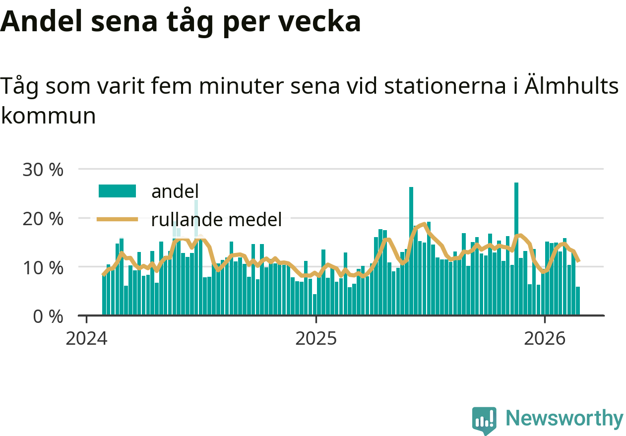 har andelen sena tåg varit 13 procent.