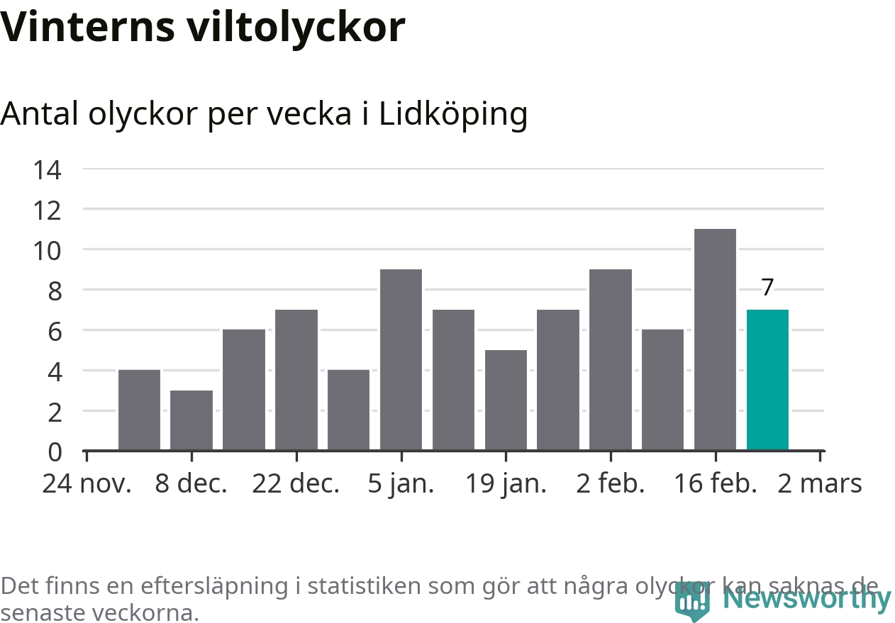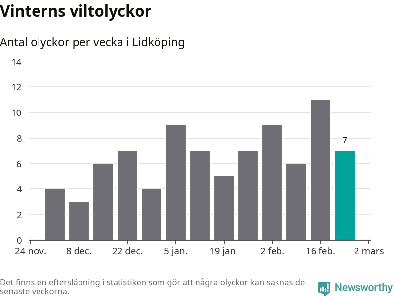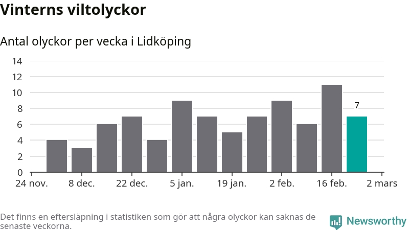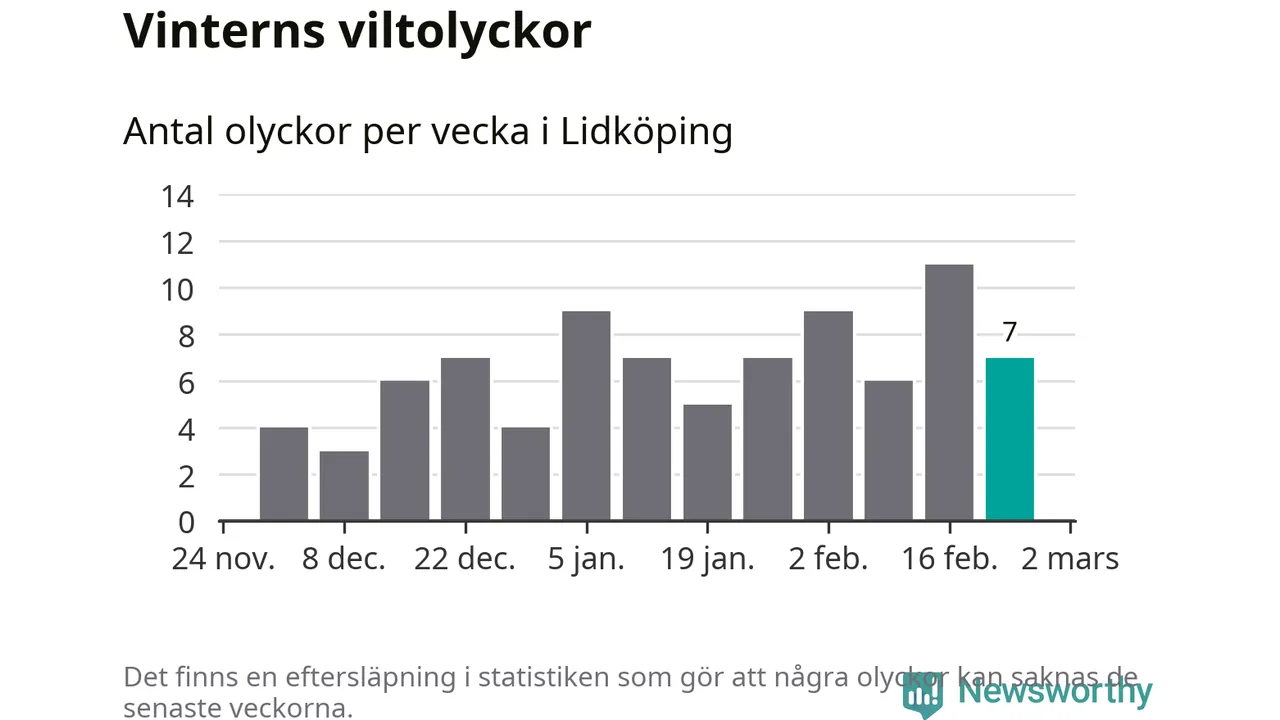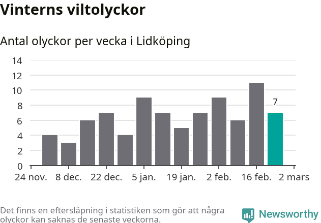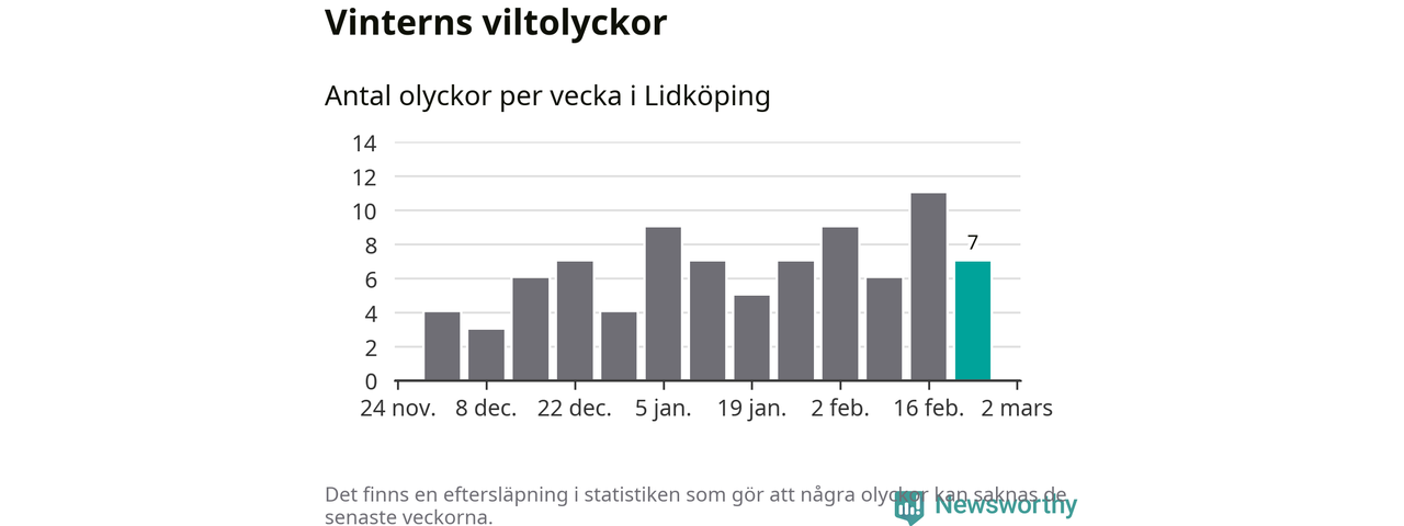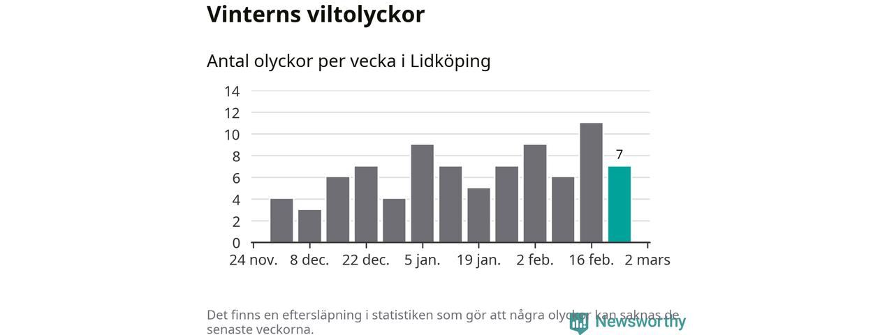 Under vecka 9 rapporterades sju viltolyckor in i Lidköpings kommun. Därmed har det inträffat mer än 50 procent fler viltolyckor den här vintern, än det brukar göra en hel genomsnittlig vinter.