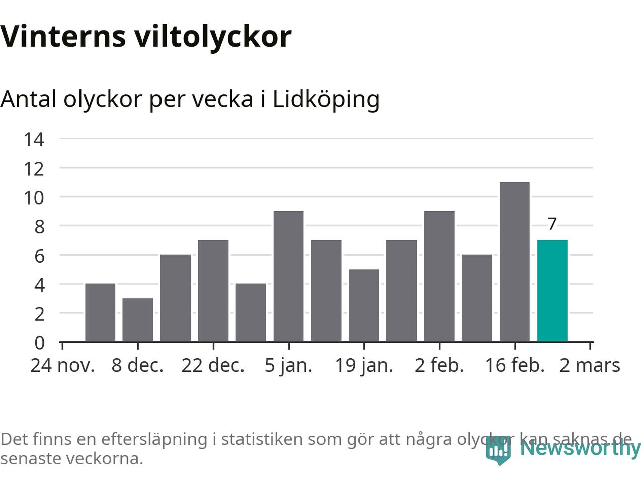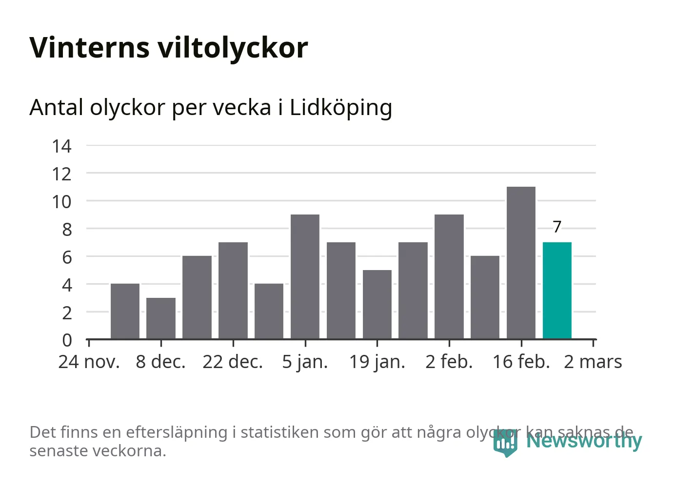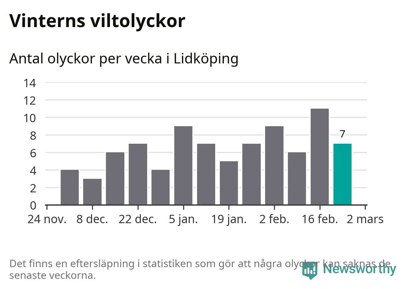Under vecka 9 rapporterades sju viltolyckor in i Lidköpings kommun. Därmed har det inträffat mer än 50 procent fler viltolyckor den här vintern, än det brukar göra en hel genomsnittlig vinter.